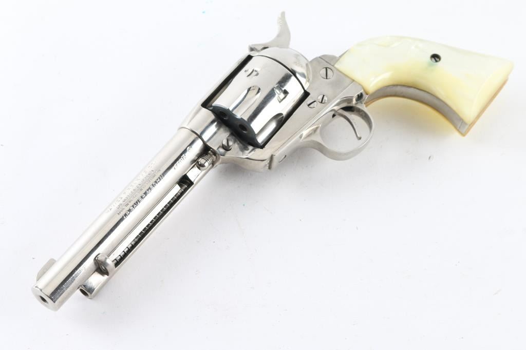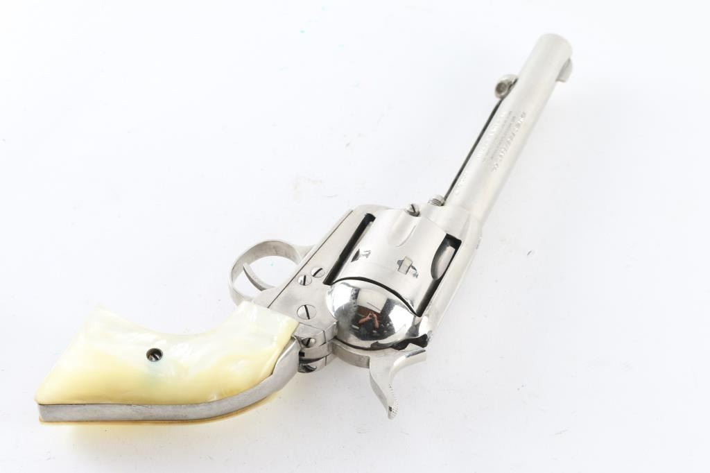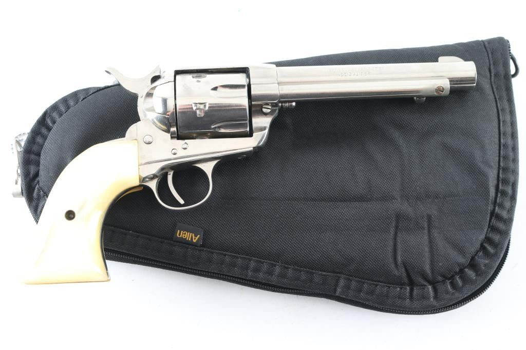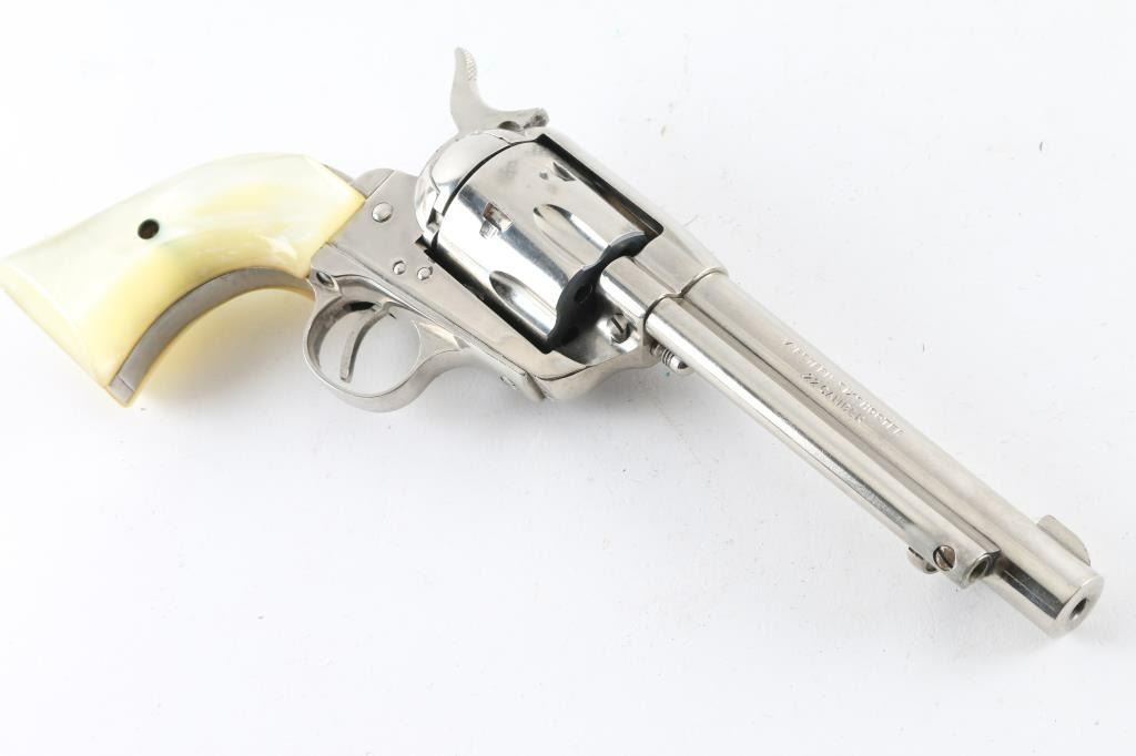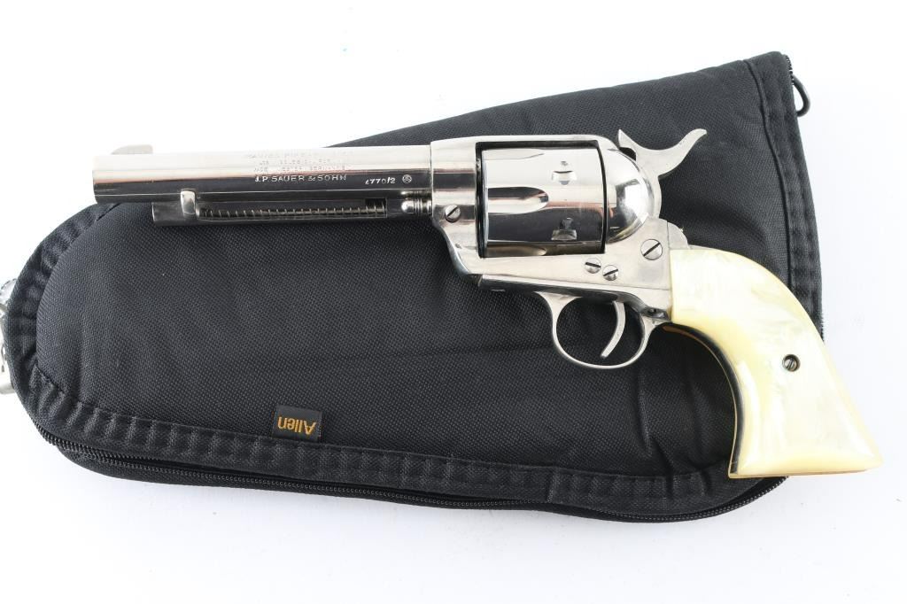 SN:4770/2 Made in Germany for Hawes this is a SA, 6 shot revolver chambered for .22 caliber ammunition. It features a 5.5" nickel plated barrel, frame and fluted cylinder to match. It has a small blade front sight, integral rear sight and serrated hammer spur. Two piece grips have a pearlescent look. Metal finish needs cleaned from being stored and should clean up nicely. There is a spot of flaking finish just in front of the hammer and on the cylinder. Grips are fine. Bore looks great, bright. Comes with a soft case. Condition is NRA Very Good *Modern Firearm*