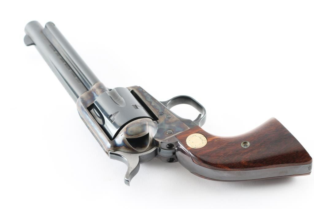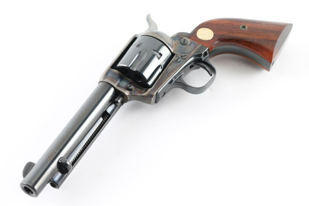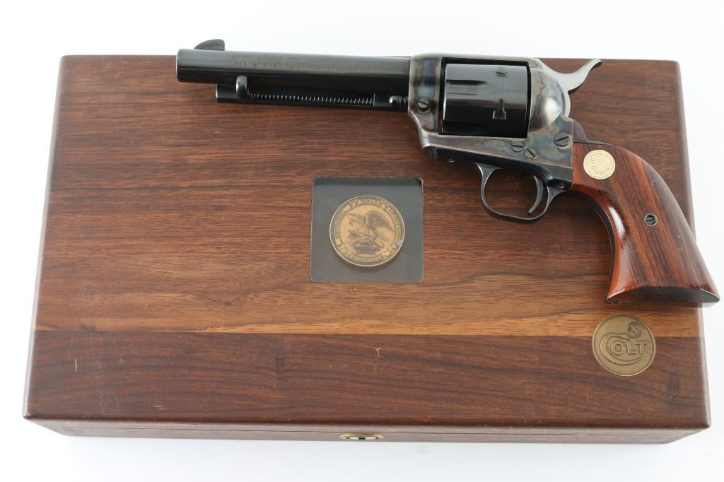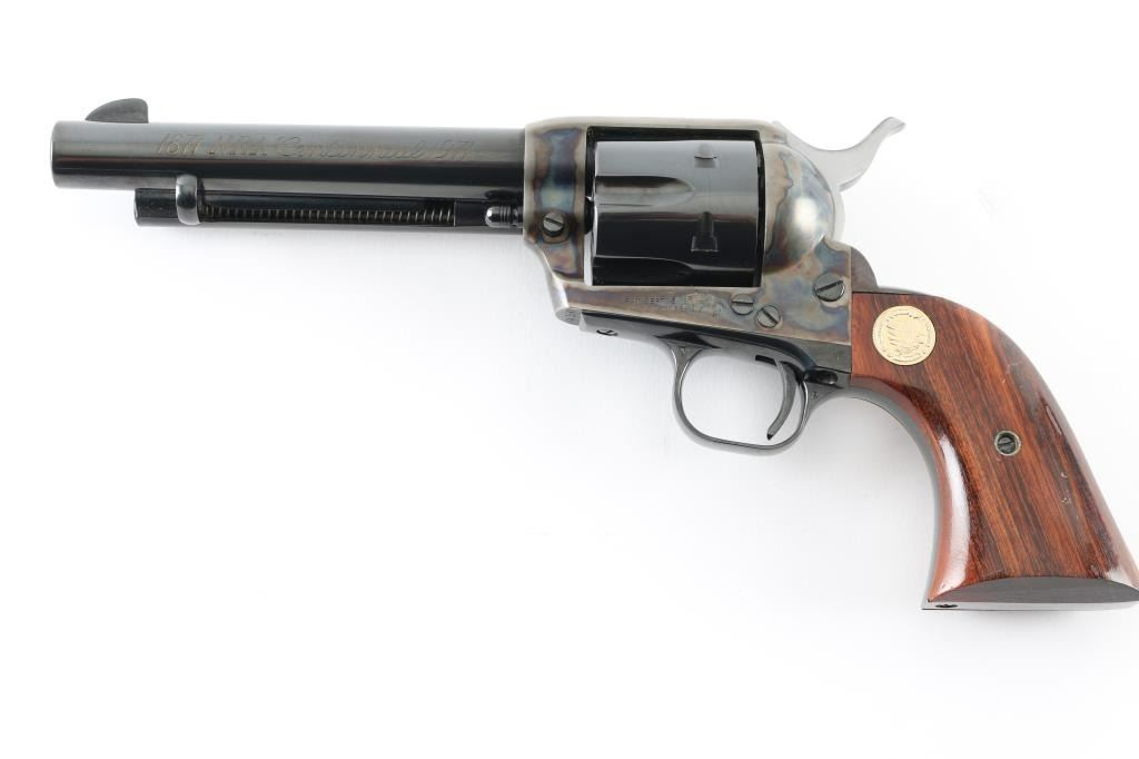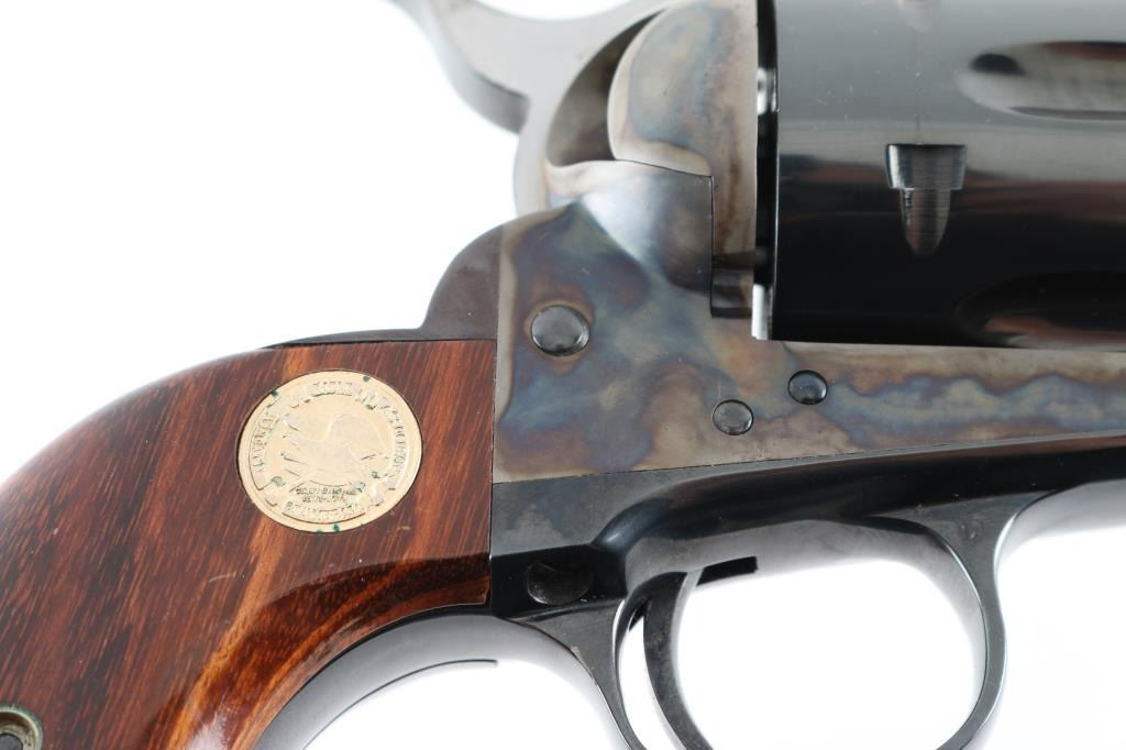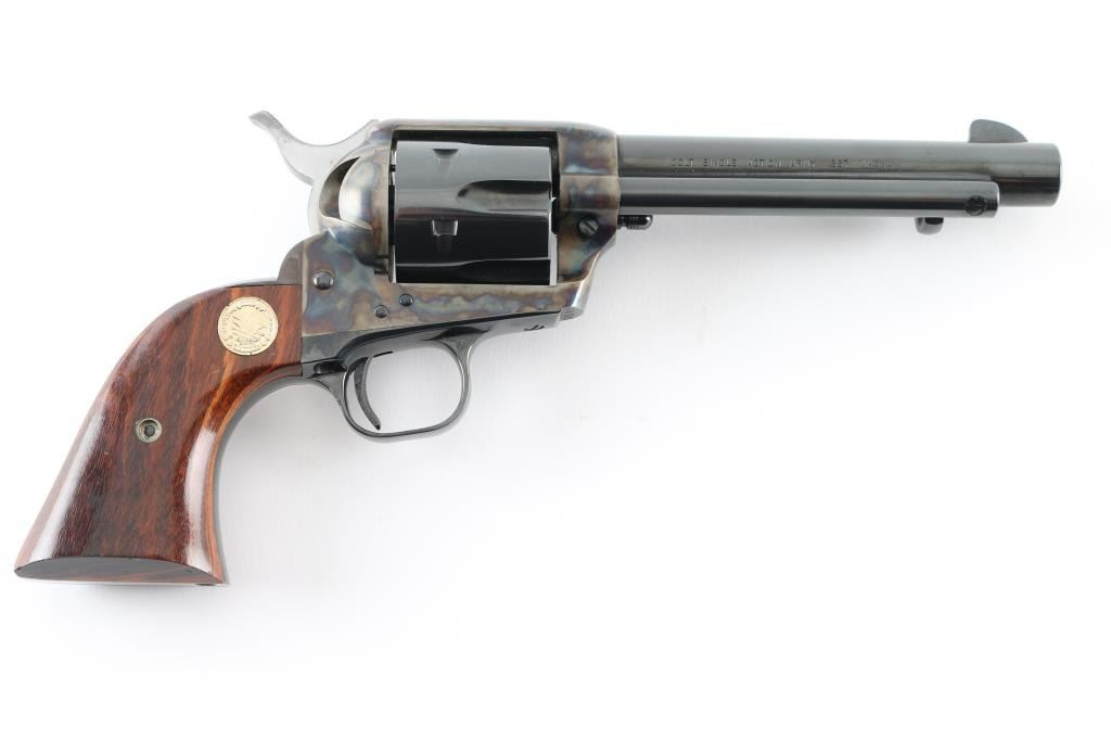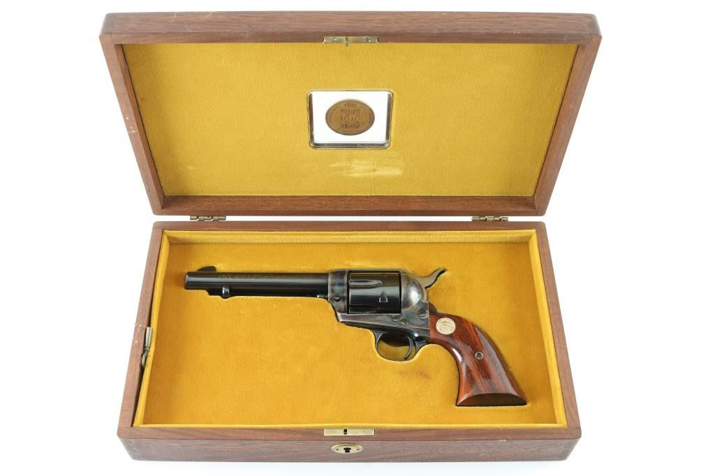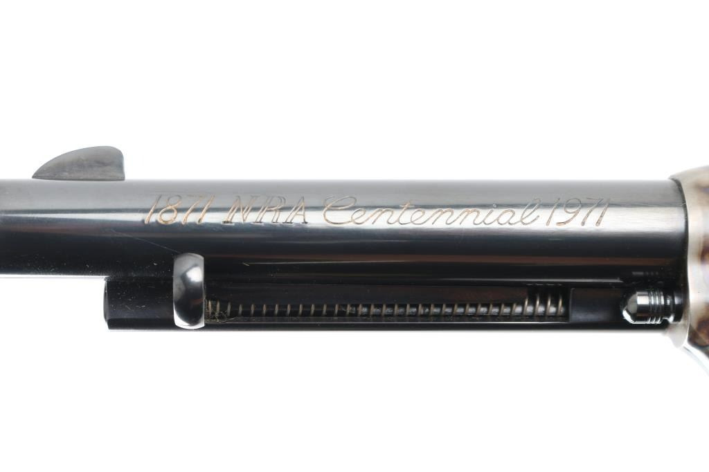 'NRA Centennial' single action revolver manufactured circa 1971. Features 5.5" barrel, blued finish with color case hardened receiver & loading gate, two piece wood stocks with inlaid gold color coin medallions bearing the NRA Centennial version logo, engraved on left side of barrel "1871 NRA Centennial 1971" (some gold ink fill remains), and special serial number range. Bore is very good condition. Retains 98% finish, with light edge wear, thin drag line on cylinder. Case colors are very good, fiery and bright. Wood is very good condition. Action is smooth with tight lock-up. Includes locking walnut display case with small clear window holding a commemorative NRA coin in lid. Case is fitted, mustard yellow color velvet lined, and includes key. Condition is NRA Excellent *** C&R Firearm ***