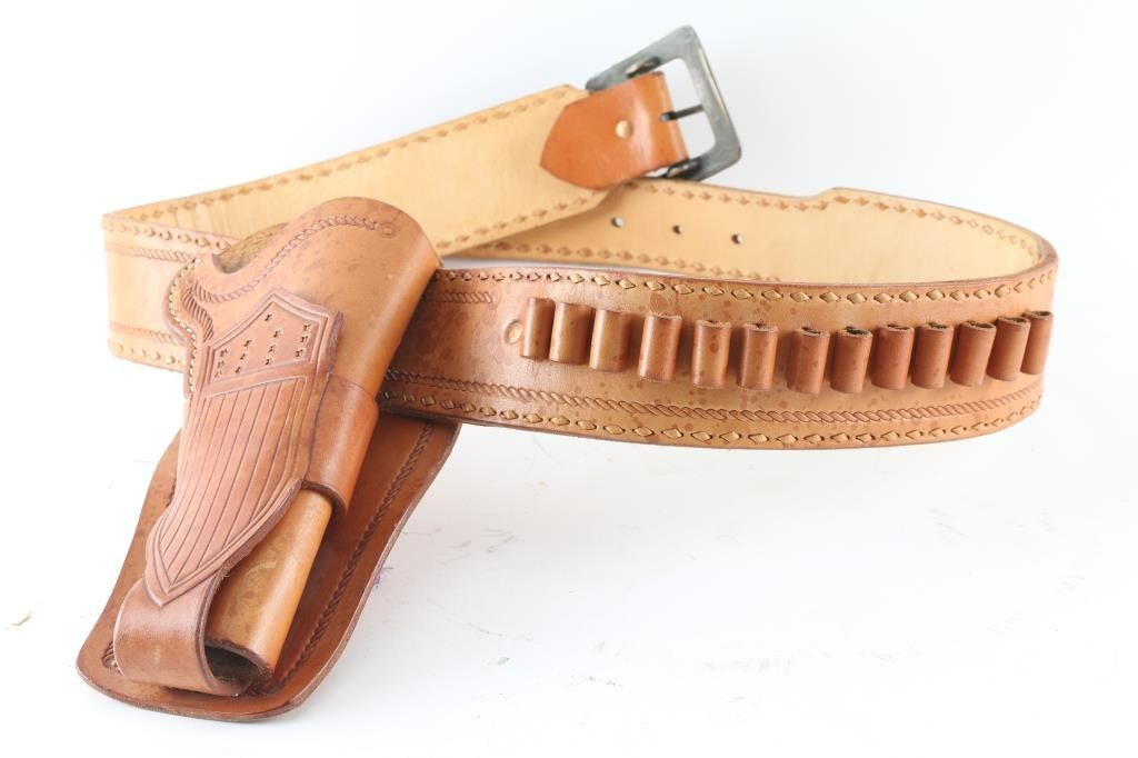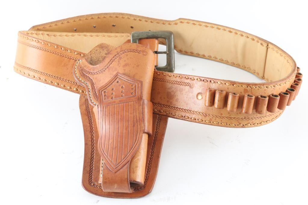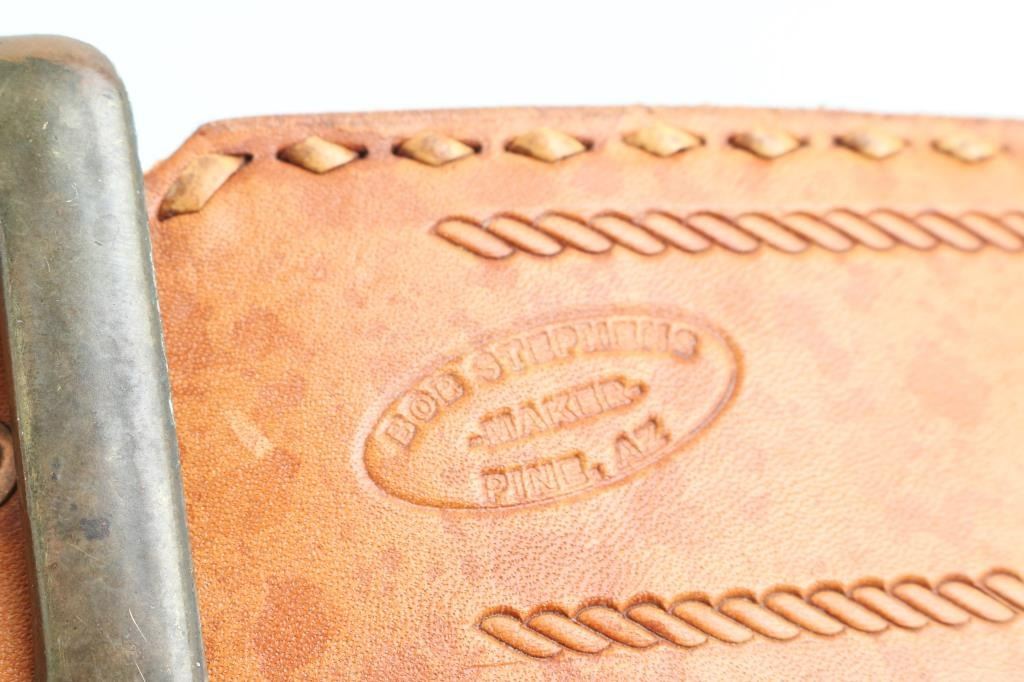 Carved and studded leather for 45 cal Colt SAA (or similar revolver, with approx 4-3/4" barrel),, with bullet loops and brass buckle with American 13 star flag on side of holster. Marked near buckle is stamped "Bob Stephens Pine AZ" also in good to very good condition with great quality leather, measuring 43" in length. Some of his work has been in the Phippen Museum.
