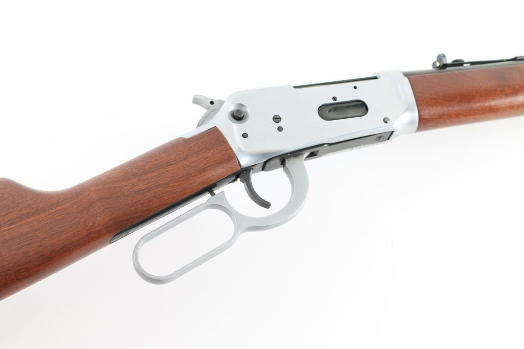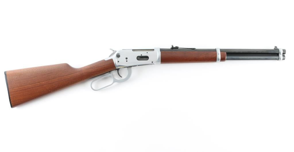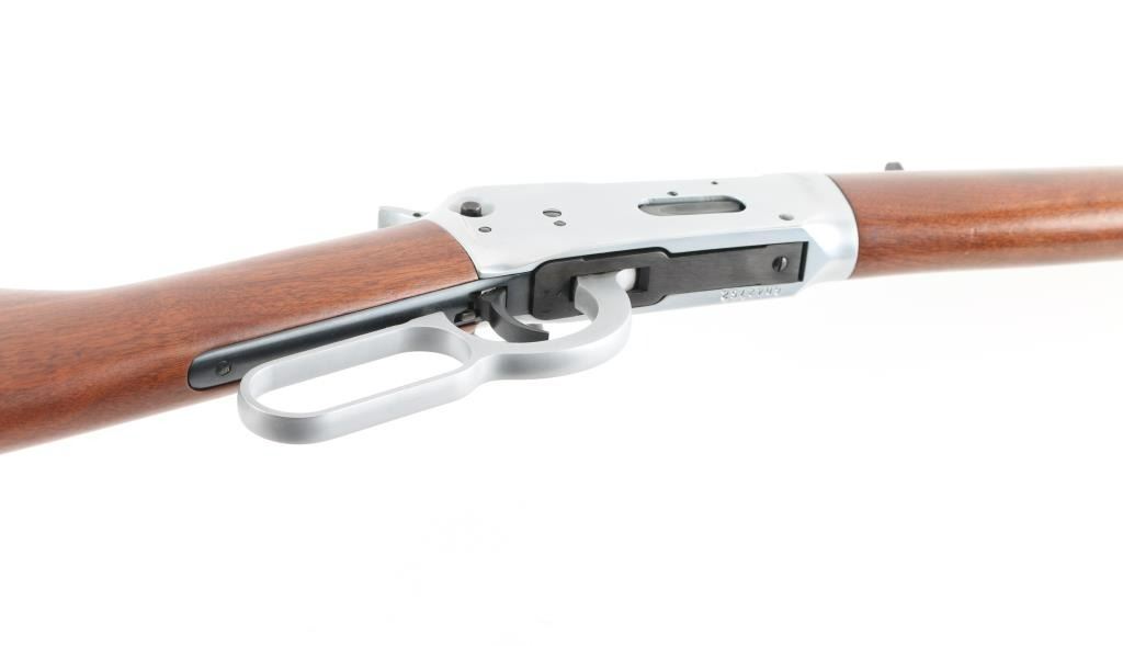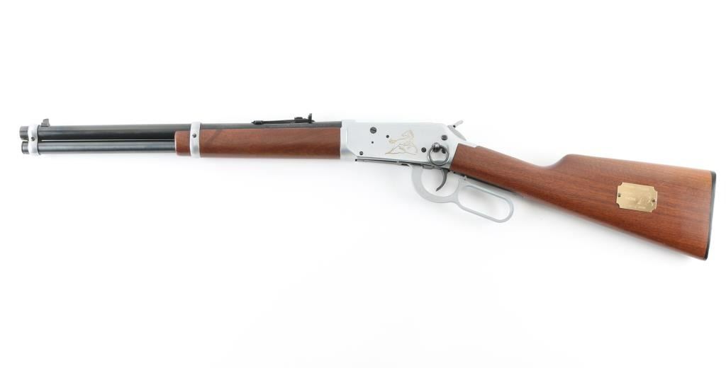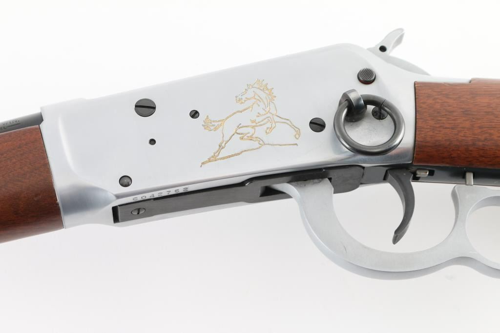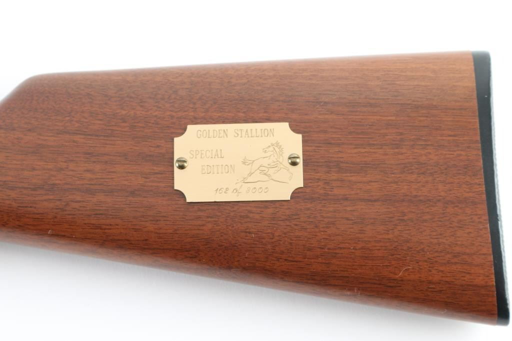 SN: 6042752 Commemorative, Roy Roger Jr signed, #162 of 8000. 'Trapper' length Saddle Ring Carbine (SRC) lever action rifle. Features 16" barrel, full length magazine tube, blade front sight, sporting rear sight, saddle ring on left side of receiver, push button cross bolt safety in receiver, smooth wood forend & straight gripped shoulder stock, Winchester black plastic buttplate. Two tone finish. Blued barrel, mag tube, bolt, saddle ring, lower tang. Receiver, hammer, bands & lever are silver colored, appears to be brushed finish stainless steel. Left side of receiver has engraved & gold paint filled stallion. Left side of butt has brass plaque with matching stallion image, engraved "GOLDEN STALLION / SPECIAL EDITION / 162 of 8000". "Roy Rogers Jr" signature is engraved on barrel forward of rear sight, appears stylus pantograph engraved right on top of the finish, showing bare metal in cut. Bore is very good condition. Retains 98% finish with minor handling marks. Walnut stocks are near excellent. Single dent to brass plaque on butt. Not much information is out there for this commemorative, probably made circa 1992, in a unique and interesting configuration. Condition is near NRA Excellent *** Modern Firearm ***