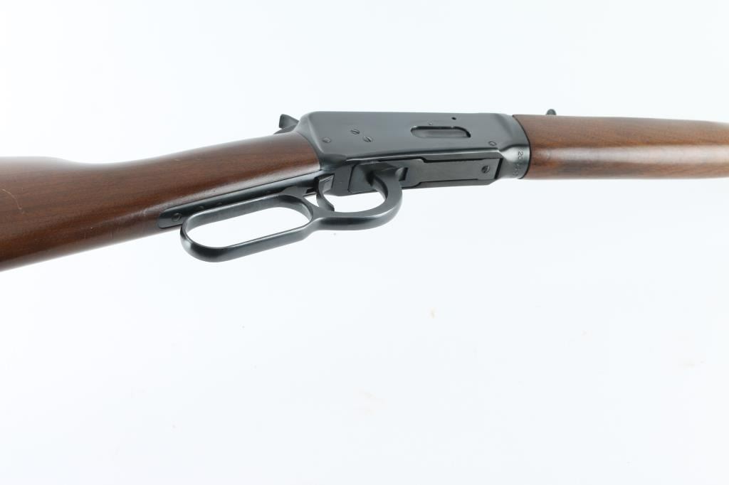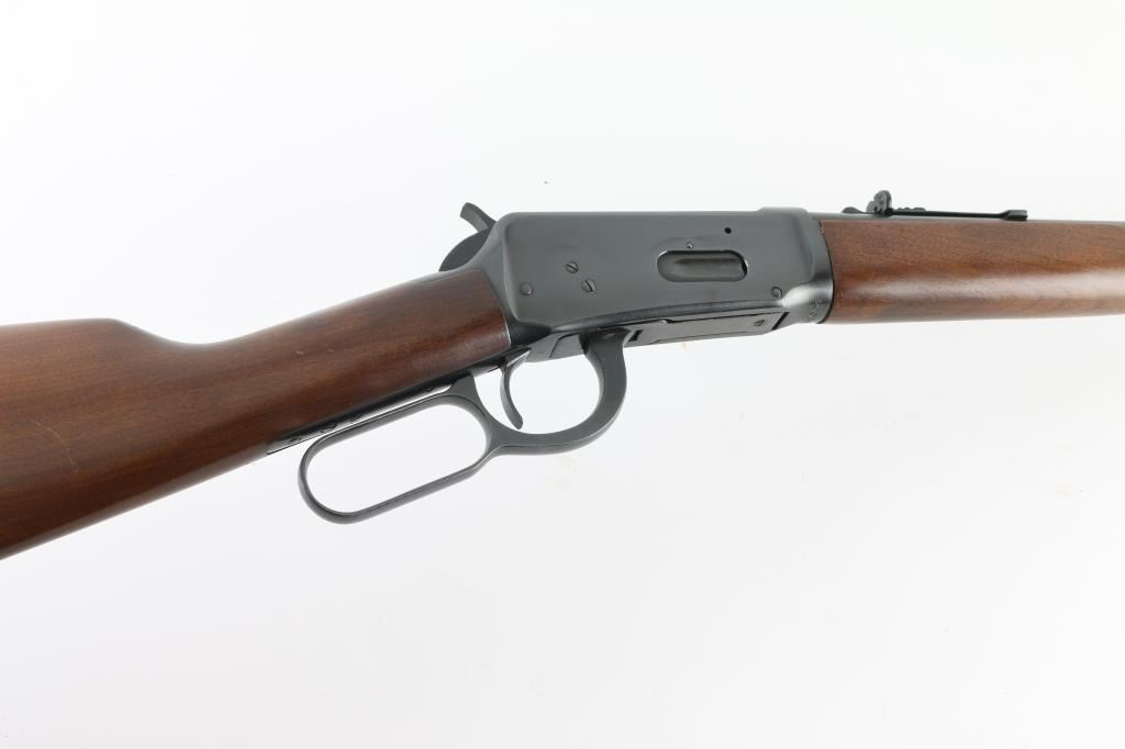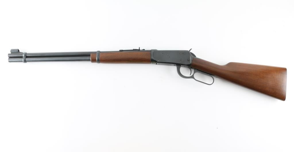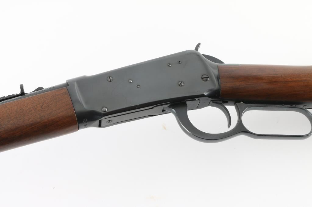 Lever action repeating rifle chambered in .30-30 Winchester. Features a blued finish, 20" barrel, full-length tube magazine, ramped blade front sight with hood, adjustable rear sporting sight, smooth trigger, serrated hammer spur, steel receiver, smooth walnut forend and straight grip shoulder stock with knurled metal buttplate. Bore is very good condition. Retains 95% finish with handling marks, several visible scratches to receiver. Wood is very good condition with few blemishes, small gouges at side of butt and at toe. Markings are crisp. Condition is near NRA Excellent *** Modern Firearm ***