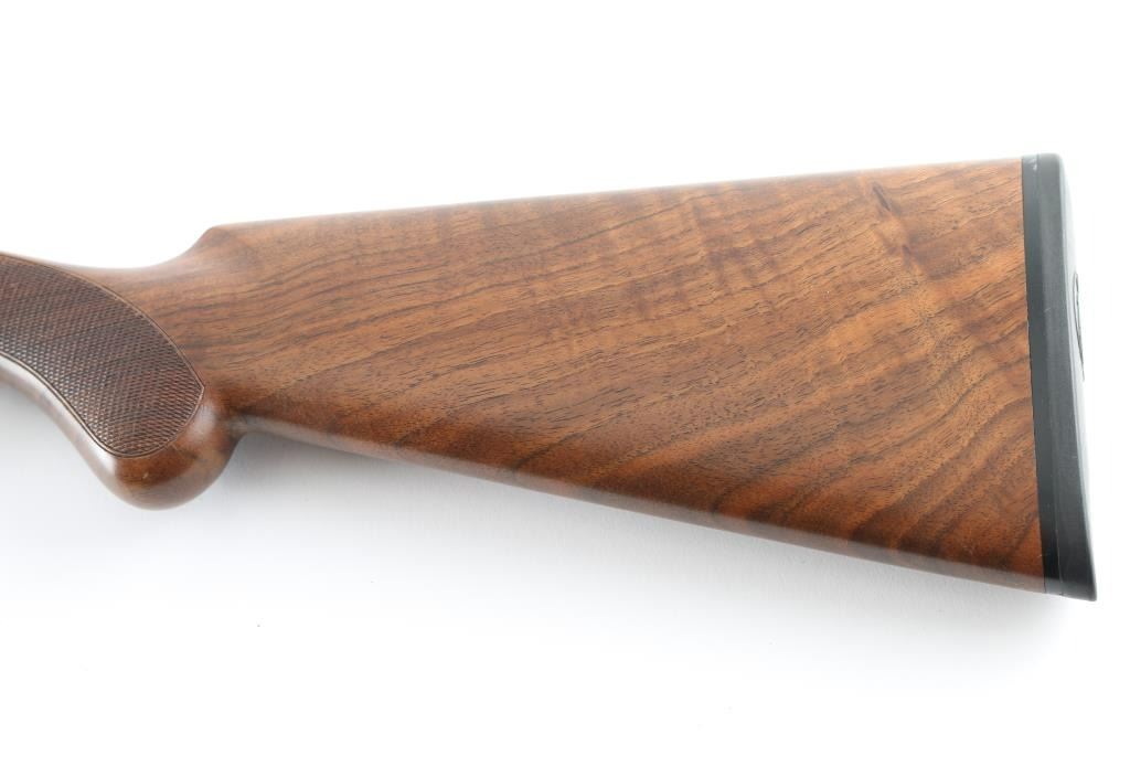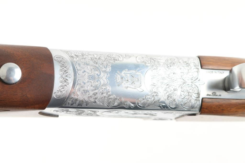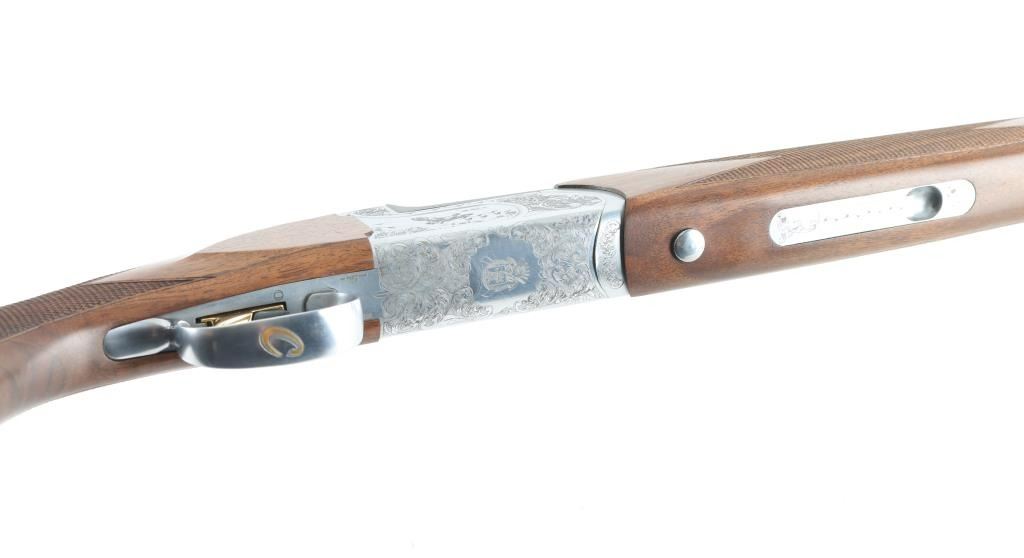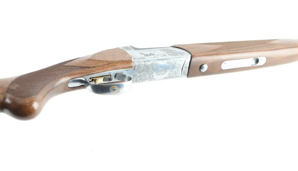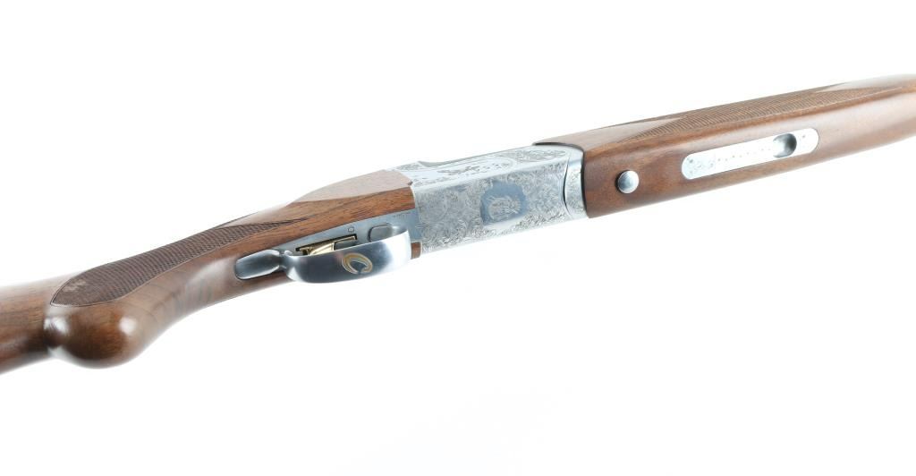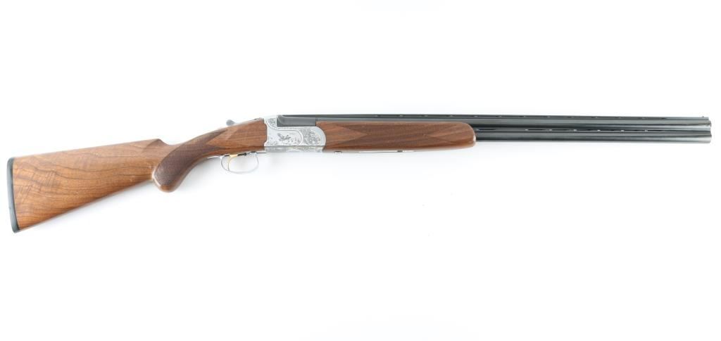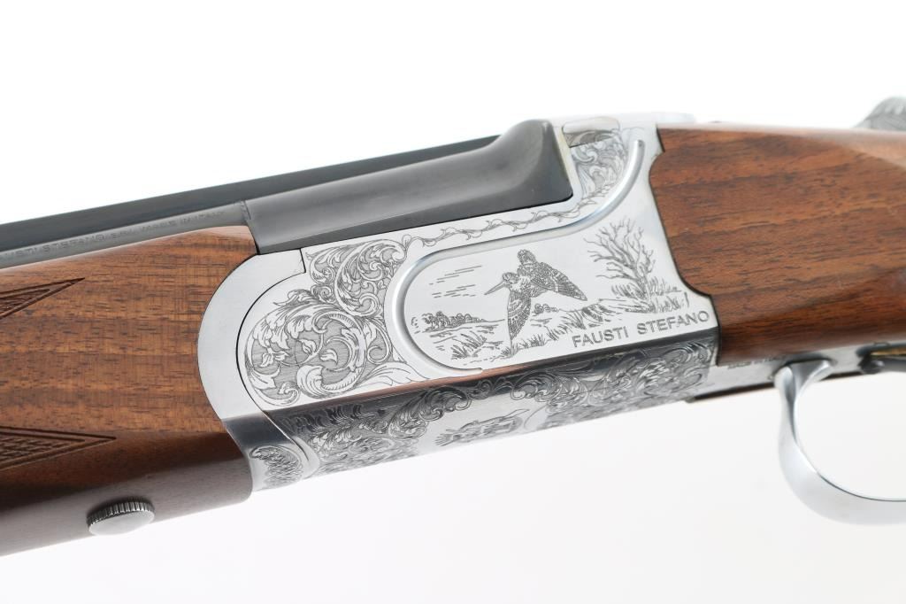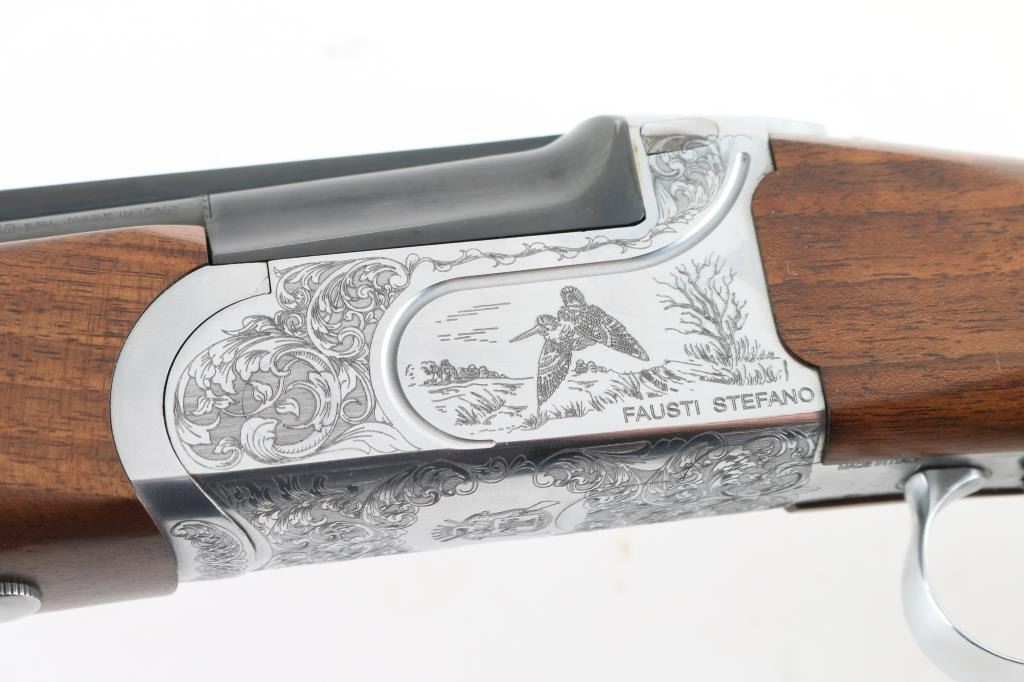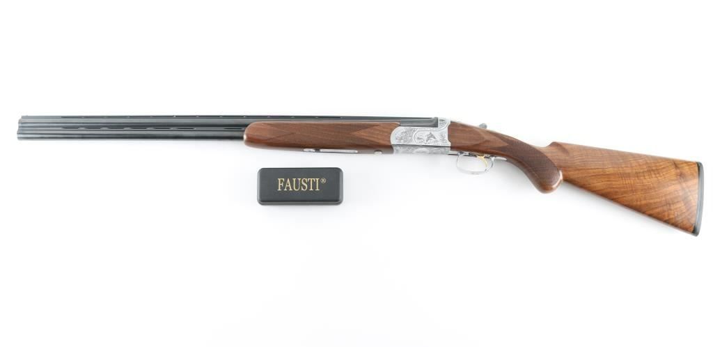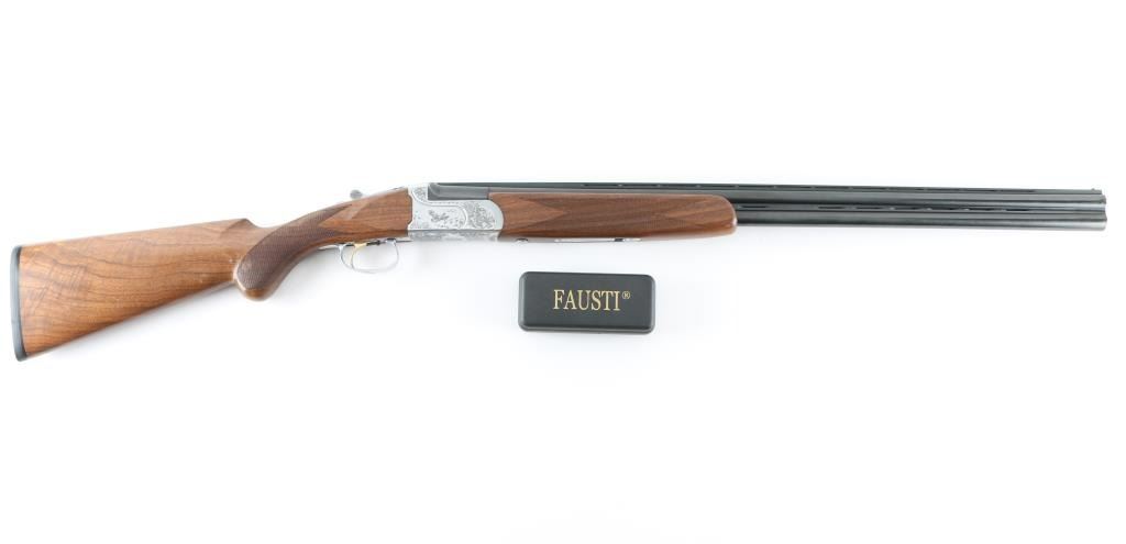 Italian made over / under double barrel shotgun by Fausti Stefano. Features 28" blued vent rib barrels, accepts screw-in chokes (SKT/FULL installed) take up to 3" shells, brass bead front sight, tang safety, gold accented single trigger with selector lever, bright silver colored receiver, solid rubber recoil pad, checkered panels at wrist and forend, curved "Prince of Wales" type grip with rounded knob. Receiver is engraved on sides with bird scenes surrounded by floral scrolls, Fausti coat of arms on bottom of receiver, matching scroll on top lever, border scroll on top tang. Bottom of trigger guard bow features a gold inlaid "C". Bores are very good. Retains 95% deep blue on barrels with minor edge losses and handling marks. Noticeable flat on side of barrel near muzzle, appears repaired or otherwise touched up ding or dent. Receiver is excellent condition. Gold color finish on trigger is very good. Highly figured walnut stocks are very good condition, fiddle grain visible at butt, has small dents and dings. Approx stock measurements: 14-1/4" Length of Pull, 1-1/2" drop at comb, 2-3/8" drop at heel. Includes choke tube wrench, M & IC tubes, in small factory plastic choke tube case. Condition is NRA Very Good+ *** Modern Firearm ***