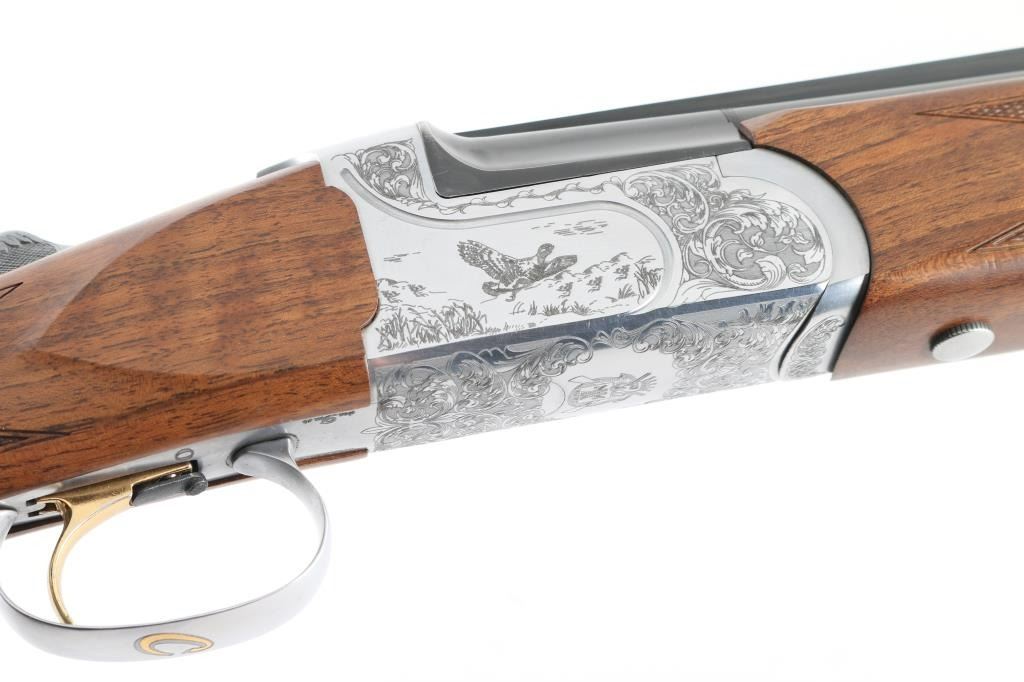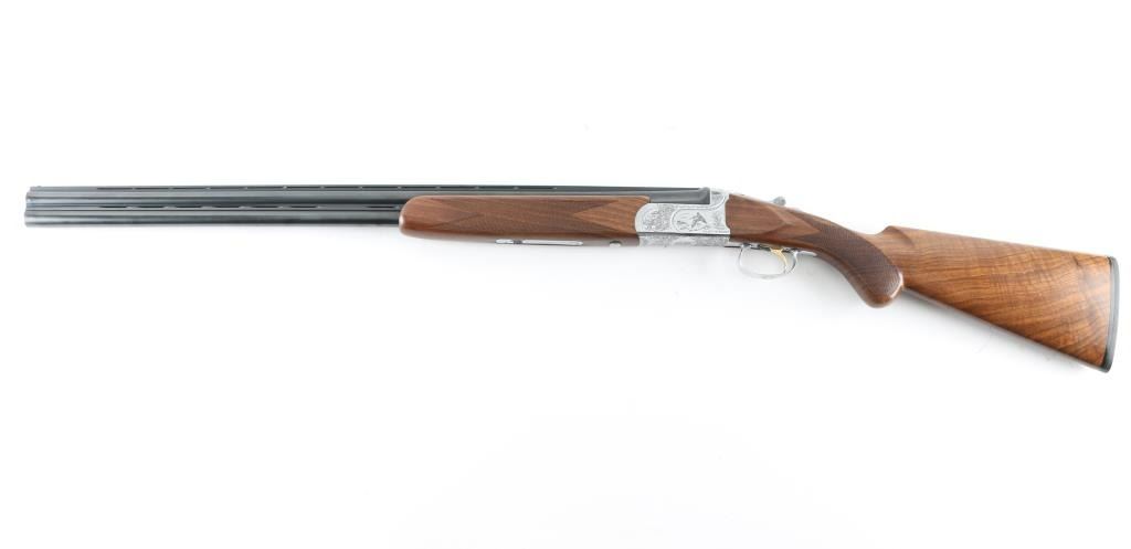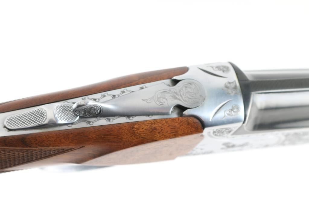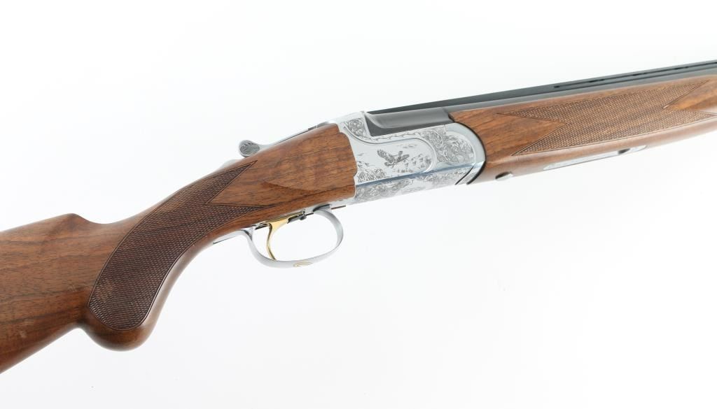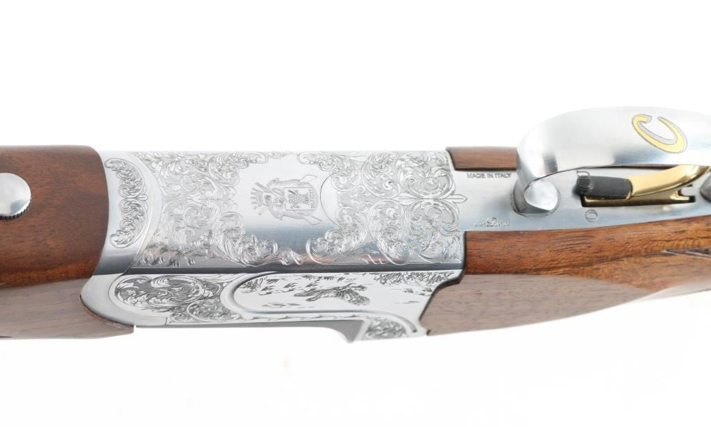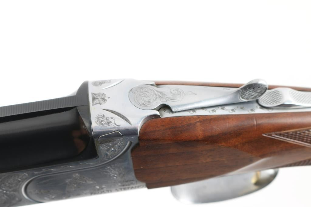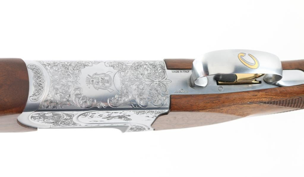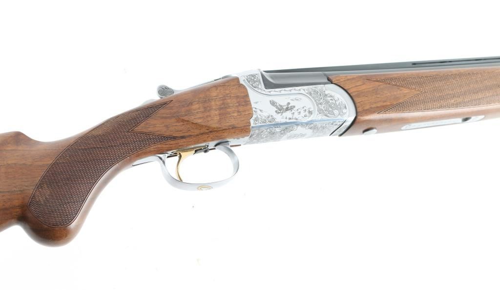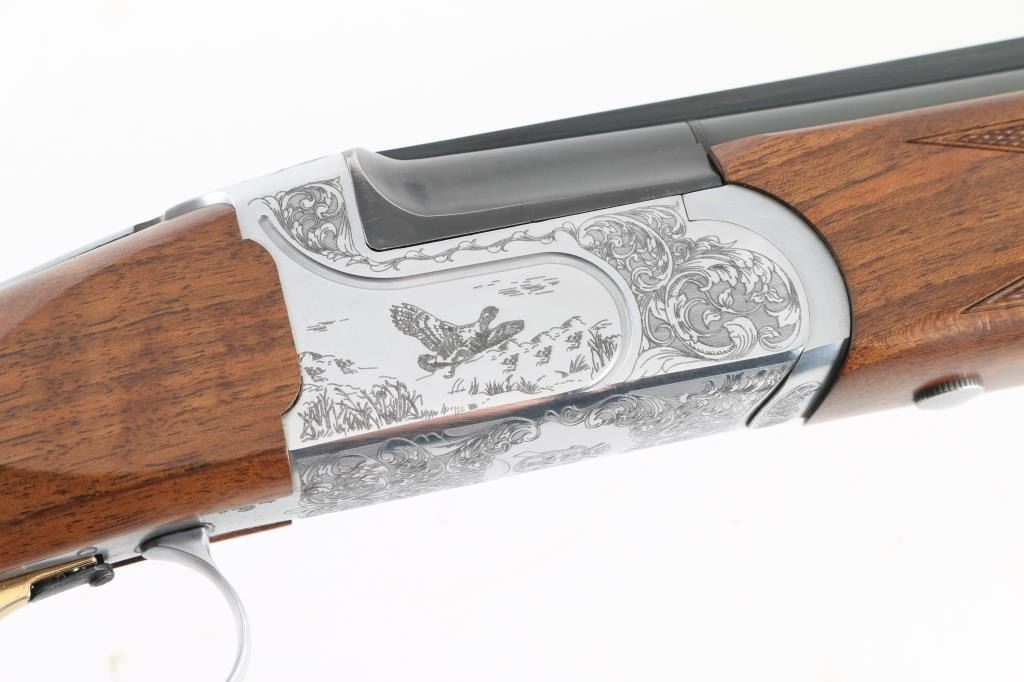 Italian made over / under double barrel shotgun by Fausti Stefano. Features 28" blued vent rib barrels, accepts screw-in chokes (SKT/FULL installed) take up to 3" shells, brass bead front sight, tang safety, gold accented single trigger with selector lever, bright silver colored receiver, solid rubber recoil pad, checkered panels at wrist and forend, curved "Prince of Wales" type grip with rounded knob. Receiver is engraved on sides with bird scenes surrounded by floral scrolls, Fausti coat of arms on bottom of receiver, matching scroll on top lever, border scroll on top tang. Bottom of trigger guard bow features a gold inlaid "C". Bores are very good. Retains 95% deep blue on barrels with minor edge losses and handling marks. Noticeable flat on side of barrel near muzzle, appears repaired or otherwise touched up ding or dent. Receiver is excellent condition. Gold color finish on trigger is very good. Highly figured walnut stocks are very good condition, fiddle grain visible at butt, has small dents and dings. Approx stock measurements: 14-1/4" Length of Pull, 1-1/2" drop at comb, 2-3/8" drop at heel. Includes choke tube wrench, M & IC tubes, in small factory plastic choke tube case. Condition is NRA Very Good+ *** Modern Firearm ***