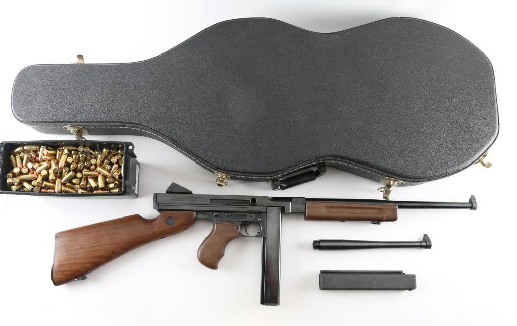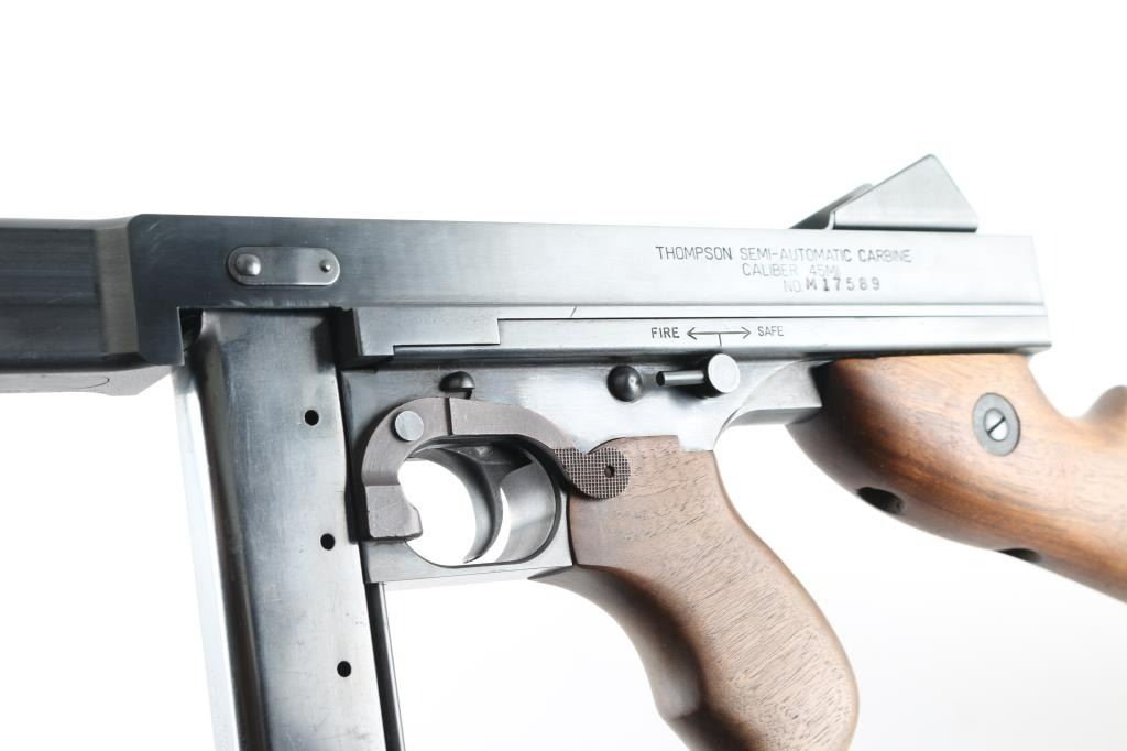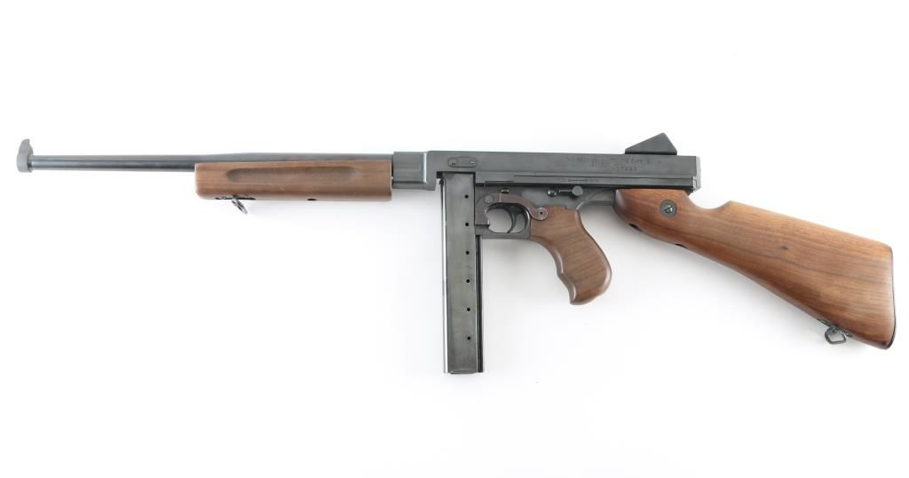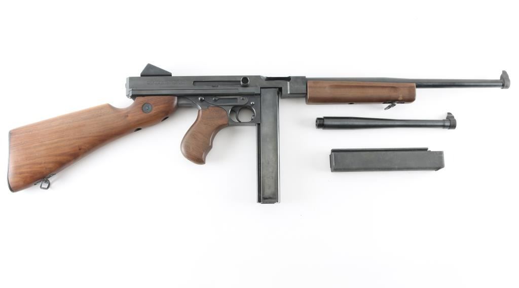 Semiautomatic rifle with close resemblance to the M1 sub machinegun. Features blued finish, smooth walnut furniture (horizontal forend with grasping grooves, finger grooved pistol grip, butt stock with smooth steel butt plate), manual safety, 16" plain barrel with blade front sight, fixed rear sight, side mounted charging handle, sling swivels. Bore is very good condition. Retains 90% finish with few minor blemishes. Missing one mount screw from rear sight. Wood is very good with small scrape to forend, several small dents. Includes (2) 30-rd magazines, an additional 10.5" barrel, a "violin" style latching carry case and a ammo can with 500 rounds of remanufactured .45 ACP. Condition is near NRA Excellent *** Modern Firearm ***