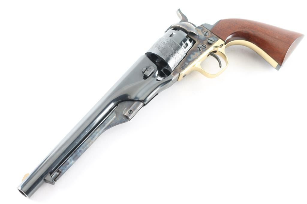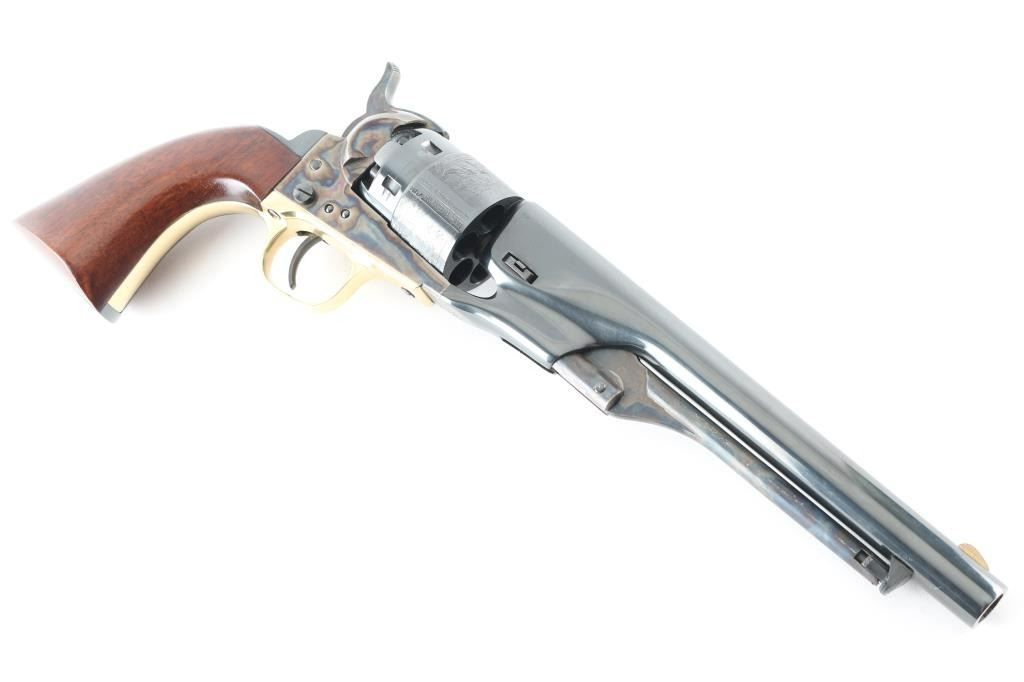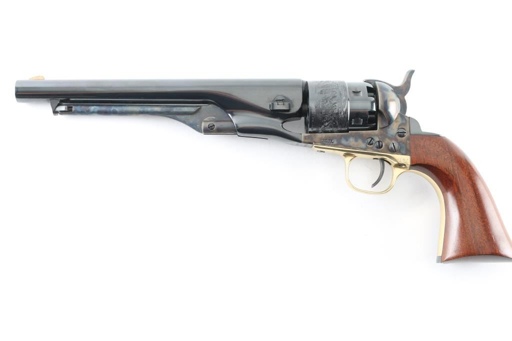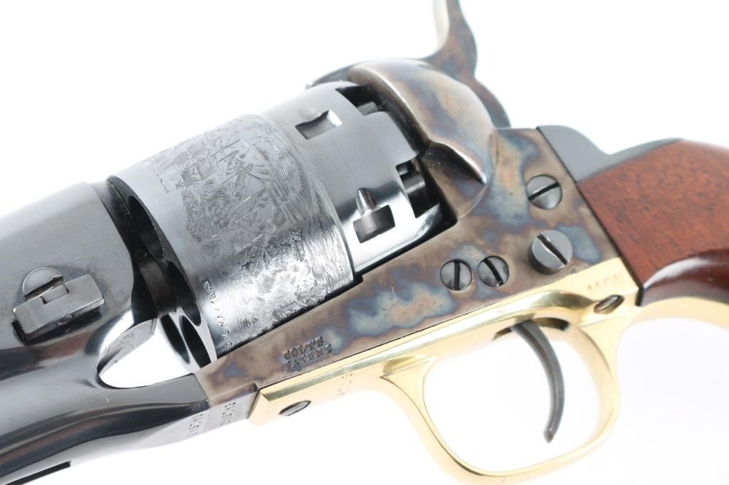 The Authentic Colt Blackpowder "Signature Series' Single action percussion revolver. 3rd generation (1988-2002) Features a blued & case hardened finish, 8" round barrel, brass blade front sight, 'v' notch rear sight cut in the hammer lip, smooth thin trigger, knurled hammer spur, non-fluted six shot rebated cylinder with roll stamped naval engagement scene, loading lever, brass triggerguard, provisions for a shoulder stock, Sam Colt's signature engraved on the black colored backstrap and one-piece varnished walnut grip. Revolver is nearly like new with few signs of handling. NRA Condition-Excellent. Antique Firearm
