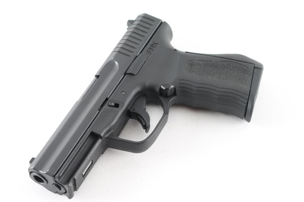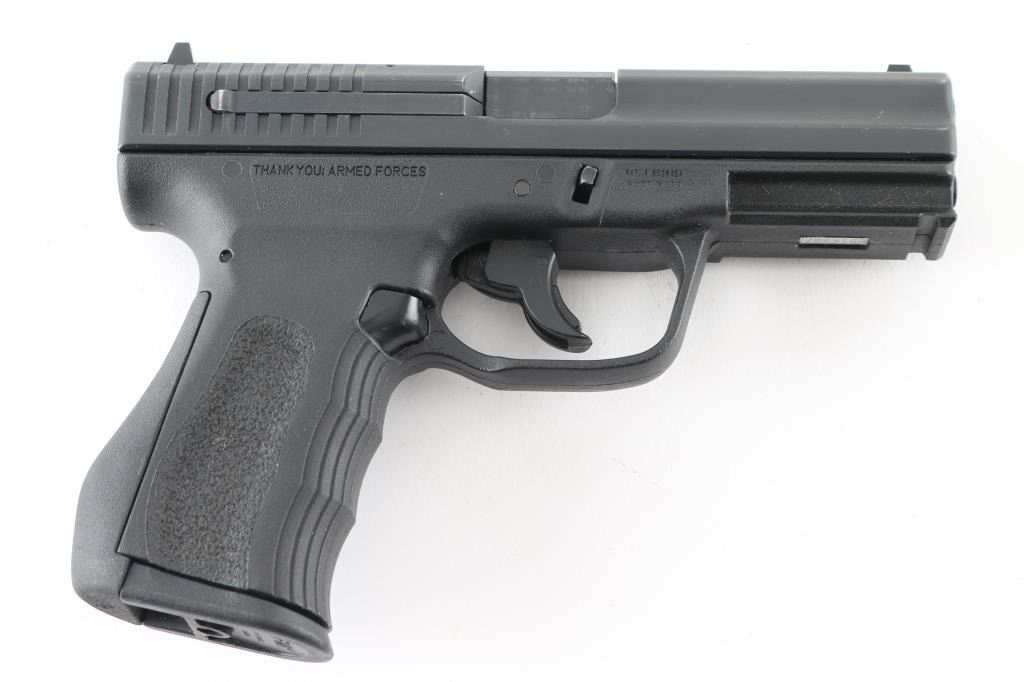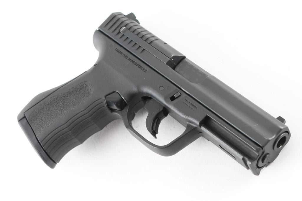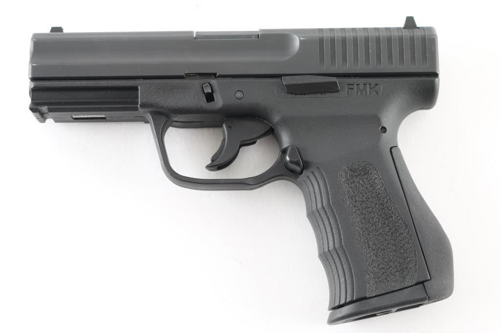 Semiautomatic pistol chambered for 9x19mm Luger. Features matte blue finish, black polymer frame with rubberized backstrap, 4" barrel, double action only trigger, magazine disconnect safety, loaded chamber indication on back of slide, trigger mounted manual safety, white dot front and white outline rear sight, sights are Glock 19 compatible. Right side of frame marked "Thank You: Armed Forces". Overall condition is excellent with few signs of handling. Includes one FMK 10 round magazine. Condition is NRA Excellent. Modern Firearm
