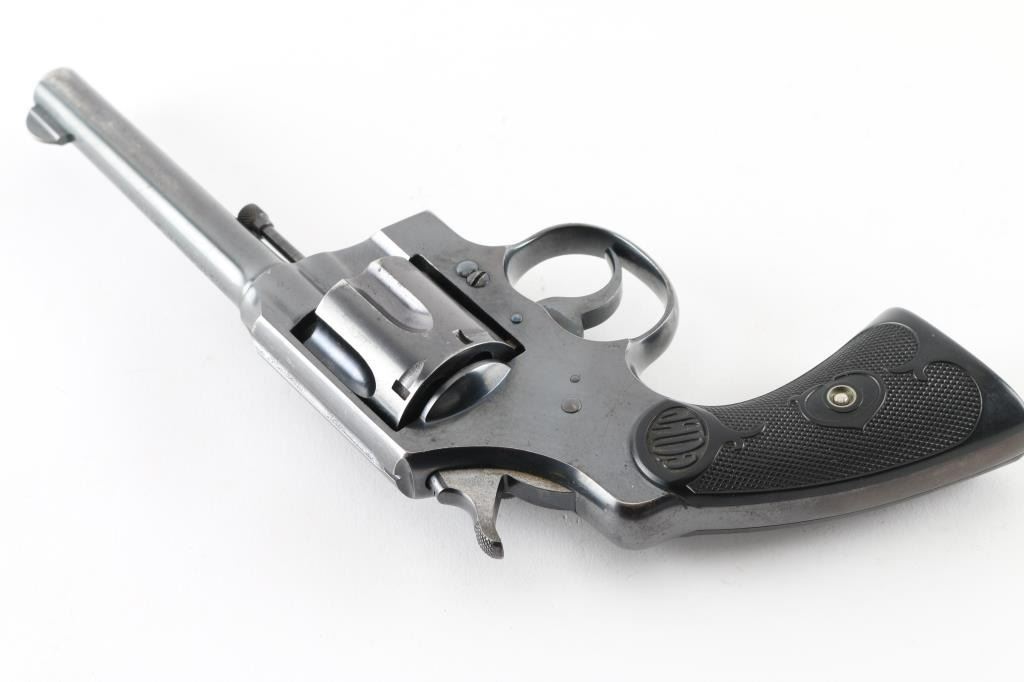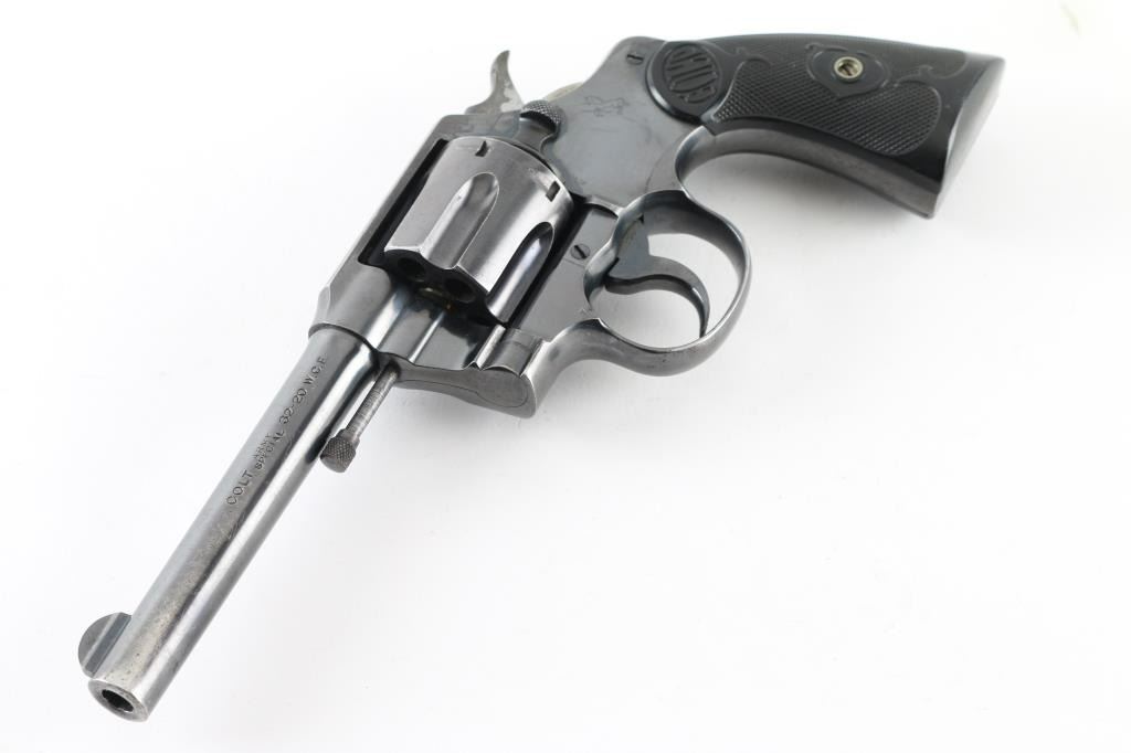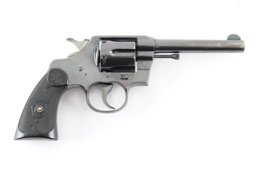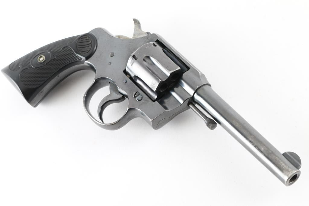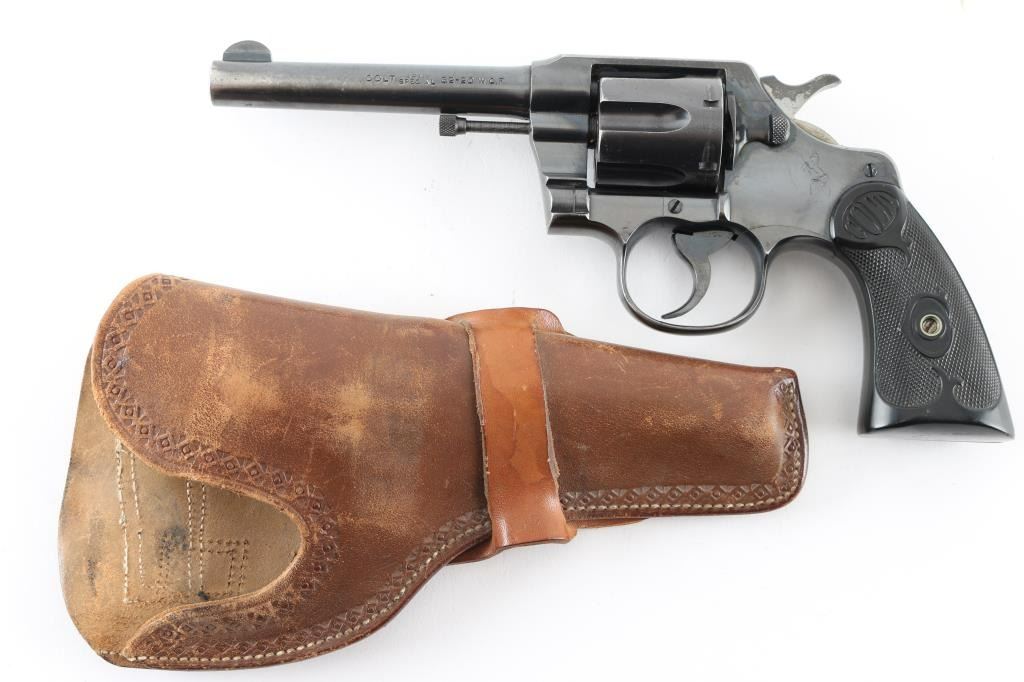 Vintage double/single action revolver features blued finish, checkered Gutta Percha "COLT" grips, 6" barrel, fixed sights, 6 shot cylinder. Manufactured 1920. Bore is very good condition. Retains 70% blue, with fading or bare metal on sides of barrel & all sharp edges, light patina forming on frame, grip straps turning to a brown color. Grips are excellent. Action is smooth with tight lock-up. Barrel markings are crisp; Rampant Colt marking on frame is even and crisp. Comes with a vintage brown leather single loop unmarked holster. Condition is NRA Very Good C&R Firearm