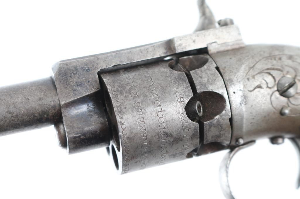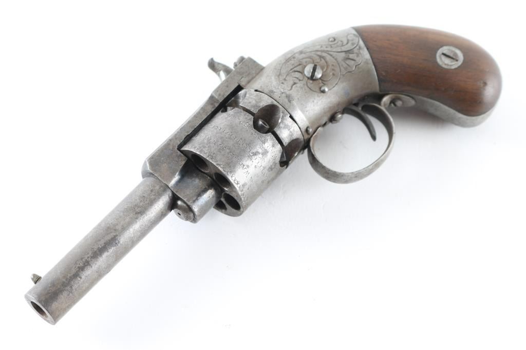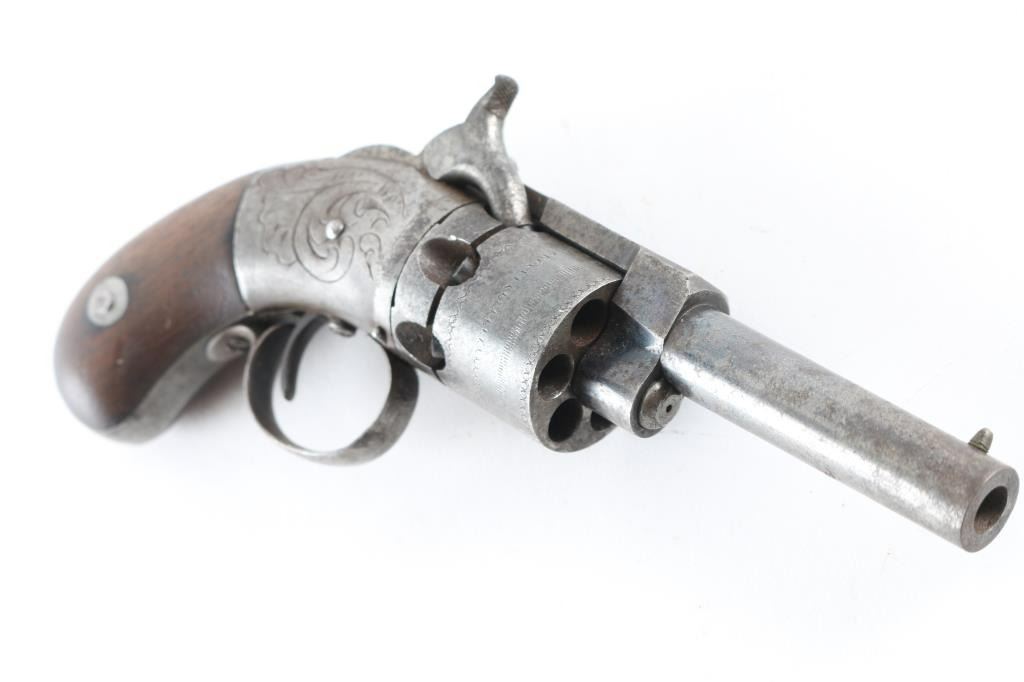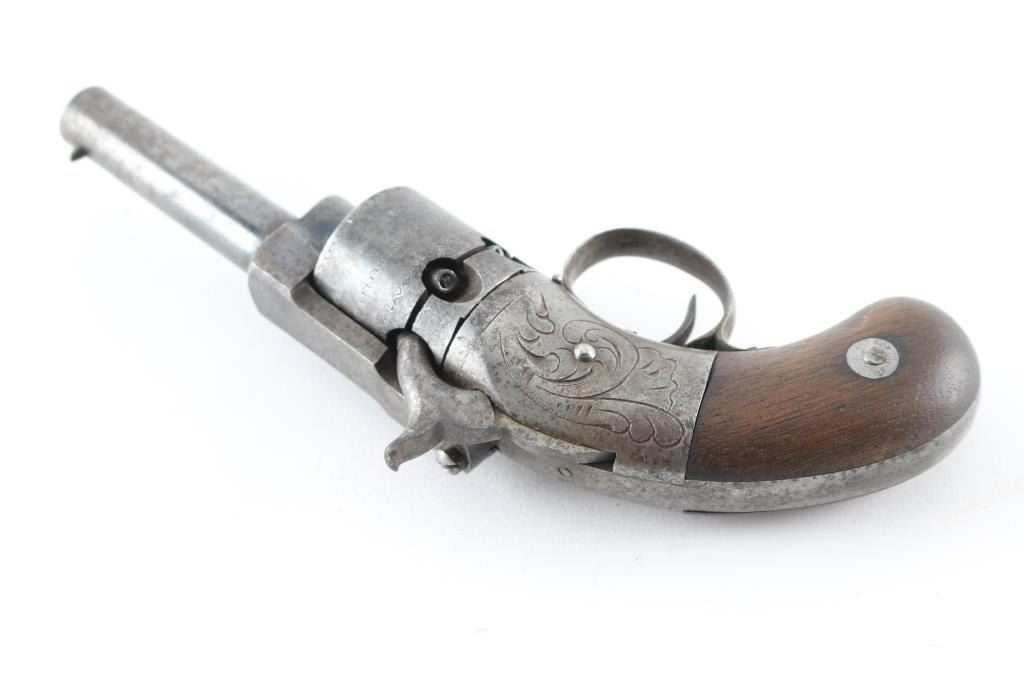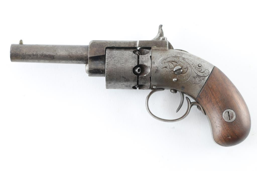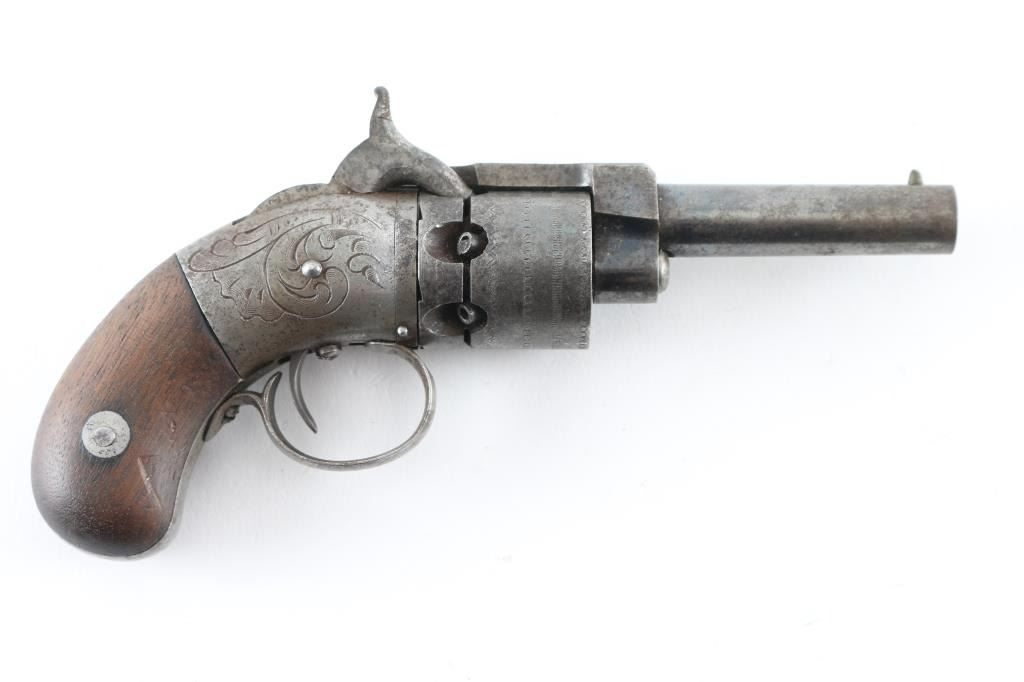 Early James Warner of Springfield, Mass. patent pocket model percussion revolver .28 Cal. 6-shot cylinder rolled-engraved line decoration marked "Warner Patent", and "James Warner, Springfield, Mass". Circa 1857. Last Model, cylinder markings indicate this was possibly Warner's own manufacture, about 500 produced. 2 1/2" round barrel, blue finish, walnut bag grips. Metal has turned a gray patina with traces of blue in recessed areas. Action is crisp, and locks up tight. Grips are very good, markings are clear. Bore is ok, a little rough. NRA Condition-Very Good as Antique Firearm.