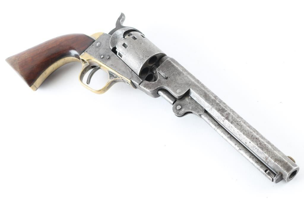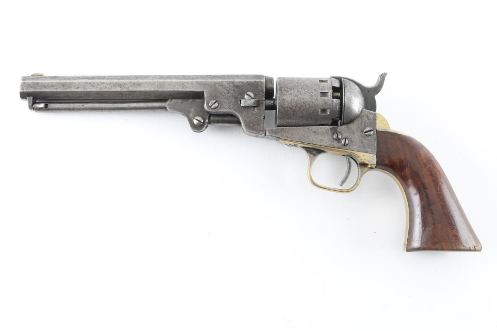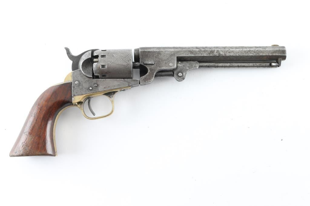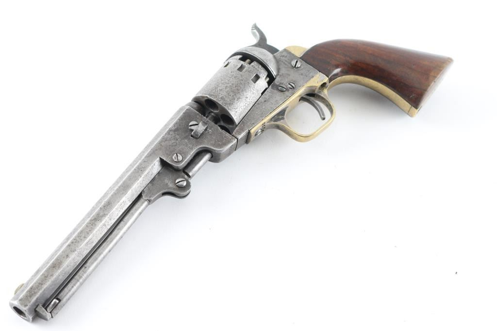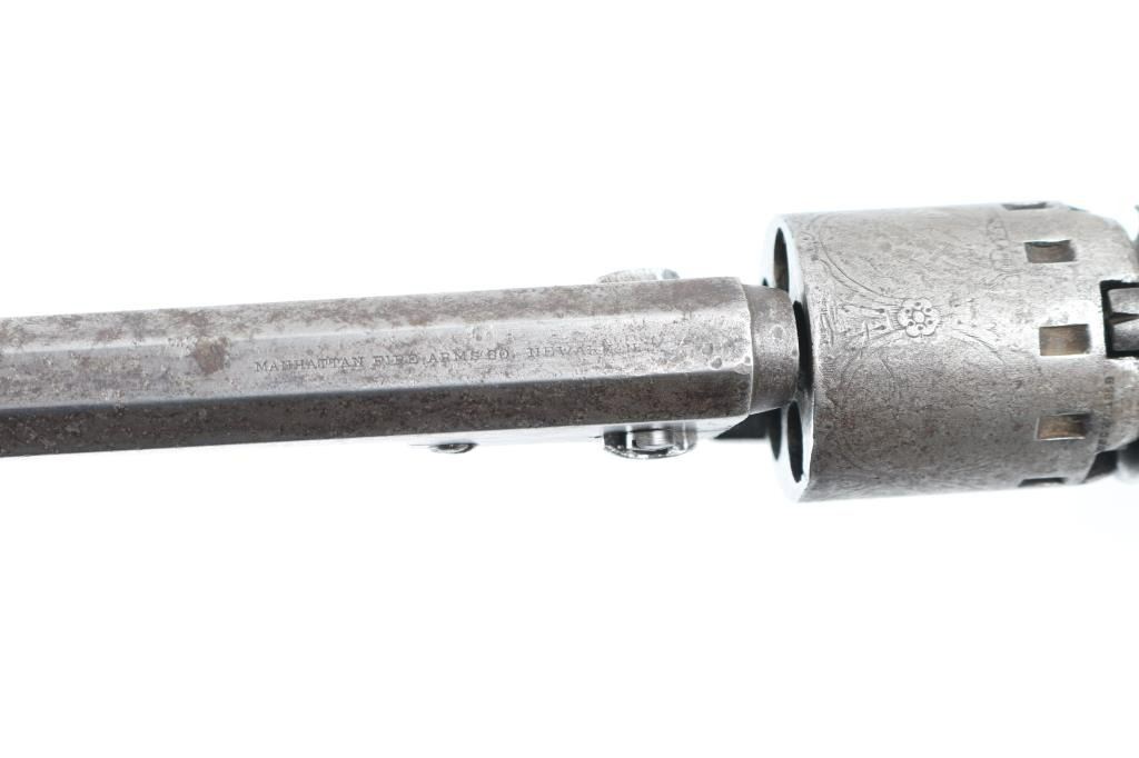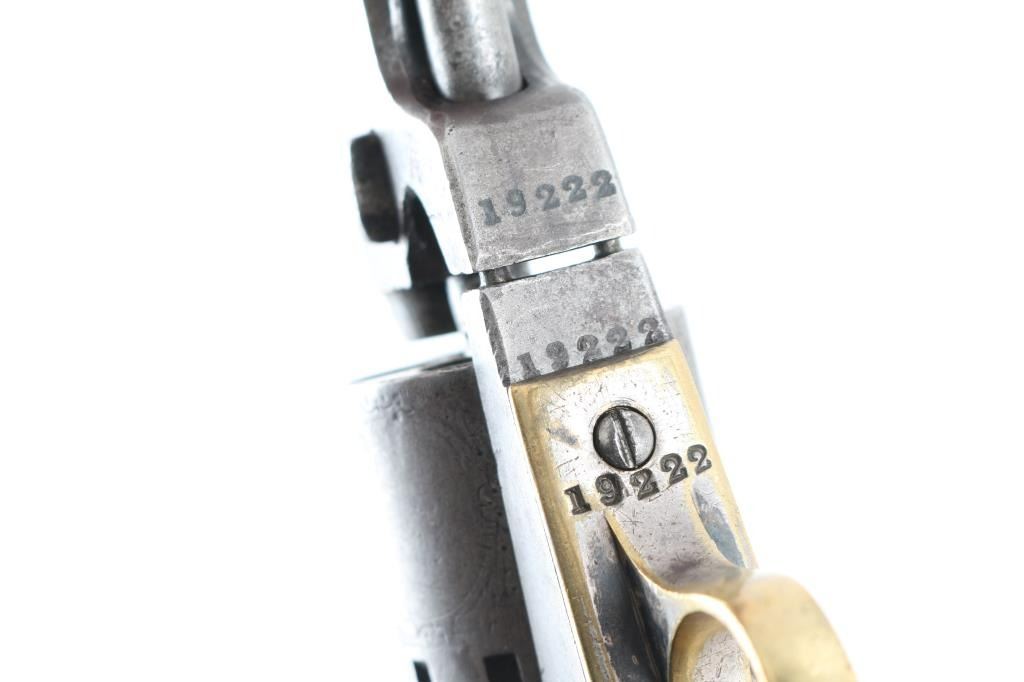 SN: 19222 Early percussion single action revolver chambered for .36 caliber ammunition, 5-shot, modeled after Colt's 1849 Pocket. Features a 6 1/2" octagonal barrel with "Manhattan Firearms Co. Newark NJ" ,loading lever, German silver blade front sight, notched rear sight, roll stamped cylinder with 12 stops, checkered hammer spur, plated brass grip frame, and once piece varnished walnut grips. Finish has moved to an even medium grey patina , with dents, and scattered pitting. All matching serial numbers, except the barrel wedge, faint markings. Bore has areas of pitting, and wood grips are very good with few blemishes & plenty of varnish. Barrel is loose, and cylinder does not index, the hand appears broken. Two screws appear to be newer replacements. Nipples appear to been newer replacements. NRA Condition-Fair (Inoperable) Antique Firearm