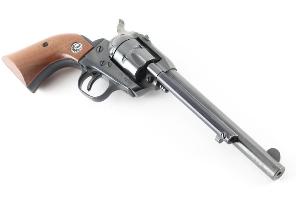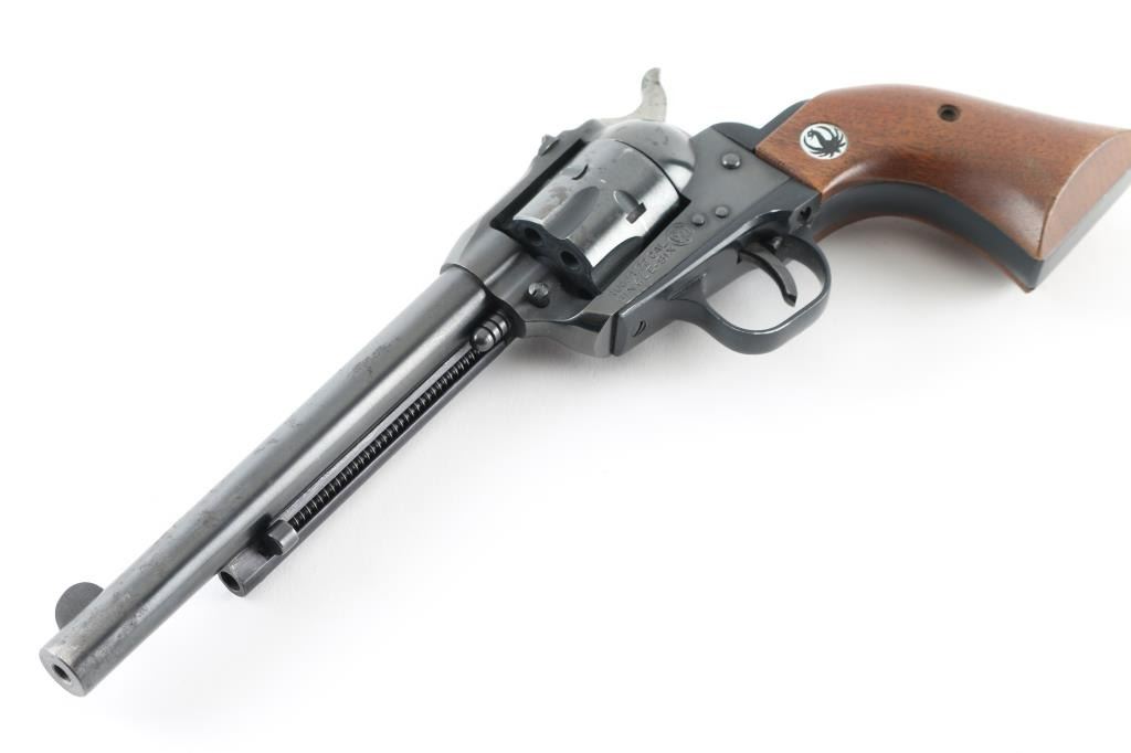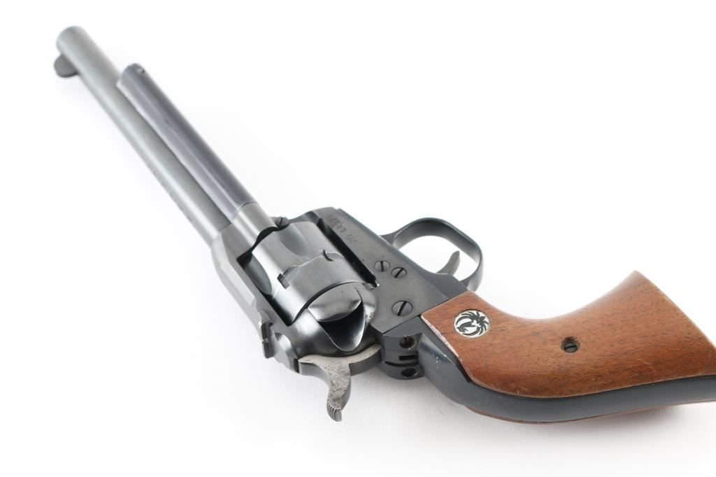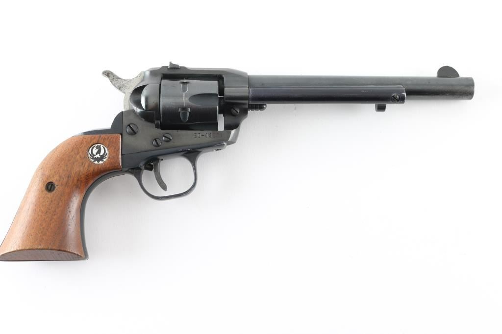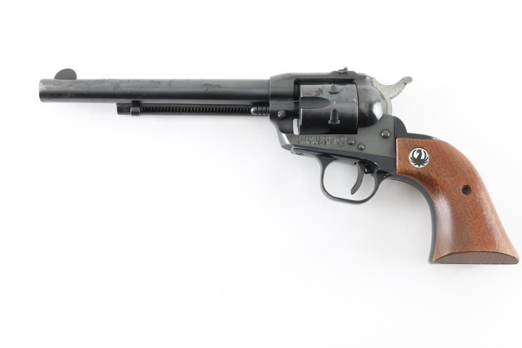 Single action rimfire revolver manufactured circa 1969. Features blued finish, smooth wood grips with Ruger medallions, 6.5" barrel, fixed front & dovetailed rear sights, fluted 6 shot cylinder. Bore is very good condition. Retains 80% blue with edge losses, scratches, several small areas of patina or thin rust. Wood grips are very good with few dents & scratches. Action is smooth with good lock-up. Condition is NRA Good++ *** C&R Firearm ***