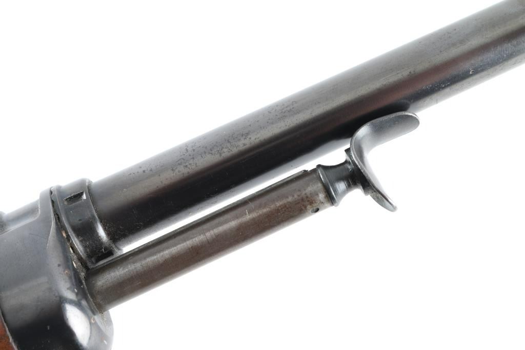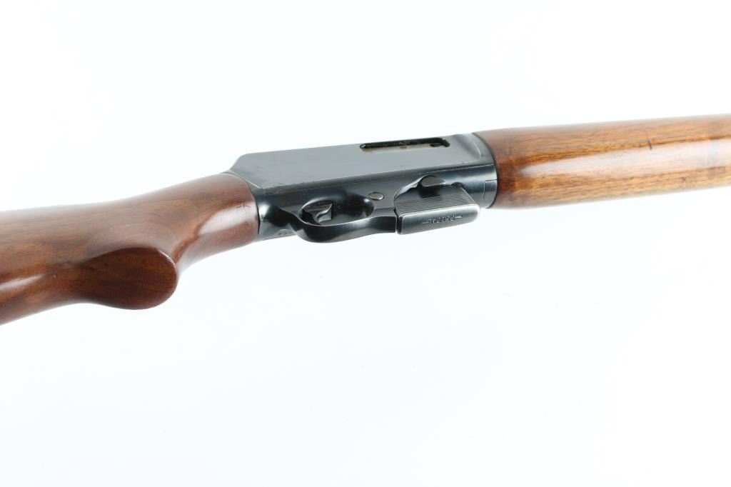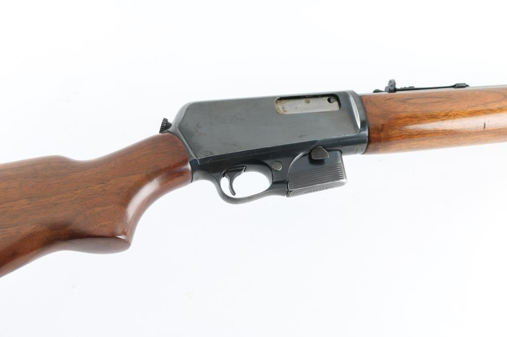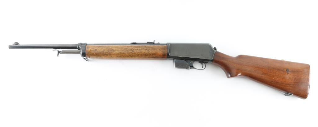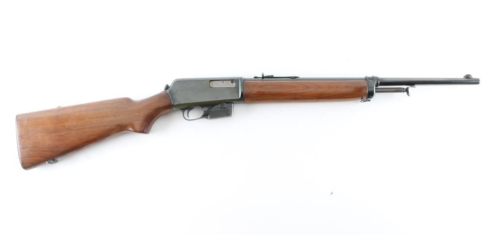 Post-war magazine fed semi-automatic police rifle chambered in .351 Winchester Self-Loading, manufactured circa 1946. Features a blued finish, 20" round barrel, dovetailed Lyman blade front sight with ivory polymer bead, semi-buckhorn adjustable rear sporting sight, 5 round detachable magazine, take-down receiver, smooth trigger, push button safety, sling swivels, smooth walnut beavertail forend and pistol grip shoulder stock with serrated metal buttplate. Serial numbers match on both parts of the receiver. Bore is very good condition. Rifle exhibits a bright blued finish with approximately 80% remaining overall, showing scattered handling marks, scratches & losses. Wood stocks are very good, varnished, with small blemishes. Includes one very good condition magazine, small compass inlet into top of butt stock. Condition is near NRA Very Good *** C&R Firearm ***