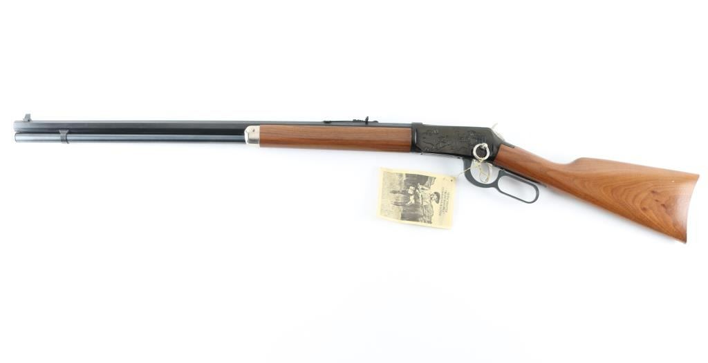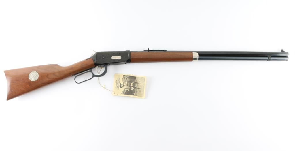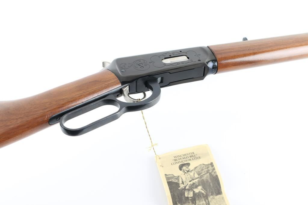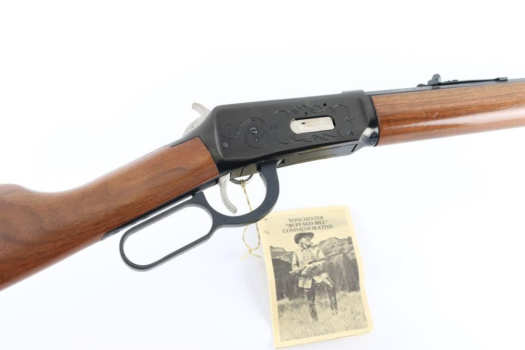 SN: WC79284 Limited edition commemorative lever action repeating rifle celebrating American Old West figure W. F. Cody aka ‘Buffalo Bill’. Chambered in .30-30 Winchester and manufactured circa 1968 with only 112,923 (counting both rifle and carbine variants) reported to have been produced. Buffalo Bill served in the Union Army during the American Civil War, served as a scout for the U.S. Army during the Indian Wars, was an exceptional bison hunter and was one of the most famous showmen of the 19th century. Configuration: blued & lustrous black finish with nickel plated accents, 26" octagonal barrel, full-length magazine tube, dovetailed blade front sight with bead top, elevation adjustable rear sporting sight, simple roll stamped engraving on the receiver, saddle ring, smooth trigger with beveled edges, serrated hammer spur, grip safety, smooth walnut forend with metal cap and straight grip shoulder stock with inlayed Buffalo Bill Commemorative coin on the right side & smooth metal buttplate. Rifle retains approximately 98% original finish showing handling marks. Action is smooth, the bore is pristine and the wood stocks are fine with only minor blemishes. Includes Winchester "hanging tag" brochure describing this edition commemorative. Condition is near NRA Excellent *** C&R Firearm ***