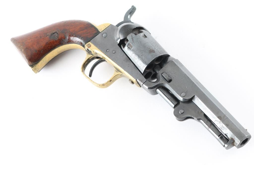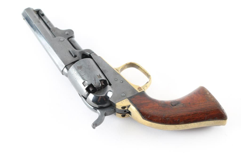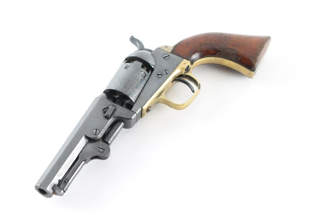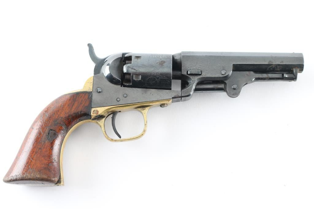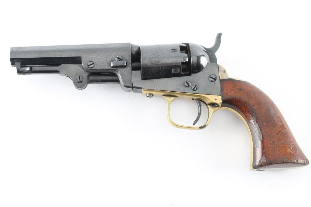 Single action percussion cap 'n' ball revolver manufactured circa 1862 (Civil War). Features 4" octagon barrel, loading lever, 5 shot unfluted cylinder with roll stamped stage coach scene, post front sight, rear sight notch on hammer nose, one piece walnut grip, brass back strap & round triggerguard. All observed numbers match. Markings are generally sharp, with good cylinder scene. Bore appears good or better. Pistol has been re-blued, with evidence of dents, light pitting under the blue, there is an area of newer pitting on the right barrel, and cylinder . Grips are good with some minor scratches, dents, and edge wear, some handling loss. Hammer does not cock, and there is no tension on the trigger, probably needs a new mainspring. There is a period inscription on the heel that reads "S.H. Lovell". NRA Condition-Fair as antique Firearm.