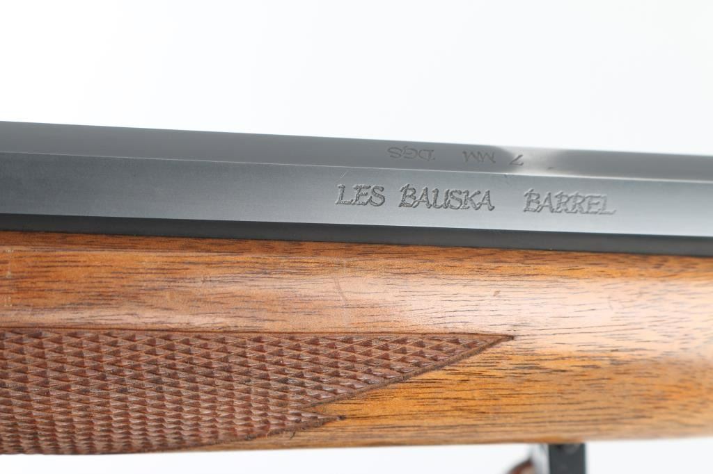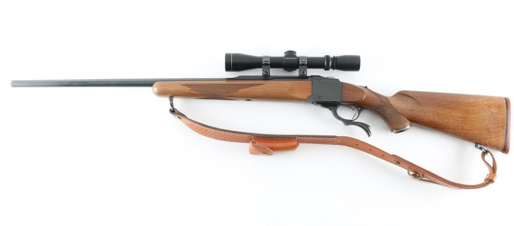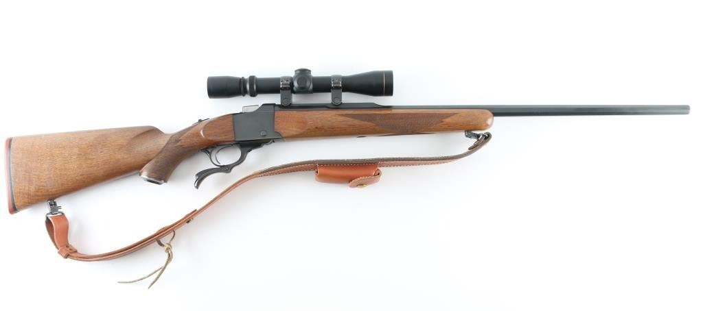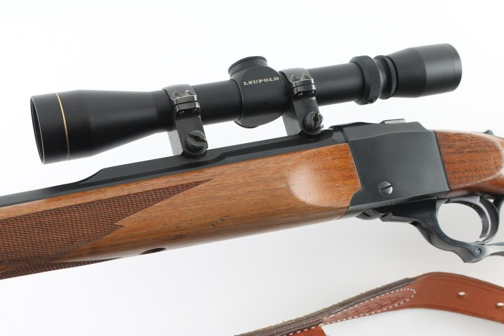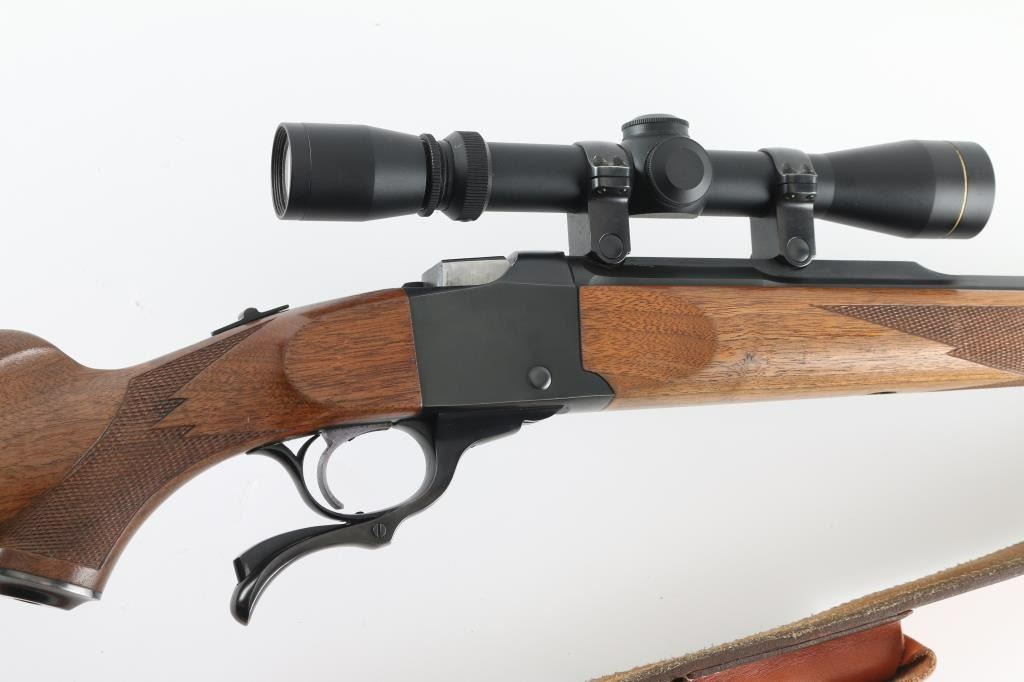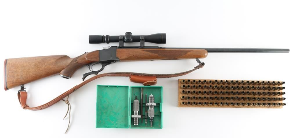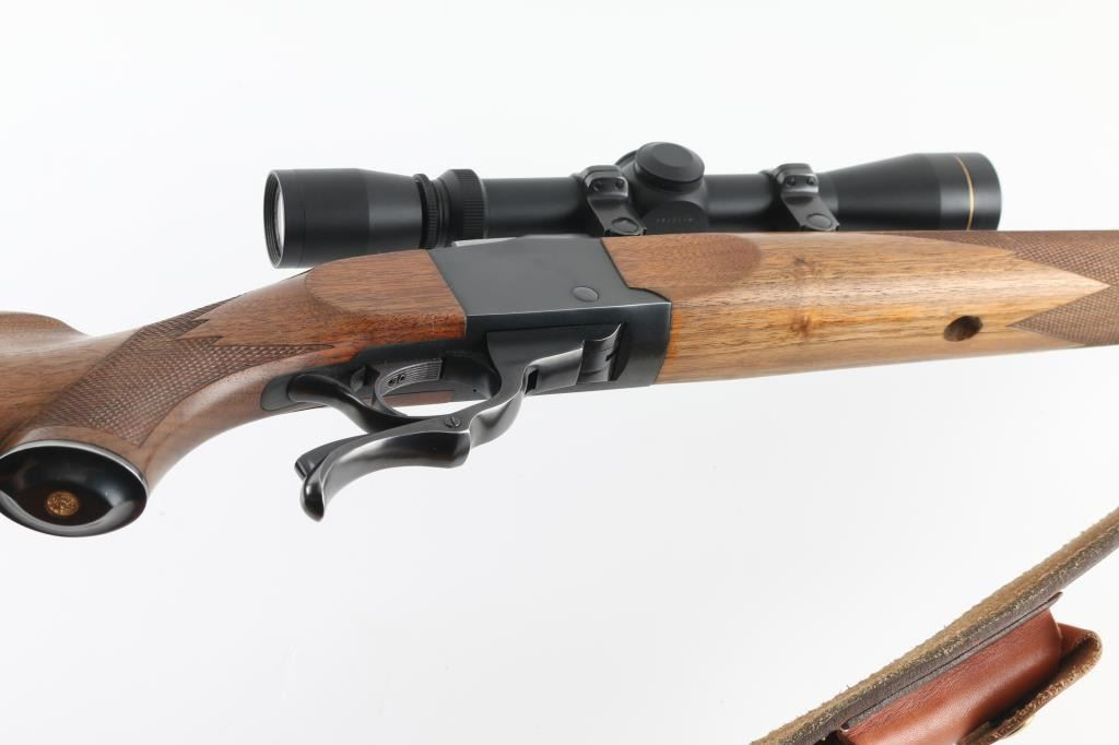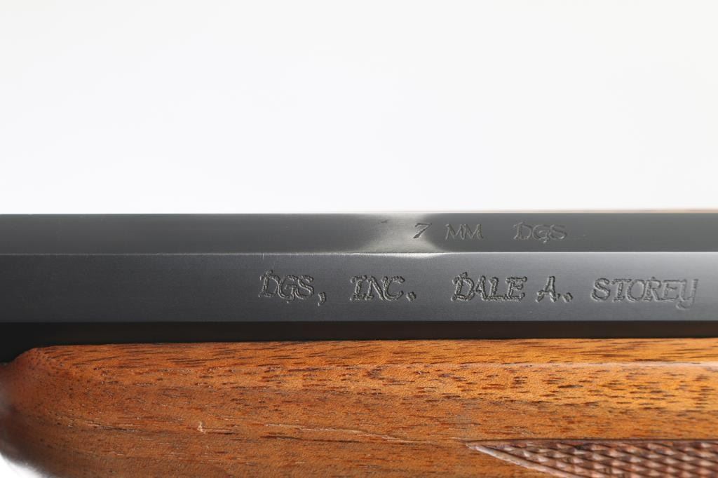 Custom rifle, signed by Dale A Storey of DGS, Casper WY. American made single shot, Falling-Block rifle manufactured circa 1968. Re-barreled & chambered for 7mm DGS, a wildcat cartridge based on the 7x57mm Mauser case with a "blown out" or improved shoulder. It features a custom 26" blued tapered octagon barrel by Les Bauska with integral quarter rib, and receiver with no iron sights but is drilled and tapped. It has a serrated trigger, tang safety and smooth operating lever. The two piece walnut stocks, checkered at the wrist and forearm have a black metal Ruger grip cap, sling swivels and a red Ruger butt pad. Comes with a Leupold VARI-X 3-9x33 scope, rings a Triple K leather sling, RCBS dies for 7mm DGS and a wooden brass case holder for 100 rounds with empty brass. Bore looks great, bright. Metal finish looks great. Wood stocks look pretty good. There appears to be some loss of finish on the shoulder stock but still in great shape. Overall very few signs of use, wear or handling. Barrel stamped "DAS 92987" under forend (1987). Condition is NRA Very Good **C& R Firearm**