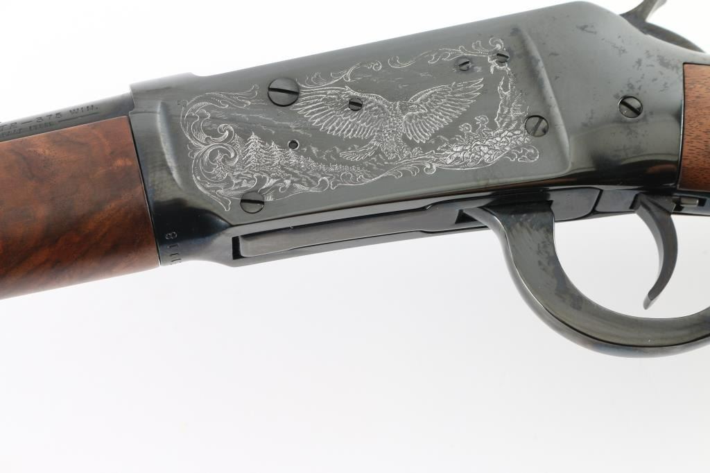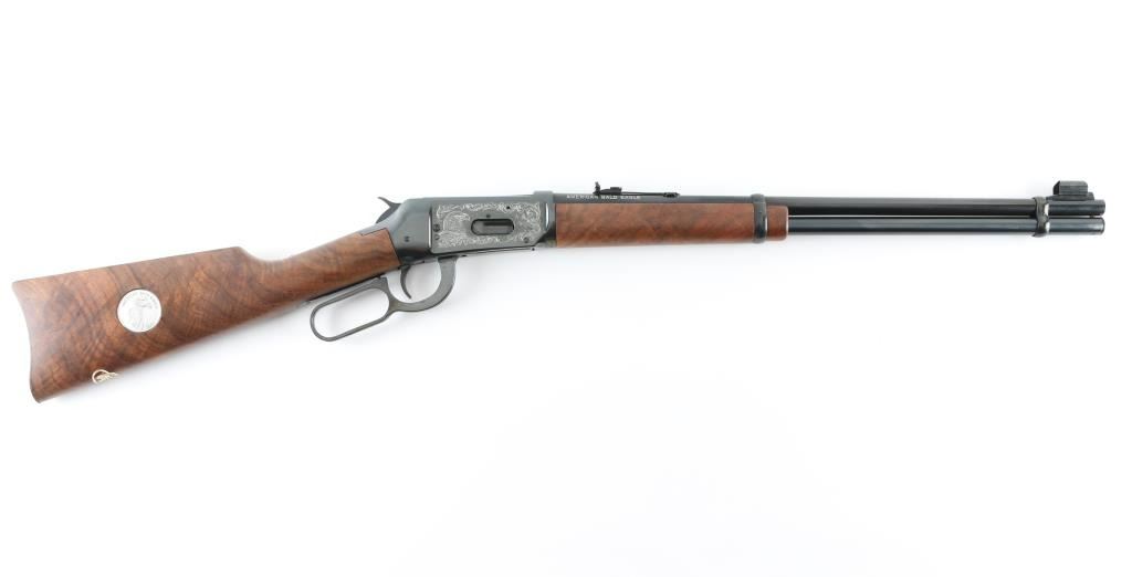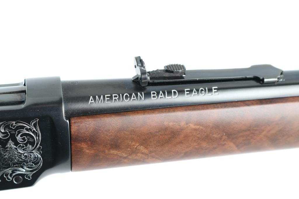 375 Winchester SN: ABE1118 Silver Edition commemorative lever action rifle celebrating the American Bald Eagle, manufactured with a "Big Bore 94" receiver circa 1982. Reportedly limited to 2800 rifles. Features blued finish, smooth extra fancy walnut stocks with straight wrist, 20" barrel, blade front sight (on ramp, with hood), sporting rear sight, carbine butt with smooth metal buttplate, receiver has thicker reinforced section at the rear. Barrel is engraved "AMERICAN BALD EAGLE" in block letter with silver color inlay. Sides of receiver are engraved with 75% coverage, scenes of bald eagles in flight or in portrait, with pine trees, surrounded by floral scrolls. Silver finish coin in buttstock continues the motif. Bore is very good. Retains 98% finish with minor handling marks, small area of distressed finish at front right bottom of receiver. Wood is excellent with fiddle grain, contrasting dark and lighter colors, some burl in the forend. Condition is near NRA Excellent *** Modern Firearm ***