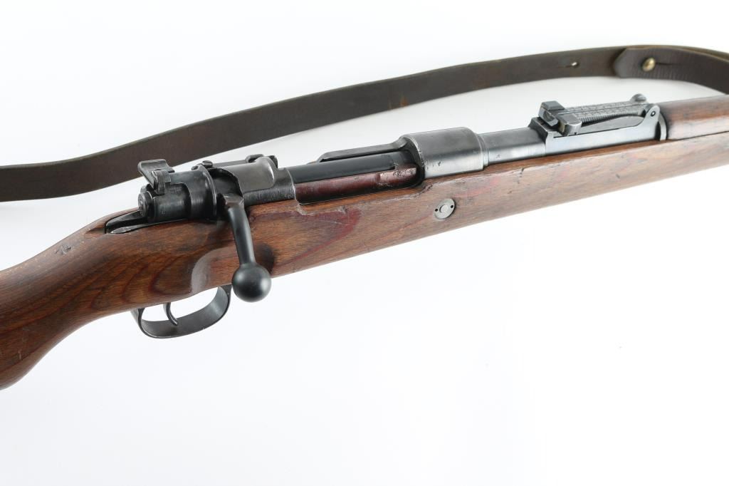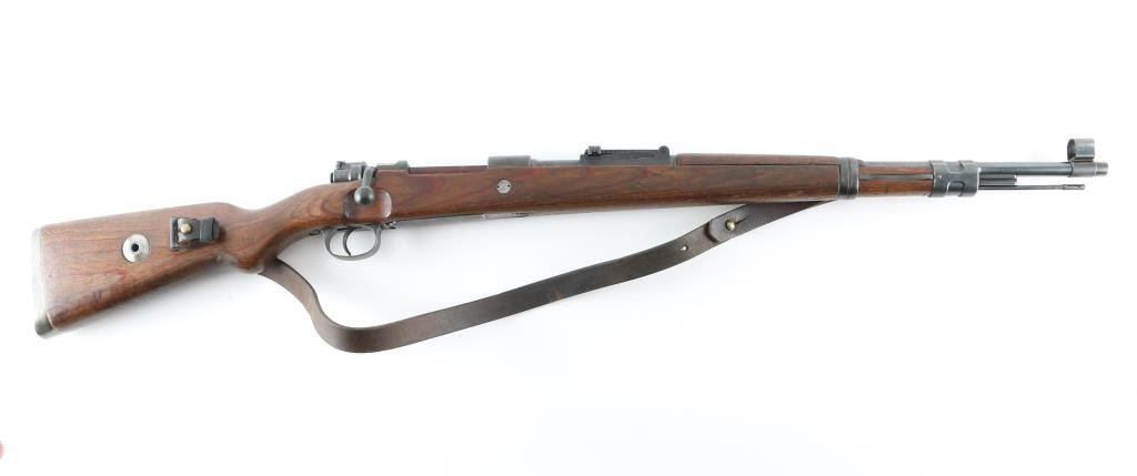 Rifle, Bolt action. German military issue. WW2 era. Receiver has "bcd" code. (Gustloff Werke) and dated 1942 (marking is faint). Blued finish. Wood stock. 23.62" barrel. Serial number matched on receiver ,barrel bands, bolt, rear sights, bolt sleeve, floorplate, magazine follower, and safety lever. "H" front barrel band Eagle/swastika proofs, and waffenamts present. Barrel is marked "80 41 bys" ( Sub contract barrel by Ruhrstahl AG) Wood is very good shape, with small dings/dents present. Bore is very good/bright. Action is crisp/tight. Metal finish is about 80% with edge/handling wear. Cleaning rod, Unmarked cupped steel buttplate.. No import marks. A non-issue K98 sling attached (Russian?) A really nice matched K98k. NRA Condition-Very Good. C&R firearm.