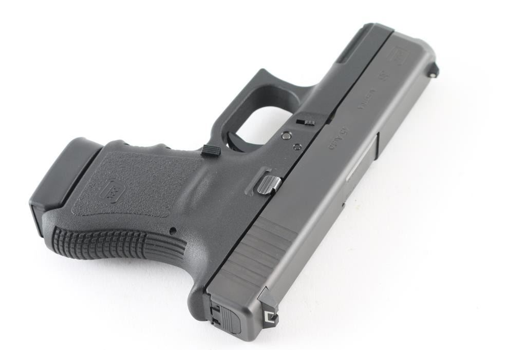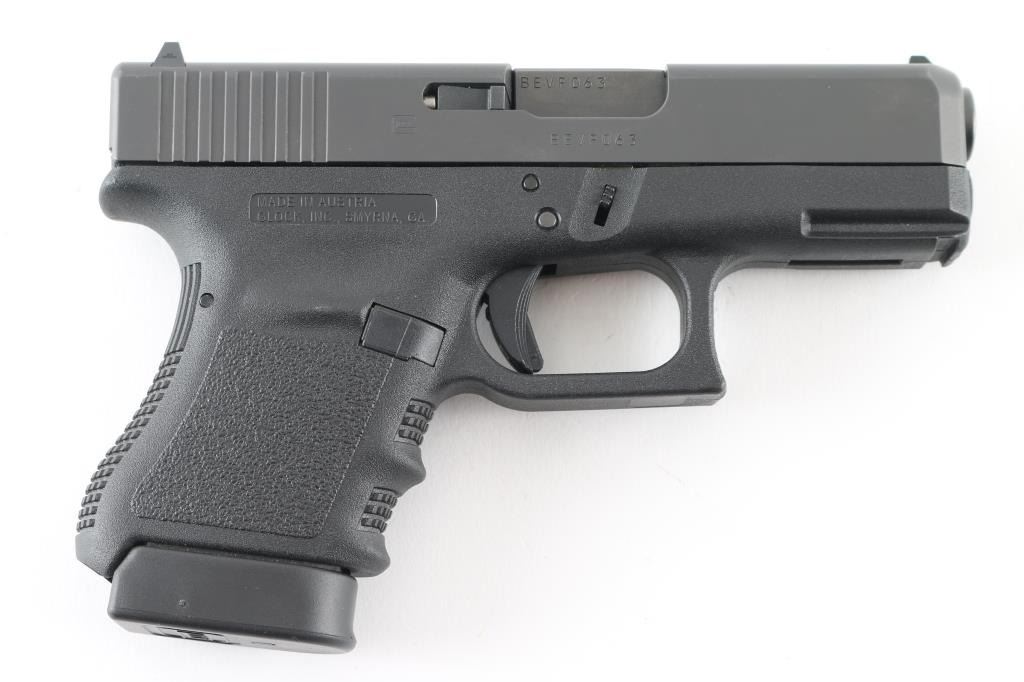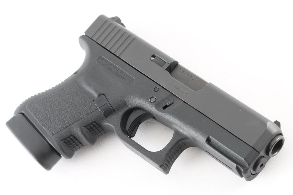 Austrian made sub-compact safe-action semi-automatic pistol imported by Glock, Smyrna GA. Features a black finished slide with beveled front edge on slide, 3.78" barrel, white dot front. and white outline notch rear sights, trigger safety, push button magazine release, factory 6 round magazine, slim black polymer frame with textured finger groove grip. Bore is excellent/bright. Retains 99% finish with minor edge losses. Like new condition. Condition is NRA Excellent Modern Firearm
