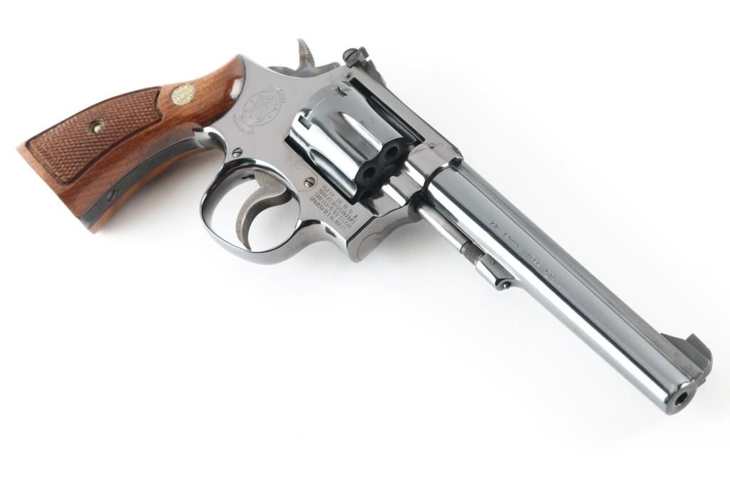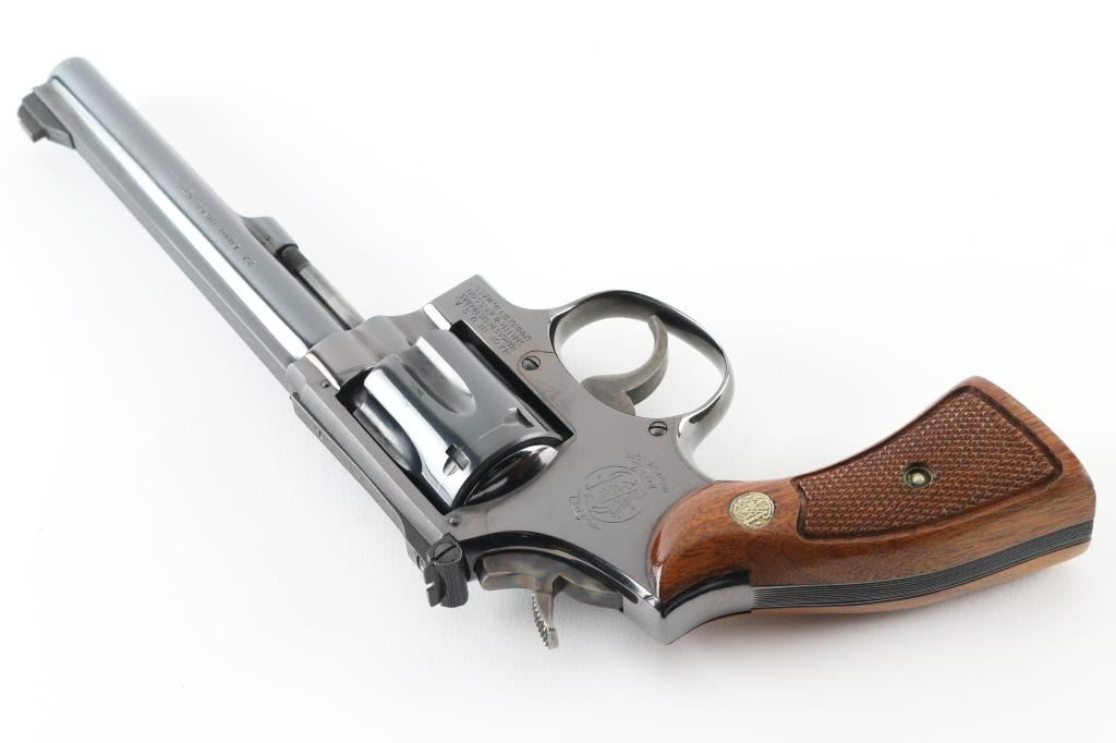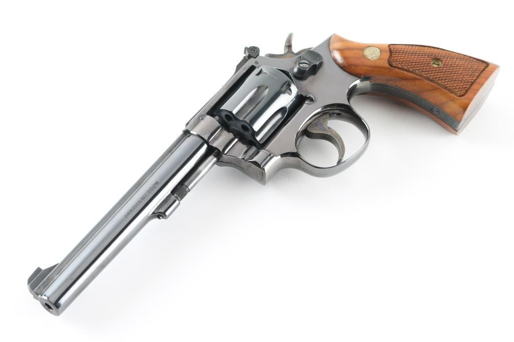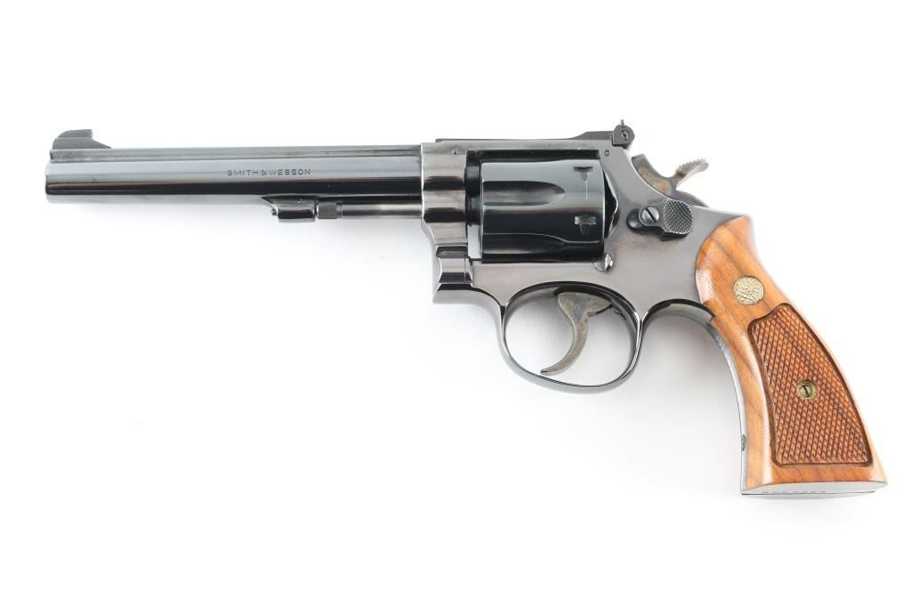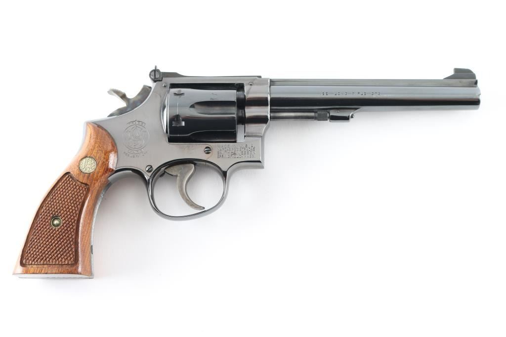 Revolver. D/S Action. 6-rd Capacity. The "K-22 masterpiece". Produced 1957-1989. Model 17-3 (1967-Relocation of rear sight leaf screw, 1968-Delete diamond grips) Built on a square butt K target frame . 6" serrated ribbed, pinned barrel with patridge front, and micro-click adjustable rear sights. Serrated trigger, 10-groove serrated fore, and backstrap. Bore, and cylinder are excellent. Case-hardened hammer is excellent. Checkered walnut grips with S&W Medallions are excellent. Action is smooth/tight. Blued finish is about 98% with some wear on the cylinder pin, and very slight cylinder drag lines. Almost new condition. NRA Condition-Excellent. Modern Firearm.