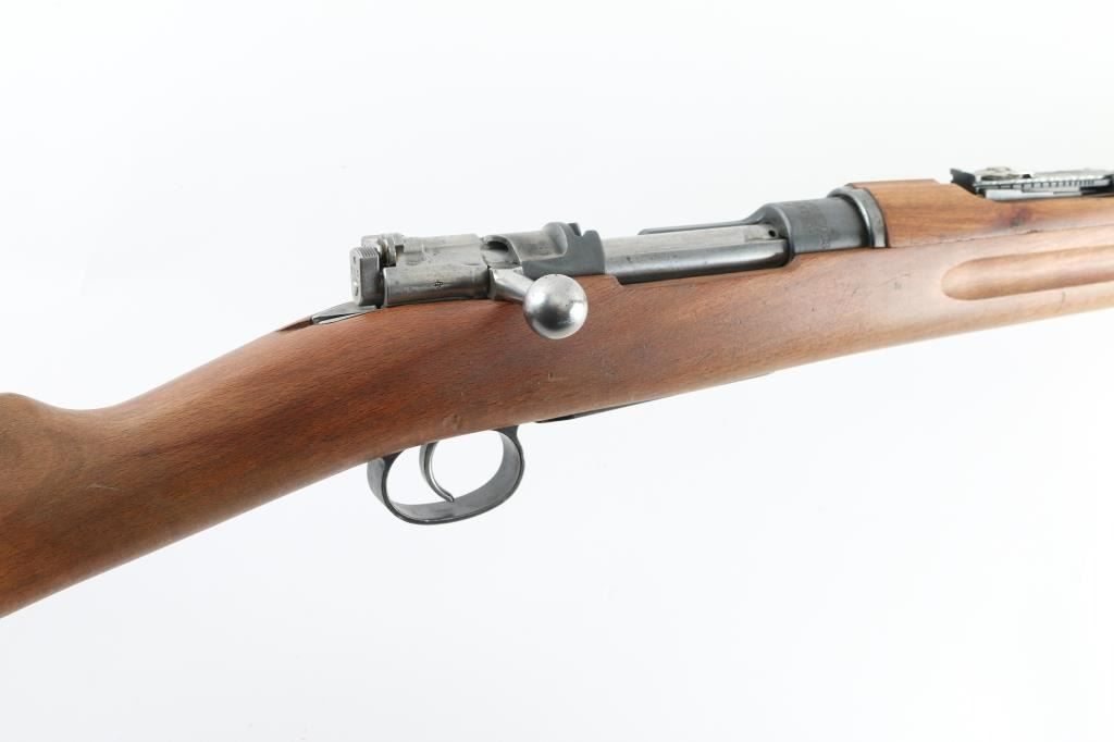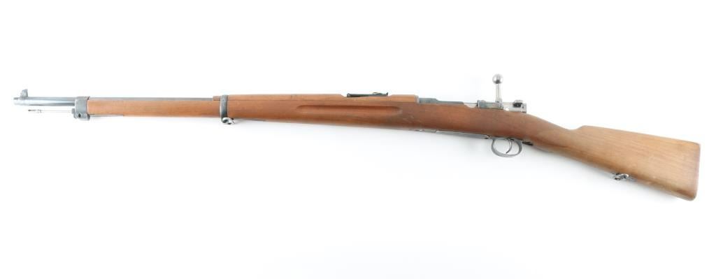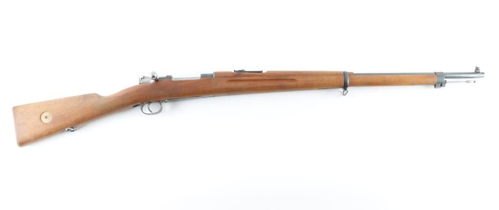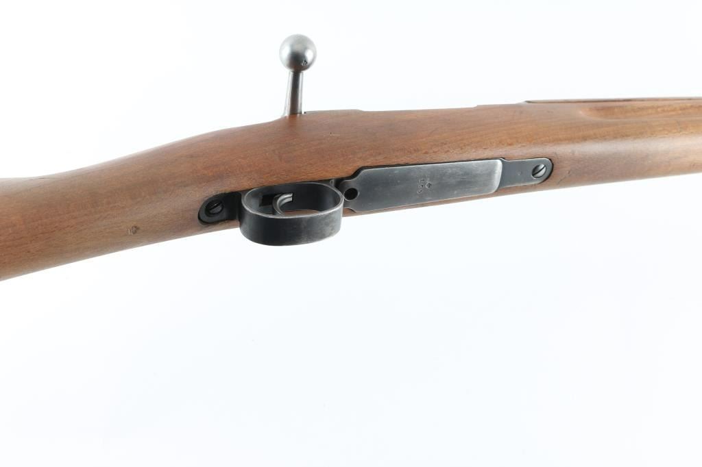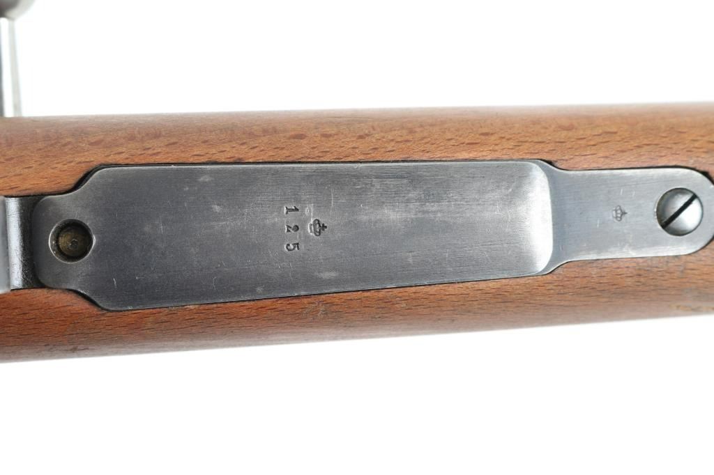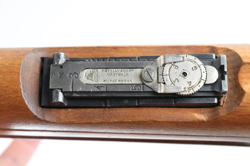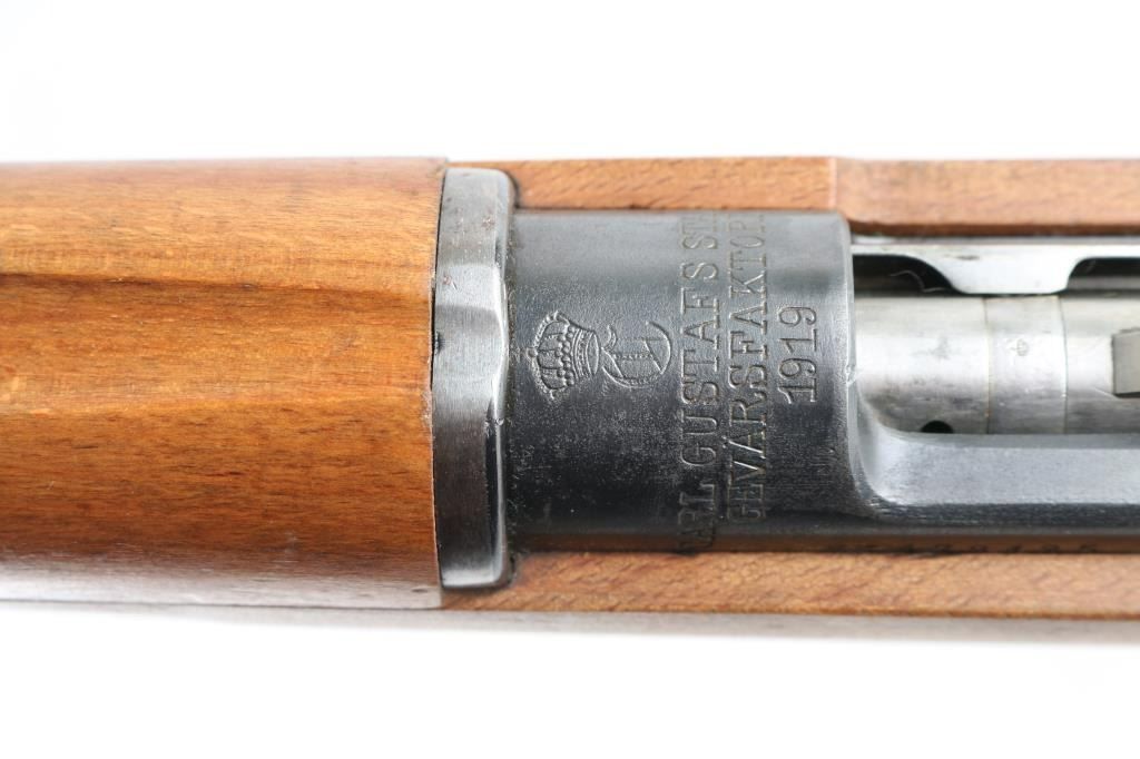 Swedish military bolt action service rifle manufactured in 1919. Features a blued finish, 29" barrel, blade front sight, Metallverken Vasteras micrometer rear sight. bayonet lug, cleaning rod, sling swivels, polished bolt, integral box magazine, manual safety, and straight grip full length shoulder stock with smooth metal buttplate. Serial numbers match on receiver, floorplate, bolt , bolt release, buttplate, barrel bands, and bolt sleeve. Bore appears good, but dirty.. Approximately 75% finish is retained overall, with some handling wear. Wood stock is good., with some scratches. Has Torped brass disc inletted in left buttstock. Imported by SAMCO, marked on underside of barrel. NRA Condition-Very Good, C&R Firearm.