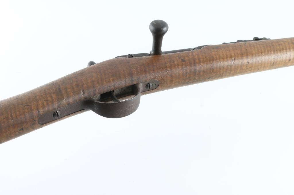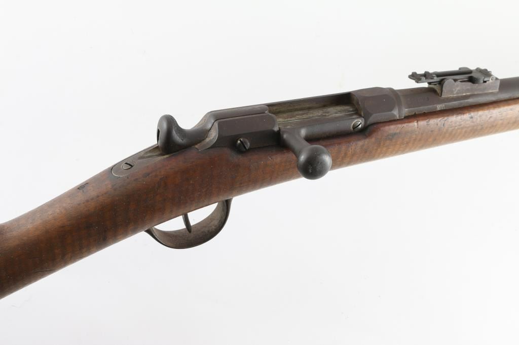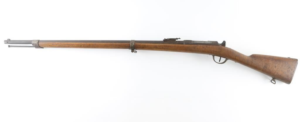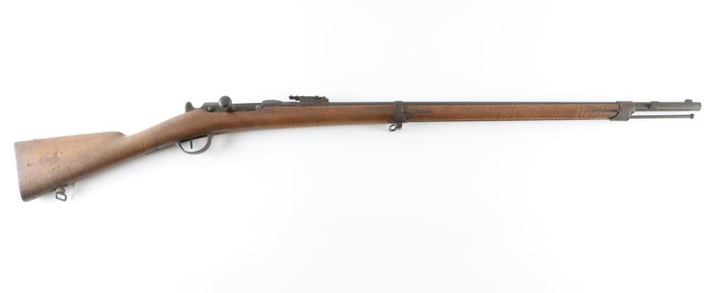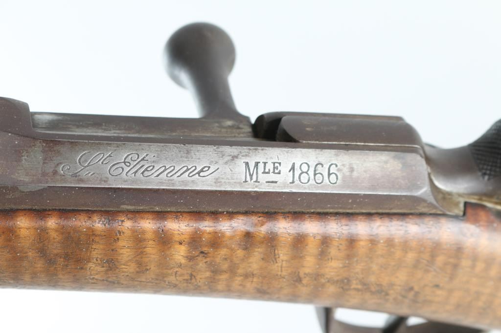French military Chassepot Infantry rifle, bolt-action, needle fire, breech loading. Manufactured 1873 at the St. Etienne arsenal. 31.3" barrel, military sights, bayonet lug, cleaning rod. Matching serial numbers on barrel, stock and bolt. All marking are clear. 1873 dated cartouche, with "M.A." wood insert on right buttstock. Action works well, bore is very good, with strong rifling, needs cleaning. Wood is very good with some scratches/dents. Metal finish is covered with a dark brown patina/surface rust. NRA Condition-Good+ as Antique firearm.