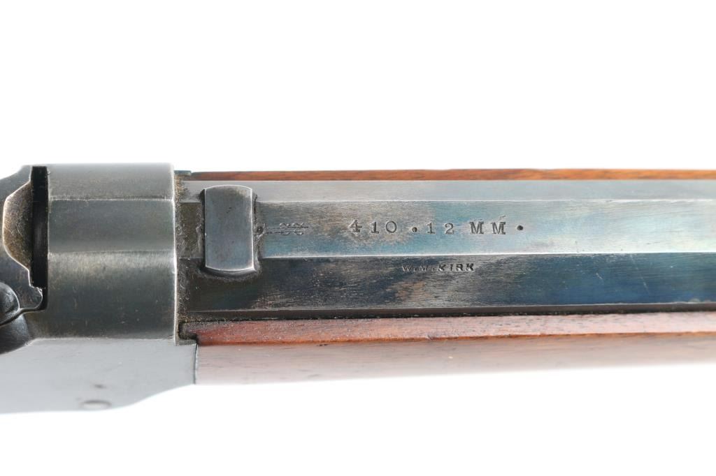 This is a Winchester M1885 Low wall , manufactured 1918, that was professionally converted to .410 Ga. (2.5" shells) by William Kirk, the consignor's great Uncle. He started out as a machinist in the mines in cripple Creek Colo. during the gold rush, and later became a gunsmith in Encampment, Jackson Hole, and Rawlins, Wyoming in the early 1900's. He made these for sheep herders where there was a market for them. Lever-action, drop breech. 26 1/2" octagonal to round barrel with steel bead, and rear sight insert grooved for sighting. Lower barrel is stamped "410", "12mm" and "W.M. Kirk". ".22" is lined out, partially obscured by sight base insert just froward of the receiver. Serial number on lower tang. Winchester markings on upper tang. Bore appears excellent/bright, action is smooth/tight. Drop in choke gauge shows a bit more open bored than CYL. Wood is very good with normal scratches/dings, contrasting black painted fore cap. Factory checkered plastic buttplate. Blued metal finish is about 60% with scratches. handling/edge wear with scattered areas of pin-prick pitting, rust spots on the upper barrel. Great Western History, can be researched in newspapers, and the Wyoming Project. NRA Condition-Good as C& R Firearm