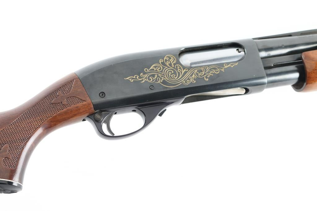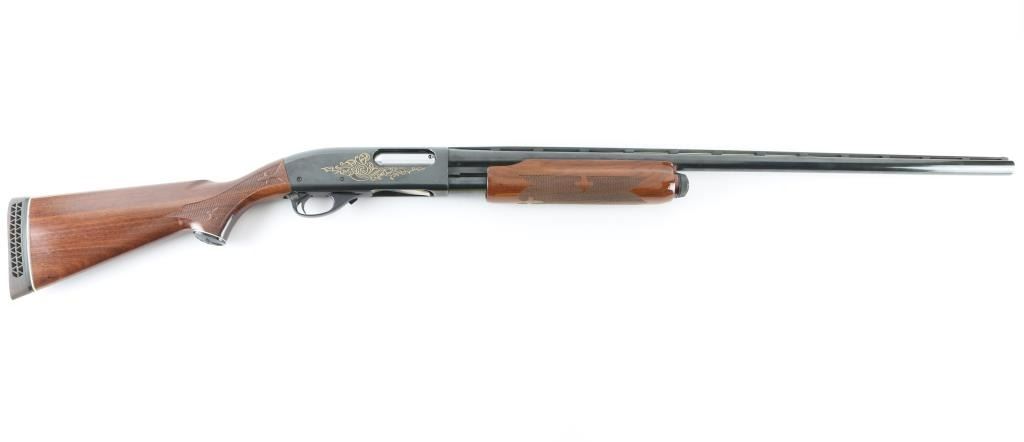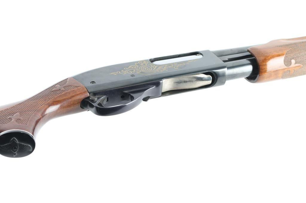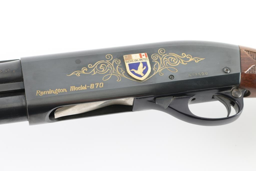 Sn: 9725du This is a Ducks Unlimited Remington Model 870 shotgun circa 1974. It features a special engraving pattern with yellow lacquer and Ducks Unlimited “Shield” on the receiver. It has a 30", blued vent rib barrel with a fixed Full Choke and a silver bead front sight. The buttstock and forearm have fleur-de-lis checkering and a Remington-label vent rubber butt pad with a white spacer and matching white spacer under the Wingmaster grip cap. Metal finish looks good with almost no signs of use or handling. The wood stocks look very good with no signs of handling. The bore looks good but needs cleaned. LOP is 14". Overall the gun appears to be in great shape it just collected some dust and needs cleaned. This is a very collectable example of a Ducks Unlimited gun and one of the least made DU guns out there. For collectors of DU shotguns this 870DU is a must. Condition is NRA Excellent *Modern Firearm*