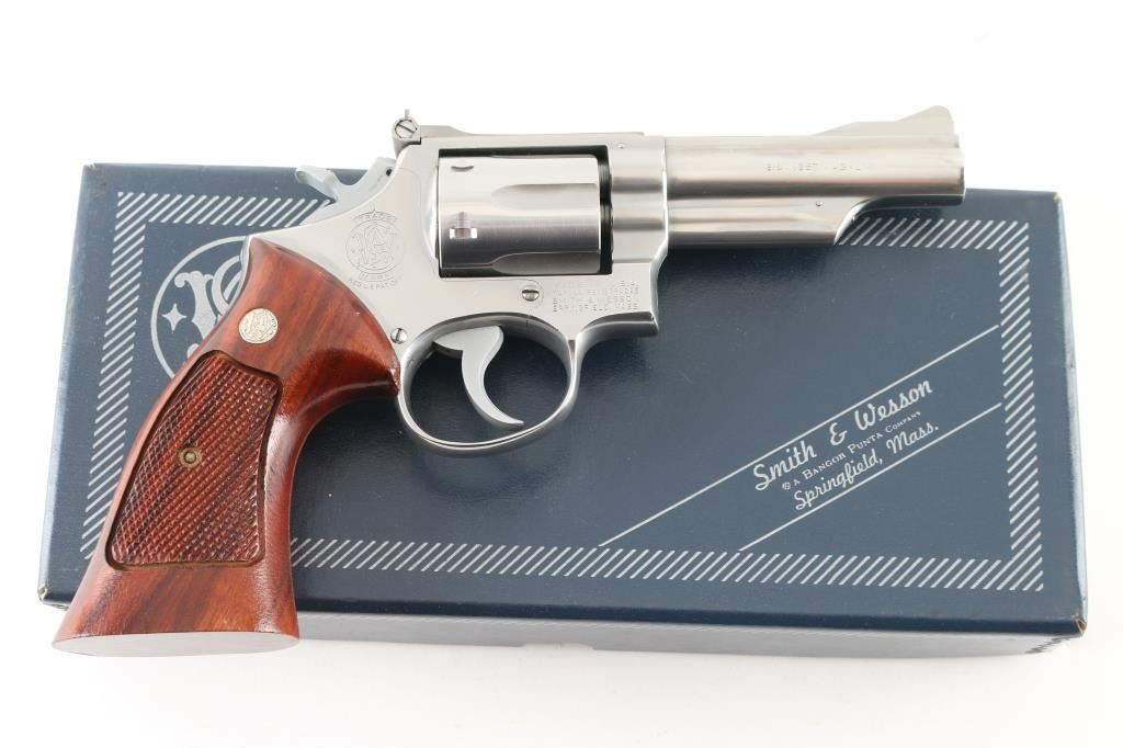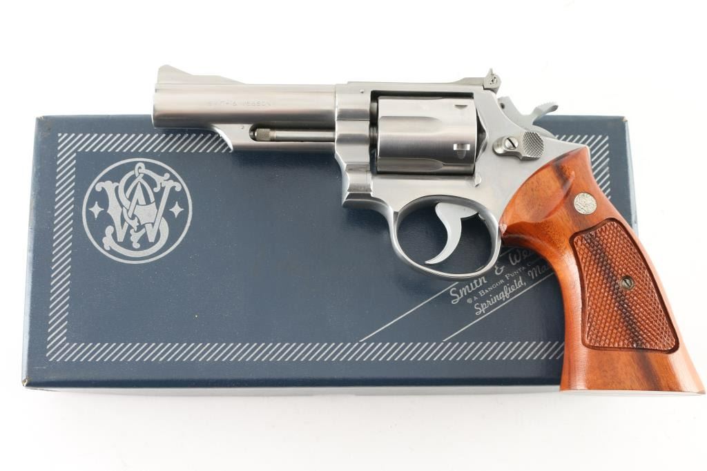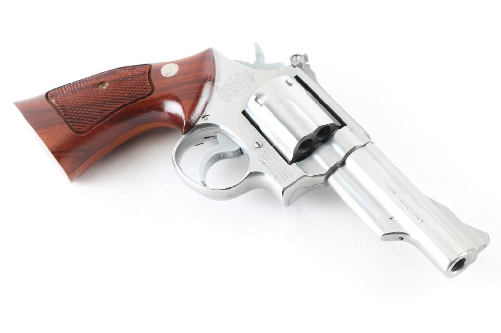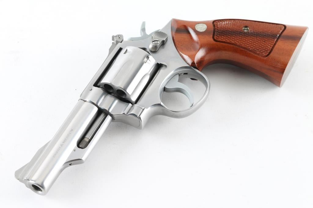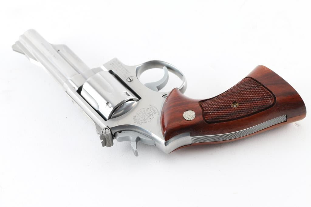 'No Dash - Pinned & Recessed' Stainless steel double action Magnum K frame revolver manufactured circa 1973. Features stainless steel construction, checkered hammer spur, grooved narrow trigger, checkered target grips with exposed backstrap & S&W medallions, 4" barrel with shrouded ejector rod, ramp front and micro-click adjustable rear sights, grooved backstrap, square butt frame. Rear sight assembly is stainless steel. Overall like new condition with few minor handling marks, hardly any drag line on cylinder. Includes matching two piece blue S&W box with factory paperwork and bagged cleaning kit. Condition is NRA Excellent - like new *** Modern Firearm ***