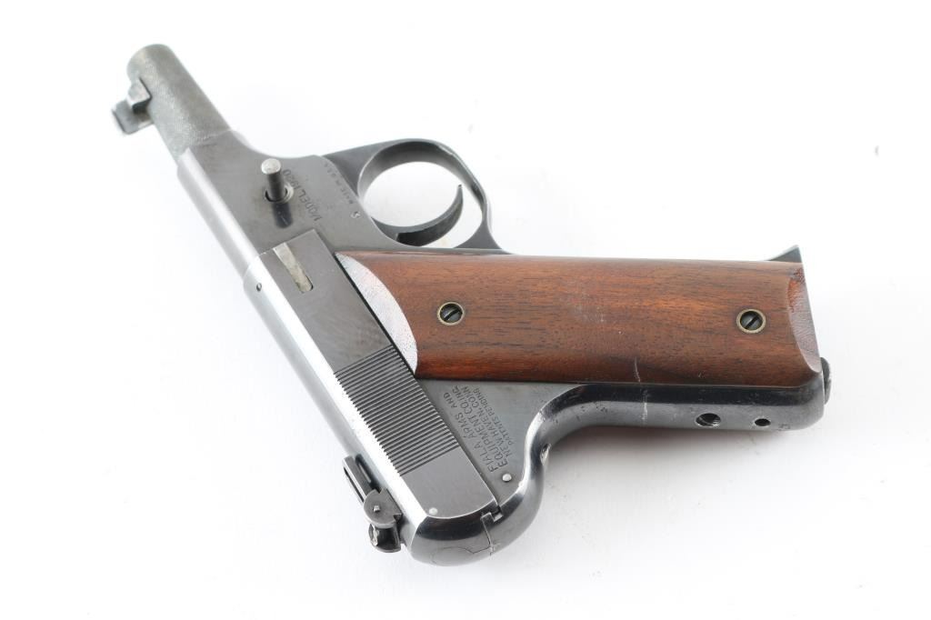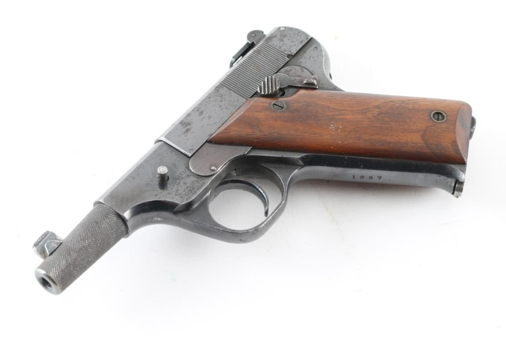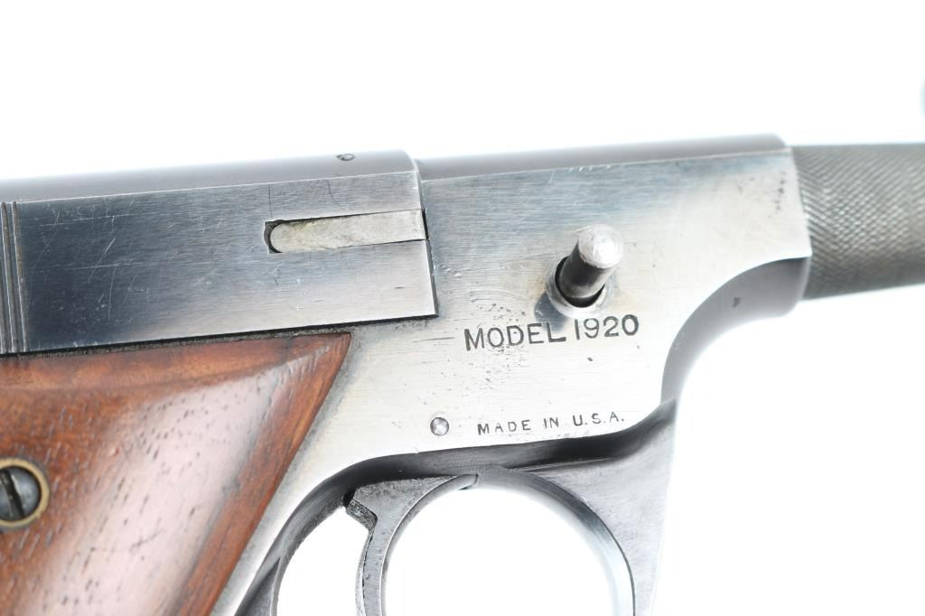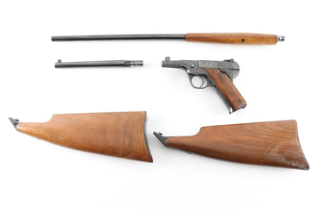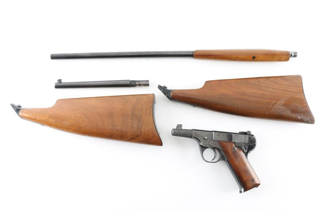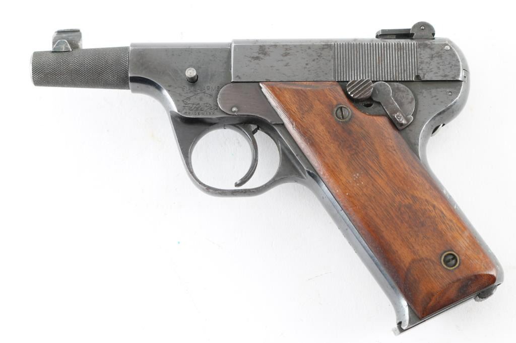 Manufactured only a few years , starting in 1920, with production estimates at about 5000. Looking similar to the Colt woodsman, and the Hi-Standard Model B, this pistol is not a semi-auto, but a manually operated repeater, the magazine functions as with any semi-auto, but the slide remains locked during & after firing .until you depress a button on the left frame which releases the slide to be manually retracted and returned to battery for the next shot. 21" barrel with front blade, and folding peep, notch rear sights. Detachable smooth walnut shoulder stock, grips, and forearm. Bore is very good/bright, action is smooth, Wood is very good with some finish loss on the right shoulder stock, blued finish is about 85% with edge wear and scattered minor pin-prick pitting, and spots of rust. All markings are sharp. Comes with a 7 1/2" barrel, a knurled 3" barrel, and spare shoulder stock, all in very good condition. The fitted case that these came in are longer with us. A rare pistol. NRA Condition-near Very Good. C&R Firearm.