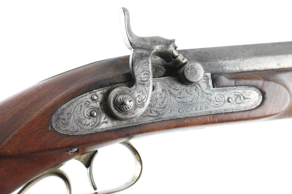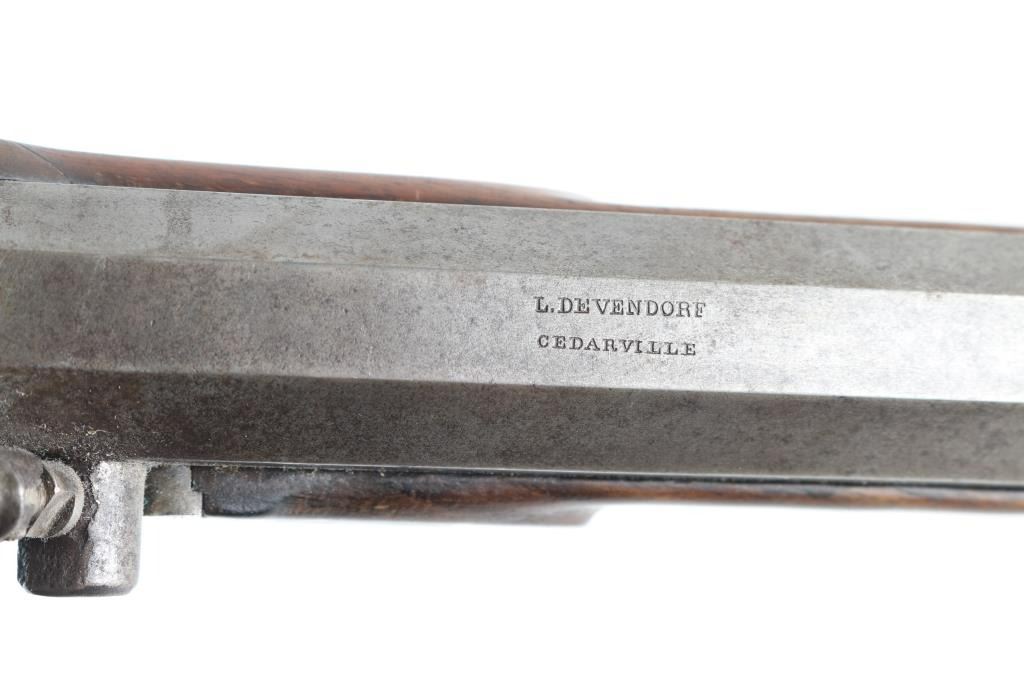 Lewis Devendorf was a known Pennsylvania maker of target rifles used in long range competition. Circa 1840-Civil War. C. Baker marked lock plate, The Bakers of Pennsylvania gunsmiths who invented/developed the Kentucky rifle. Features a 33" octagonal/round barrel with windage adjustable front sight, and elevation adjustable sporting rear sights. Half stock with brass furniture, crescent buttplate, Marked "L. Devendorf, Cedarville" on top of barrel. Wood ramrod present, One cock action works well. Metal finish has turned to a gray/brown patina, Marking are crisp/clear. Stock might be a newer replacement. There is damage/loss to the hammer cup. Someone has added a machined steel 1" barrel extension at the muzzle with a post sight, There is a slight crack on the left stock above the trigger. NRA Condition-Good. Antique Firearm.