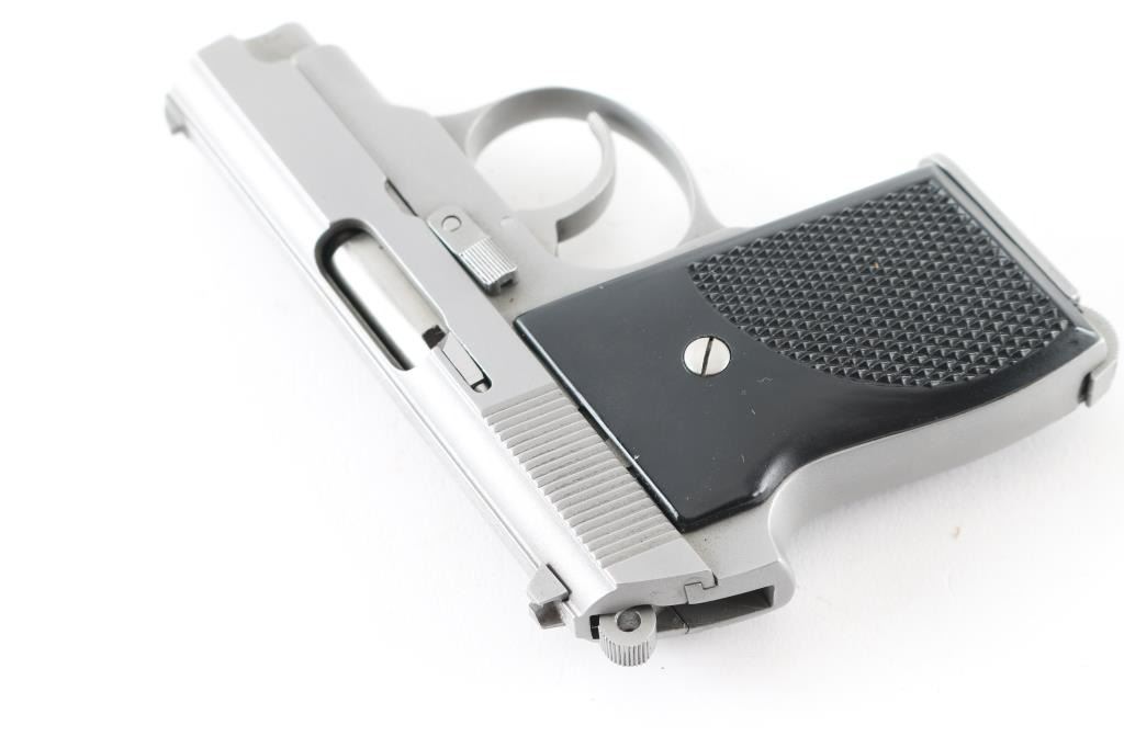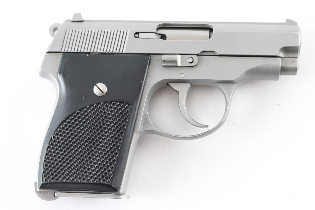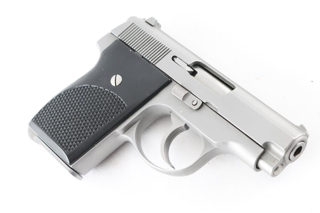 Compact double-action pocket pistol. 3" barrel, 5" overall. Slide mounted blade, notch sights on serrated rib. Slide mounted safety/decocker. Serrated cog hammer. Satin stainless steel finish, black plastic grips. Bore is excellent. Pistol shows very little signs of use. NRA Condition-Excellent. Modern Firearm.