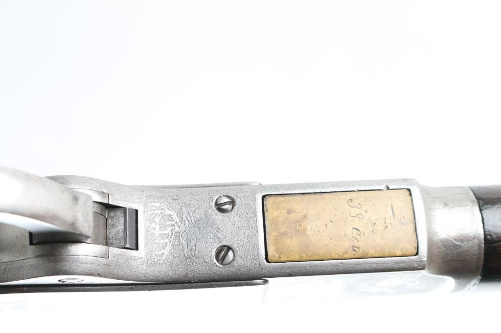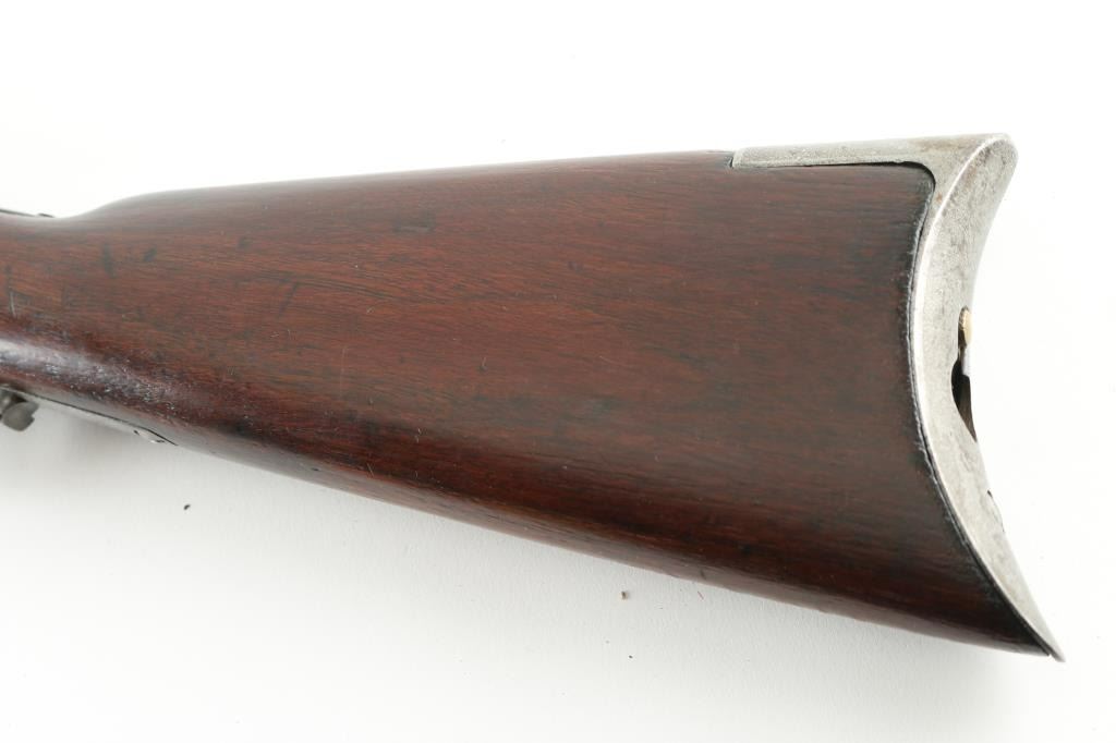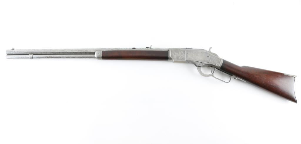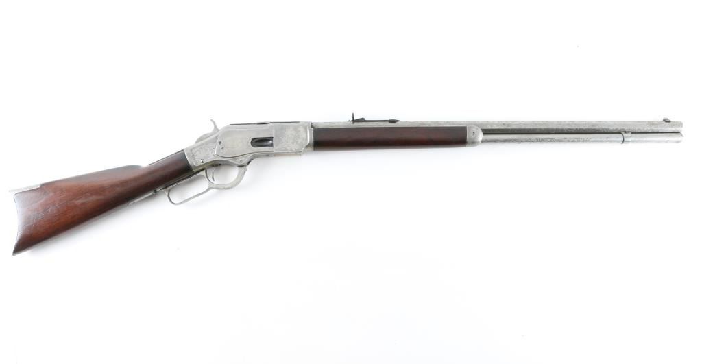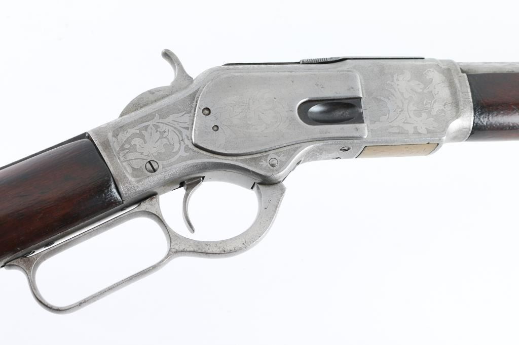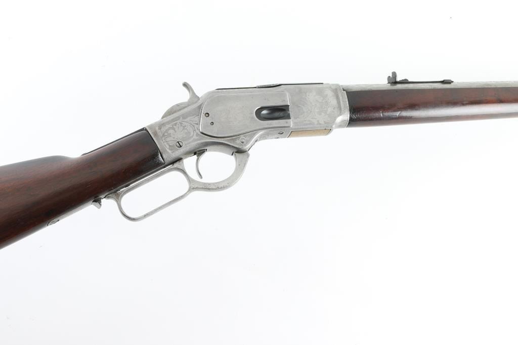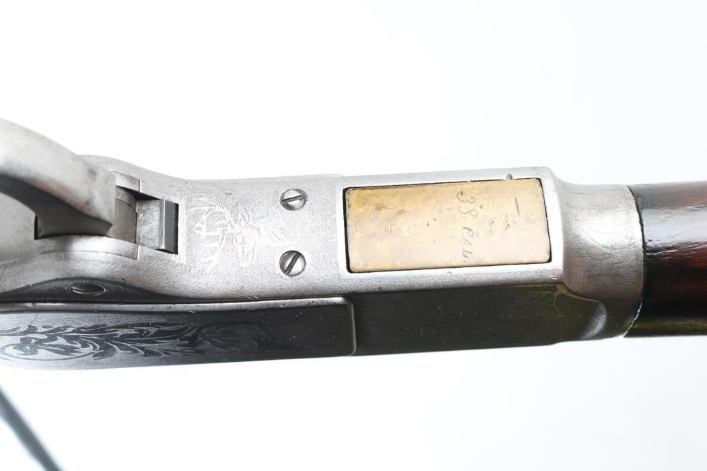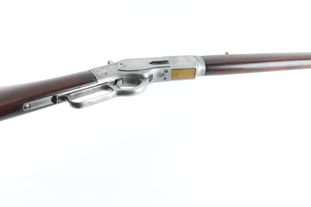 Lever action rifle manufactured circa 1890. Features 24" octagon barrel, full length magazine tube, buckhorn sights, straight grip, lever lock, sliding dust cover, steel crescent buttplate with trap & sliding door. Bore is fair condition, dark with even tiny pits, shallow rifling. Metal surfaces are bare metal, with nearly full coverage floral engraving applied with an etching process, showing a contrast between smooth surfaced features over a stippled appearing background. Forend is good condition, varnished, with dents & dings. Butt is good condition, varnished, fair fit to metal, some shrinkage, possibly sanded. Markings are clear & readable. Action operates smoothly. Condition is NRA Good++ *** Antique Firearm ***