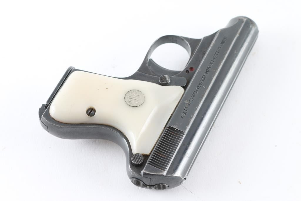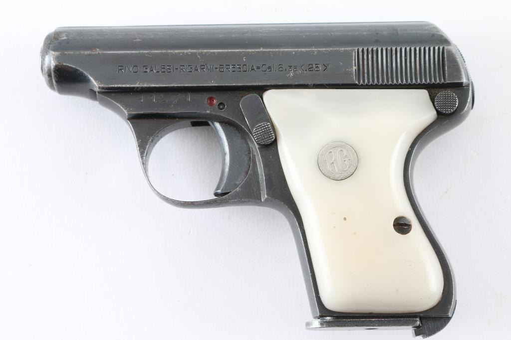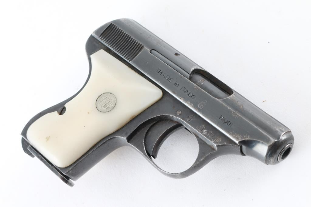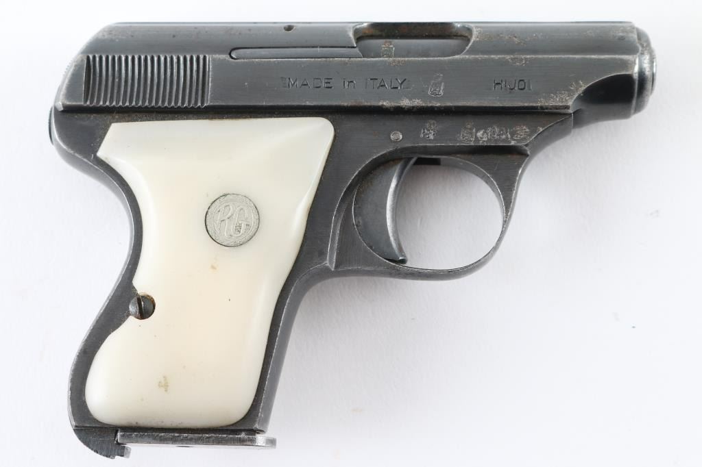 Italian made single action semi automatic pocket pistol chambered in 6.35mm. Manufactured circa 1958. Features a blued plated finish, 2.3" barrel, smooth trigger, manual safety on left side of frame, heel magazine release, six round magazine, and two piece white plastic grips with 'RG' medallions. Pistol exhibits approximately 80% of its original blued finish with edge/.handling wear, scratches, and some areas of pin-prick pitting. Action performs well, bore is fair, dark, dirty, may improve with cleaning, plastic grips are good, except right grip has a small chip out of it by the screw. NRA Condition-Fair to Good. C&R firearm.