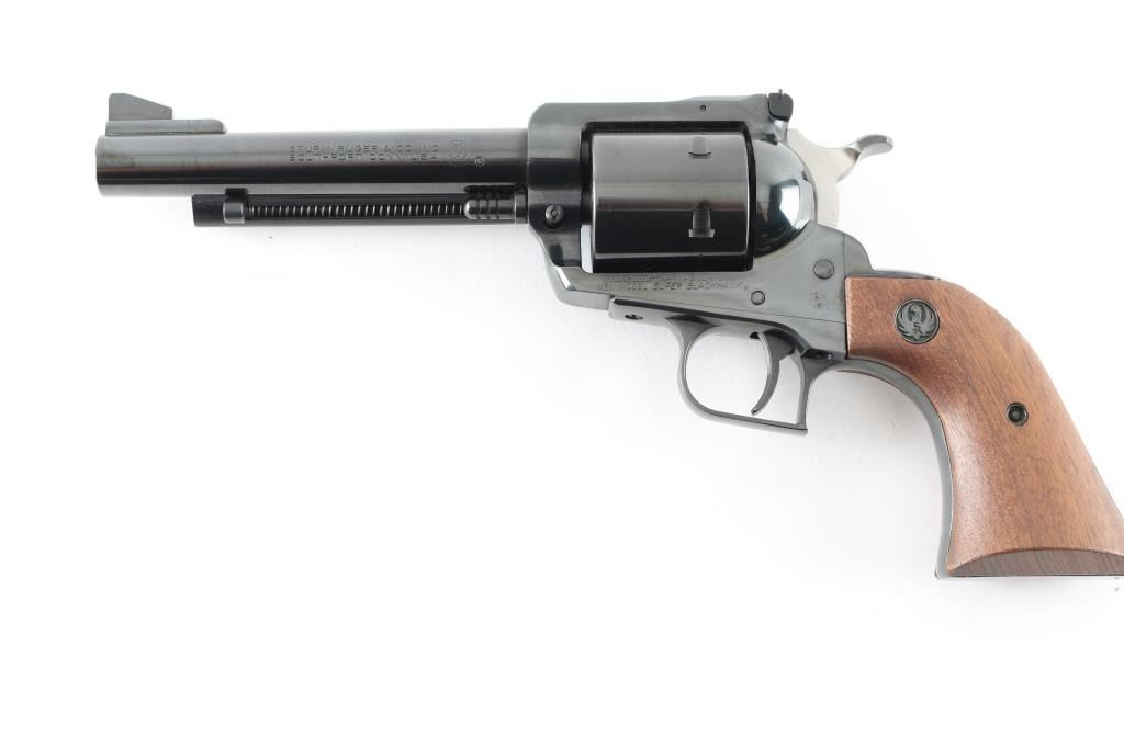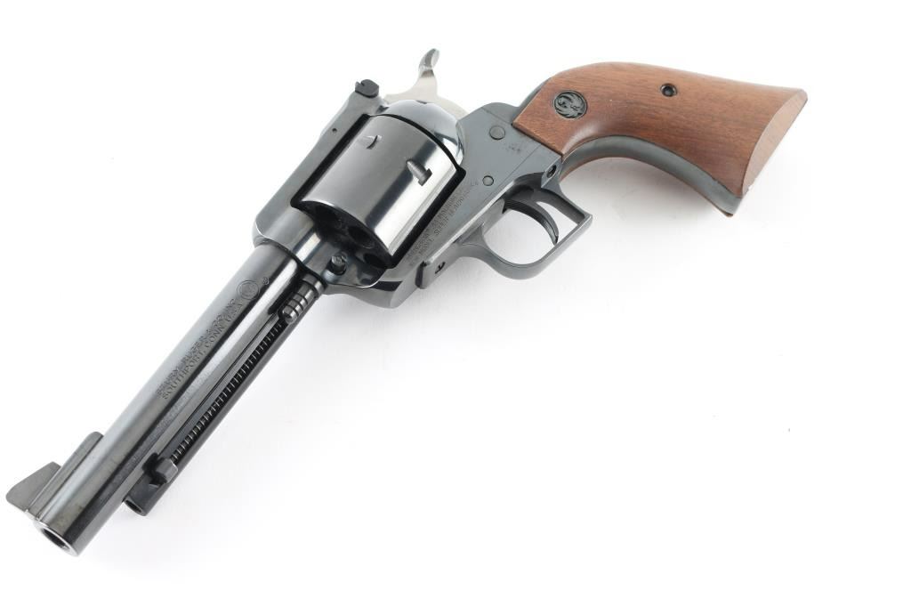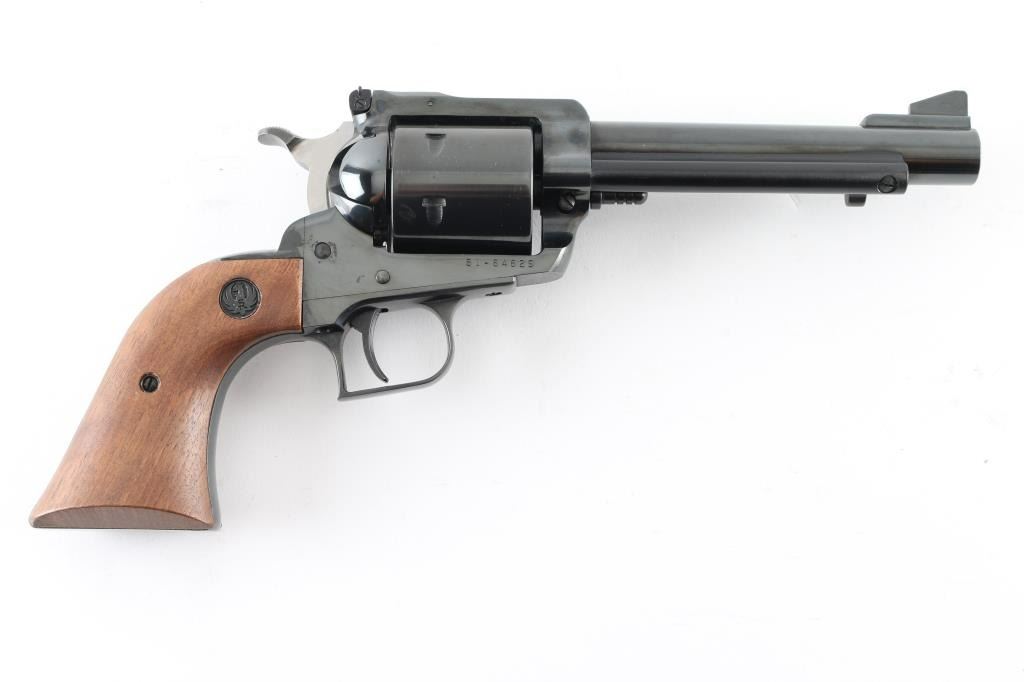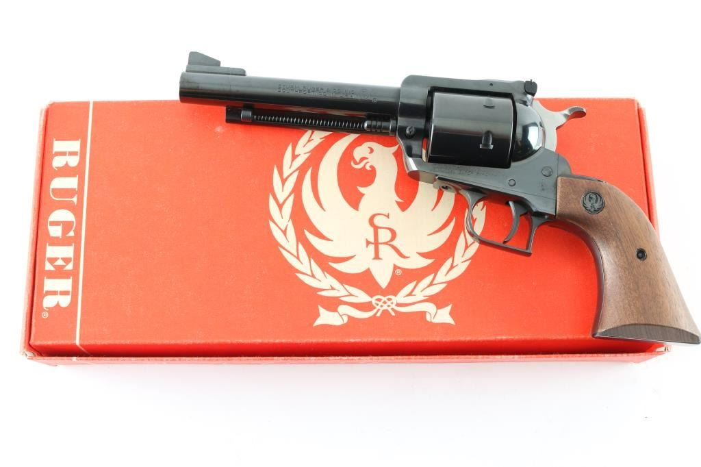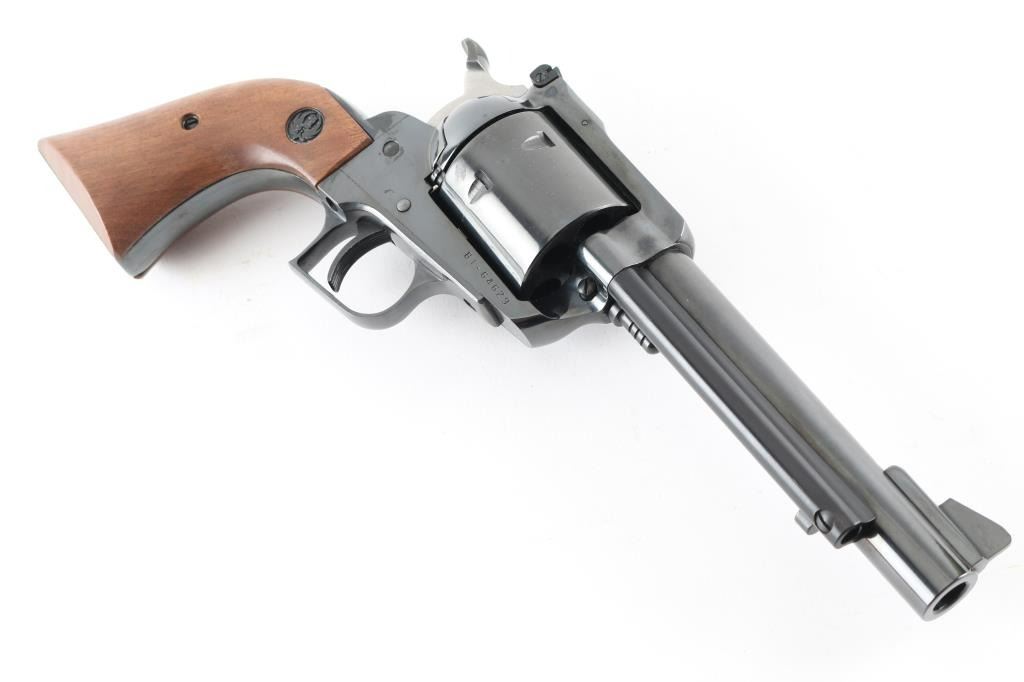 SN 81-64629 Single action revolver manufactured circa 1976. Features blued finish, smooth wood grips with Ruger medallions, adjustable sights, 5.5" barrel, square back triggerguard, 6 shot unfluted cylinder. Bore and cylinder charge holes are in excellent condition. Retains 95% finish with minor blemishes to sides of frame near grips, light handling marks. Includes red cardboard Ruger box and plain cardboard shipping sleeve. Condition is NRA Very Good++ *** Modern Firearm ***