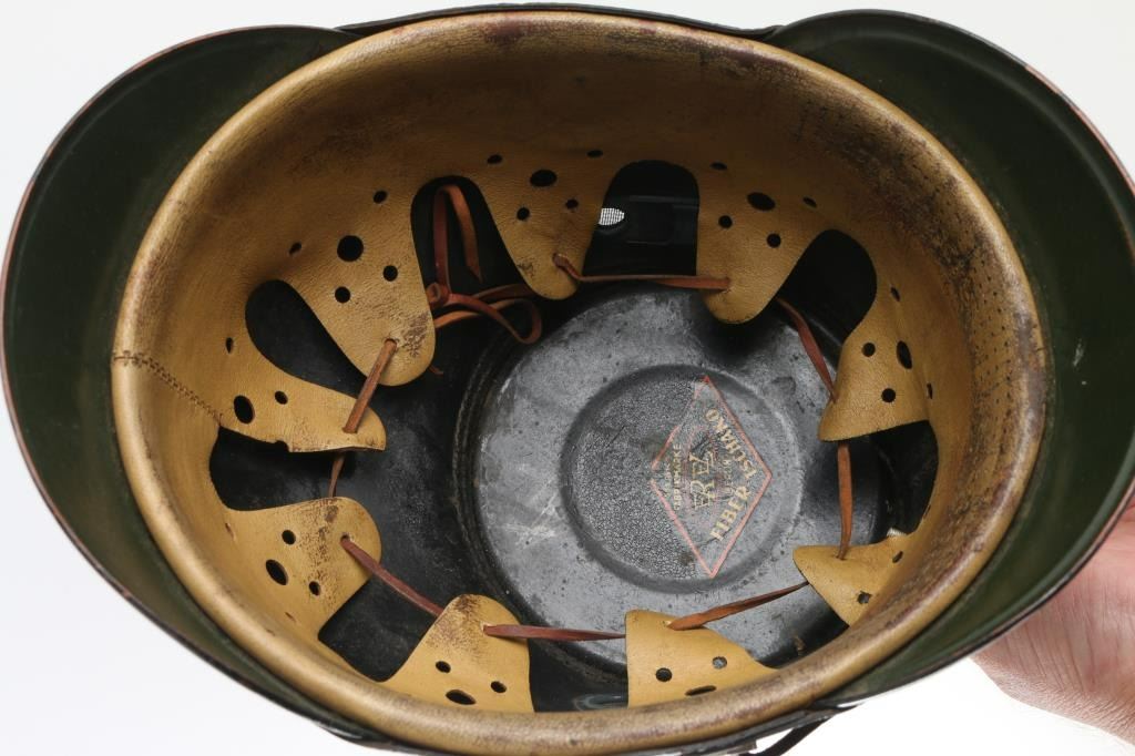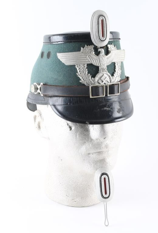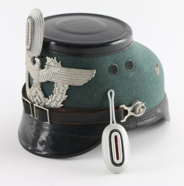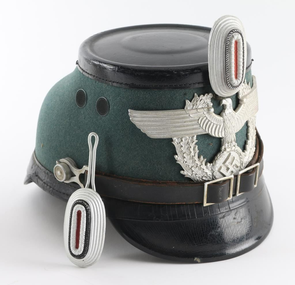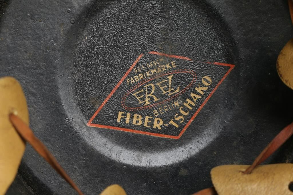 Original German WW2 M36 Police Shako, maker is Erel, Berlin in vibrant colors inside of crown. Nine lobe tan leather liner is intact. Green felt has no moth nips, there is what appears to be a spot of dried glue on the left side of shako. Cockade marked "Nowa 39". Some scuffs to the visor. Overall a very nice conditioned M36. Comes with extra cockade, maker marked, with "D.R.G.M." dated 1942.