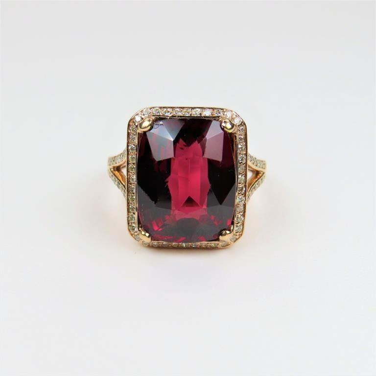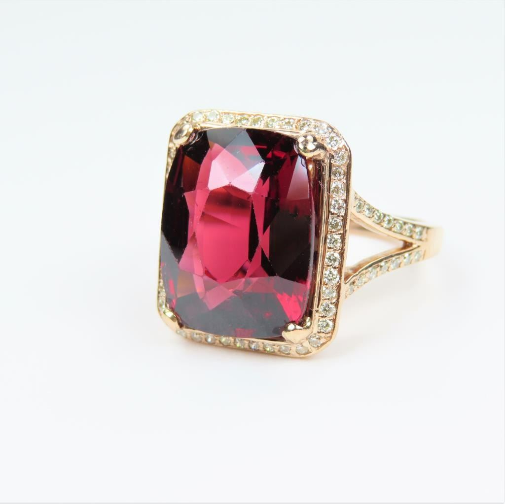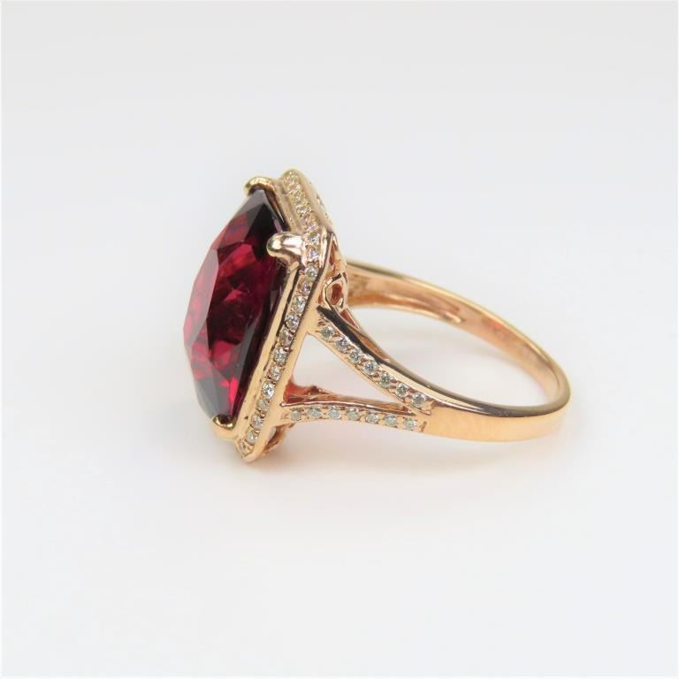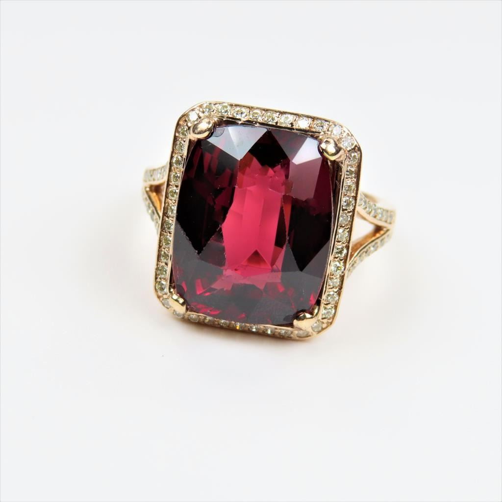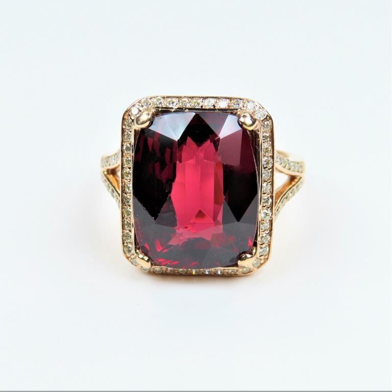and Diamond Ring featuring a Fine intensely colored cushion cut Red Garnet weighing approx. 12.00-14.00 carats framed with 72 fine cut Diamonds weighing approx. 0.70 carats with G-H colors and VS clarity set in an elegant 14 karat Rose gold setting. Retail $5,000-$6,000