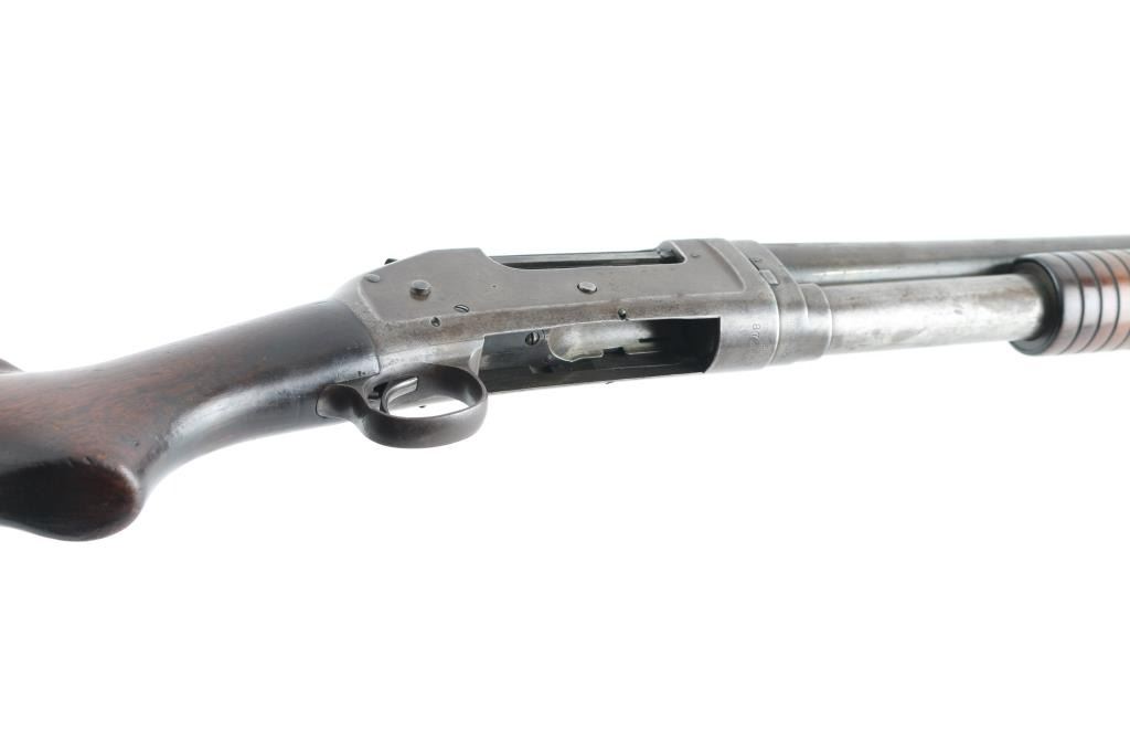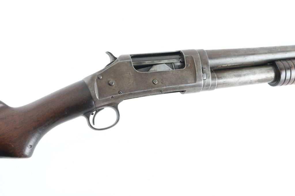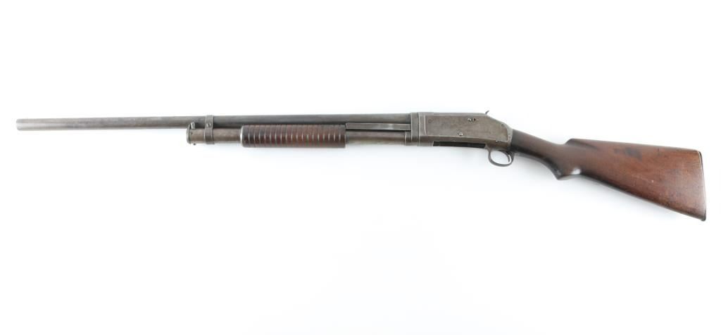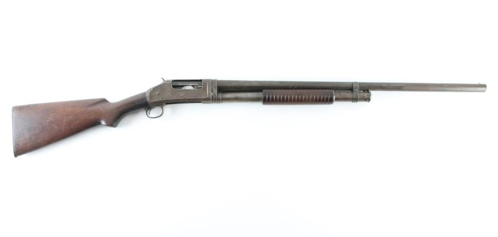 Vintage slide-action repeating shotgun chambered for 2-3/4" 12 gauge shells, manufactured in New Haven, CT circa 1940. Features full choked 30" take-down barrel, 5 round tube magazine, steel bead front sight, smooth trigger, exposed hammer with knurled spur, steel receiver, grooved walnut slide handle and smooth semi-pistol grip shoulder stock with factory butt plate. Bore is good condition. Metal surfaces show a mottled brown and gray color, light patina and small areas of pitting throughout, some rough texture, dings in metal. Wood is good condition, dented and gouged. Buttplate appears a newer replacement with fit being a little off. Action is stiff, maybe dried grease, a good cleaning might help. Number on receiver extension is shallow, matches receiver. Condition is NRA Good *** C& R Firearm ***