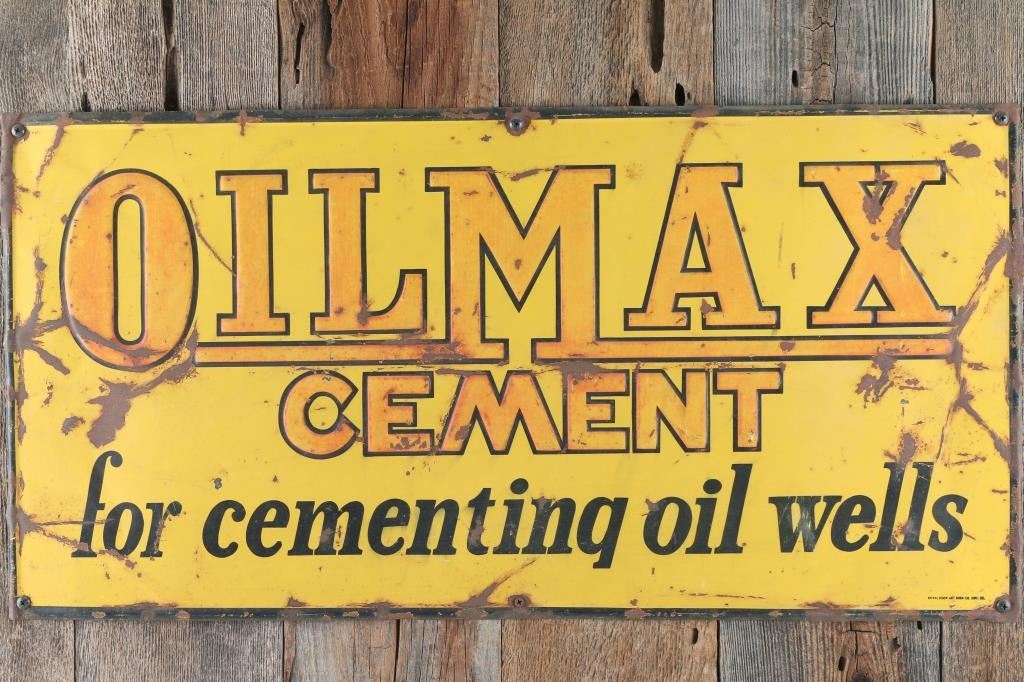 Mounted on wood planks1940's OILMAX CEMENT metal store advertising sign. It has the slogan "for cementing oil wells". Bottom right of sign says "Donaldson Art Sign Co. Cov. Ky" It is in good condition. Has embossed lettering. The colors are black, red, and yellow. Measuring 24x35
