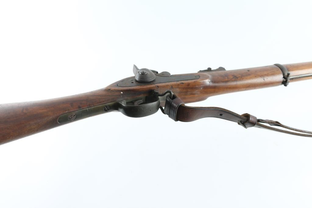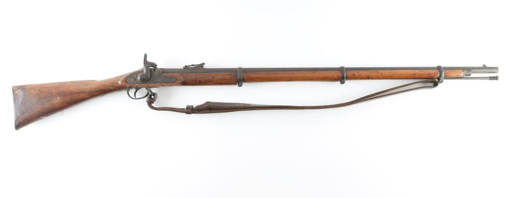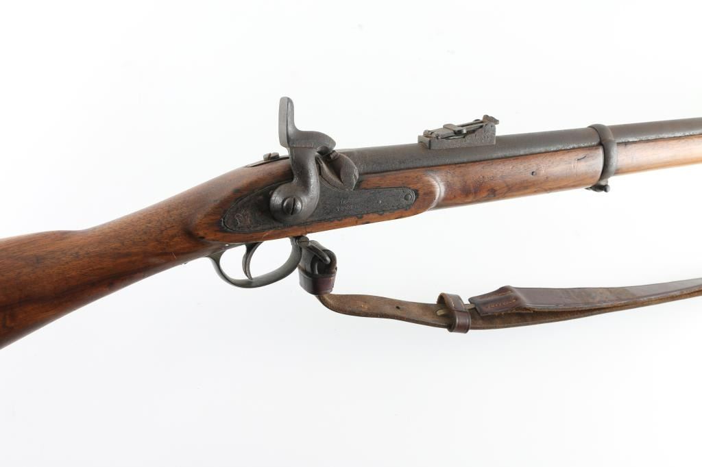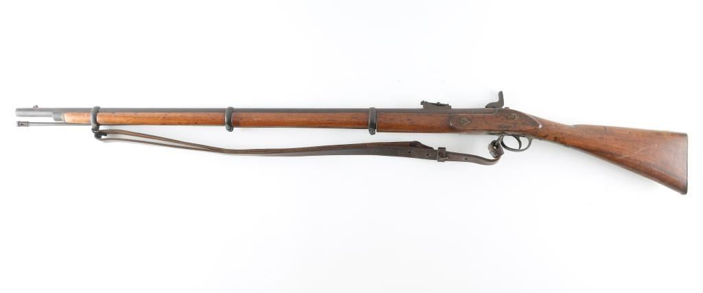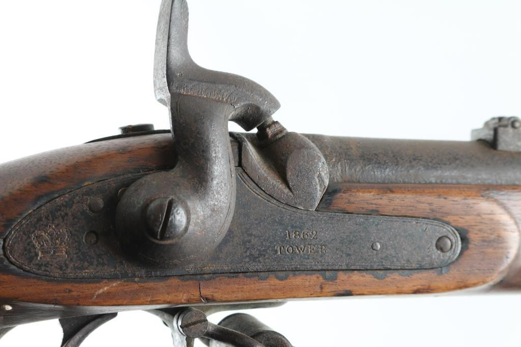 Enfield rifled musket by Tower Armory with brass mounts dated 1862. Cartouche visible in small oval on left side of stock behind screw showing J.C. in fancy script letters. Even dark patina with light to moderate rust and surface erosion. Markings clear and visible on lock. Full series of British proofs on left side of the barrel with numeral 25. The stock is good with normal wear and small imperfections including a small stress crack beneath the lock,dings marks and scratches. Correct rear sight and rod and retained actions works well and tight. Sling is of a later date included. Bore is dirty,but shows riffling and may clean up well. A strong 7-7.5 on a 10 scale with uncleaned "Out of the attic" patina. Probably a U.S Import and inspection. Antique Firearm