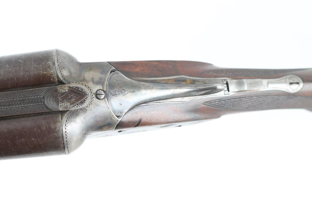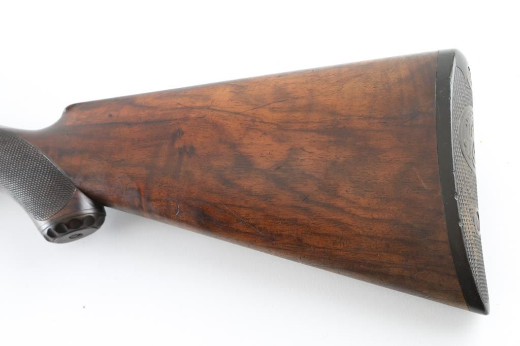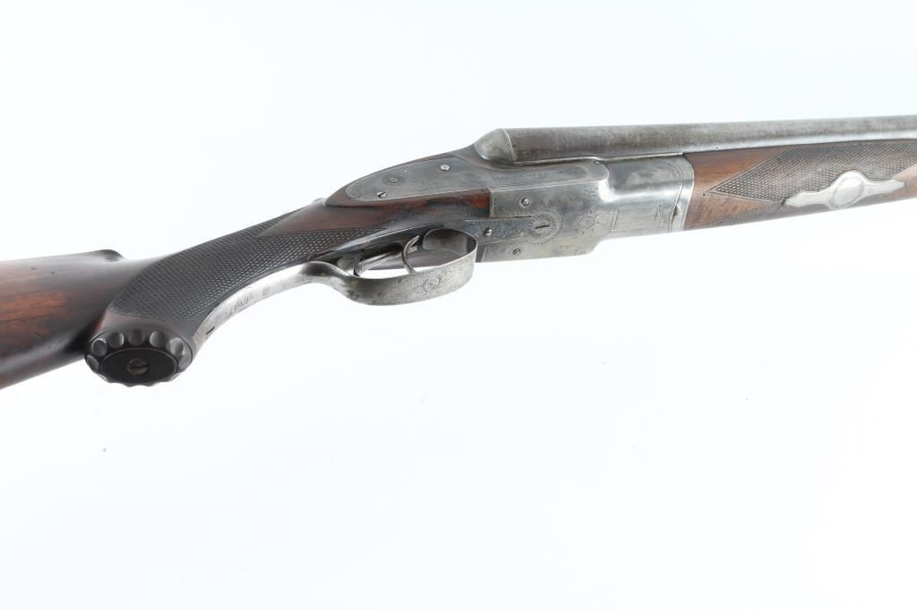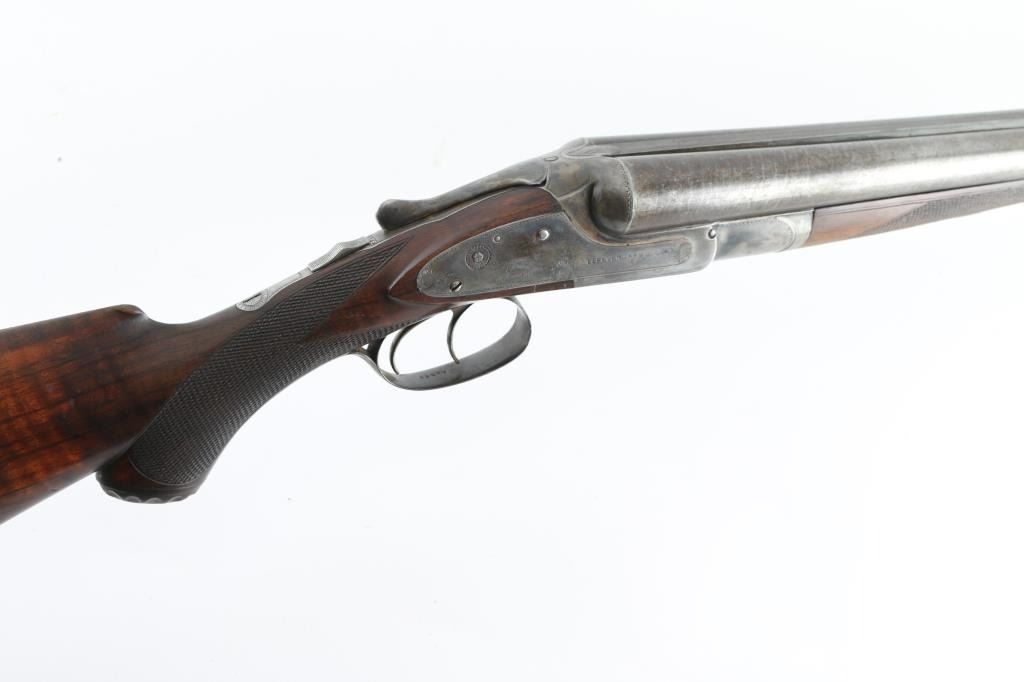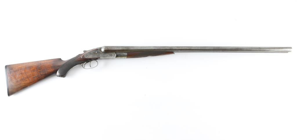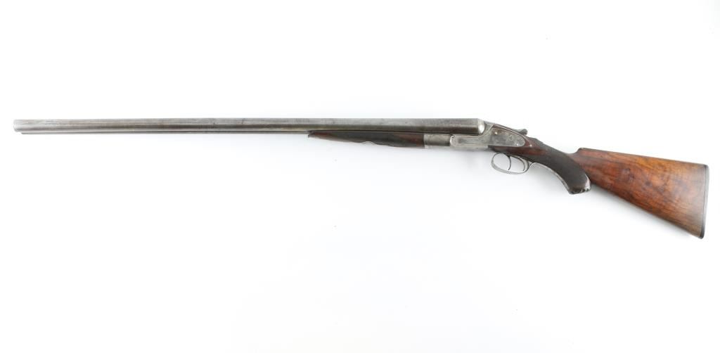 'E Grade' Vintage American made double barrel sidelock hammerless shotgun chambered for 12 gauge shells, circa 1890. Features 30" damascus barrels with a raised solid rib, IM chokes, auto ejectors, brass bead front sight, double triggers, checkered top lever, sliding tang safety, English walnut wood forend and pistol grip shoulder stock with factory buttplate. Checkering on forearm, and wrist, horn grip cap. Serial numbers match on the receiver, and lower tang. Could not get the forearm off. Patent dates on the triggerguard. Very effective scroll design with a hunting dog handsomely executed on each lock plate. Barrels exhibit beautiful damascus patterns with a brown patina and receiver is in the white with graying patina and traces of a case hardened finish. Action is crisp, bores are very good and stocks are fine. A very nice example of an early American hammerless shotgun. NRA condition-Very Good. Antique Firearm.