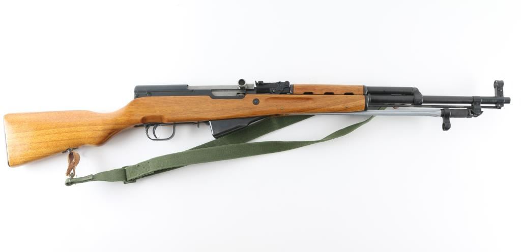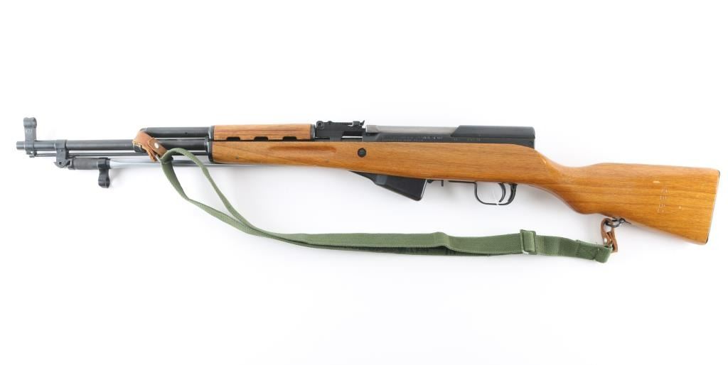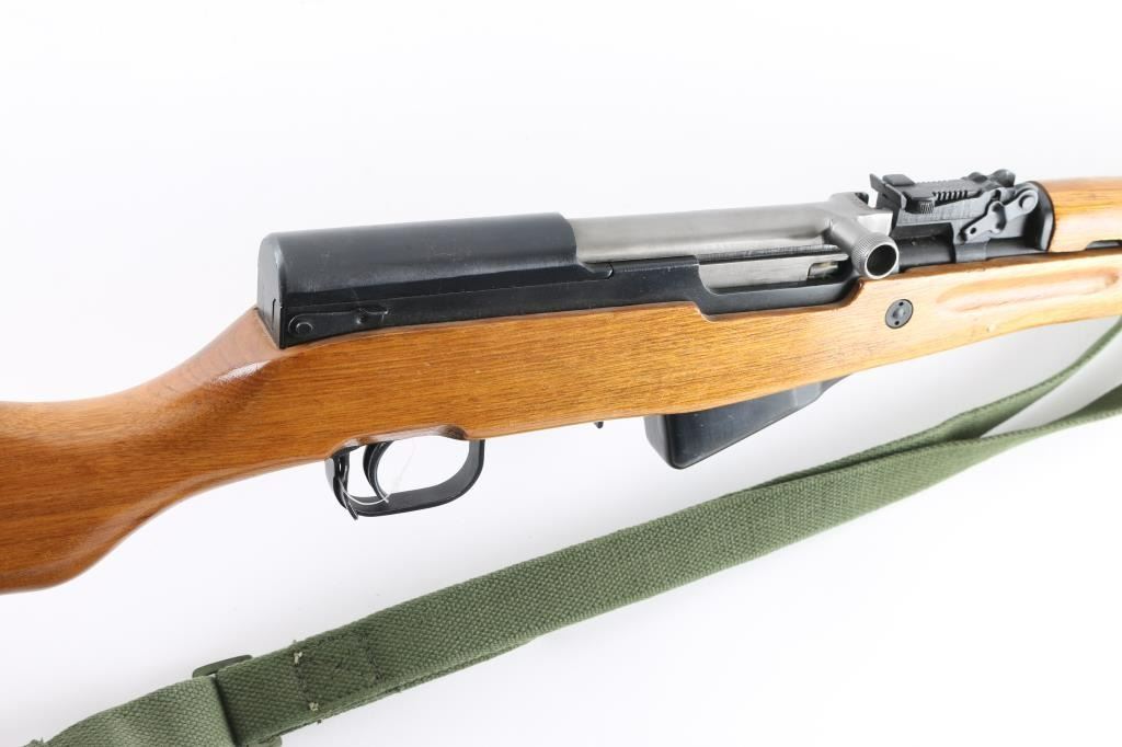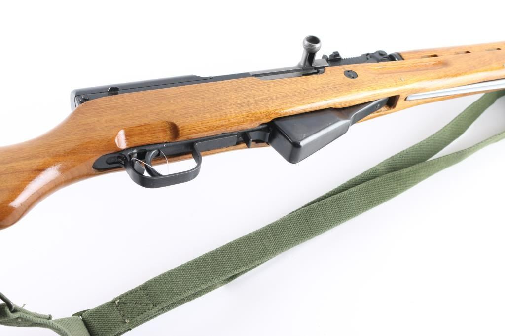 Chinese semiautomatic rifle features blued finish, smooth wood stock & handguard, 20" chrome lined barrel, folding spike bayonet, cleaning rod, protected post front sight, tangent rear sight, manual safety, cleaning gear in butt trap, fixed 10 round magazine. Later style features such as pinned barrel & stamped trigger guard. Bore is bright & shiny. Retains 95% finish with handling marks and edge losses. Wood is very good with minor blemishes to varnished finish. Serial number repeated on bolt carrier & butt of stock. Included very good condition green cotton web sling with leather end tabs. Condition is NRA Excellent *** Modern Firearm ***
