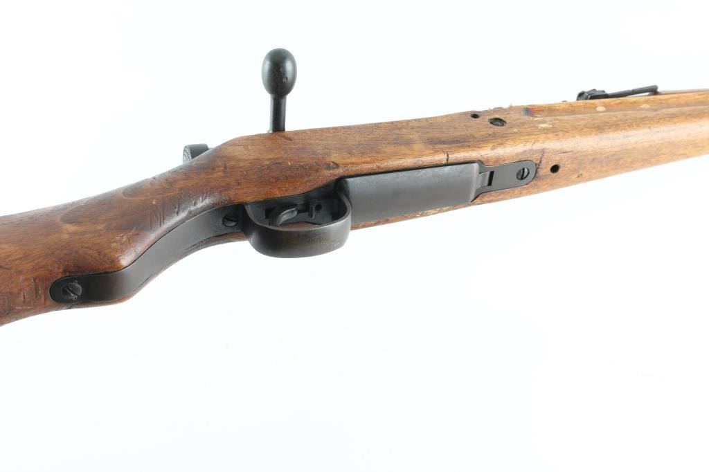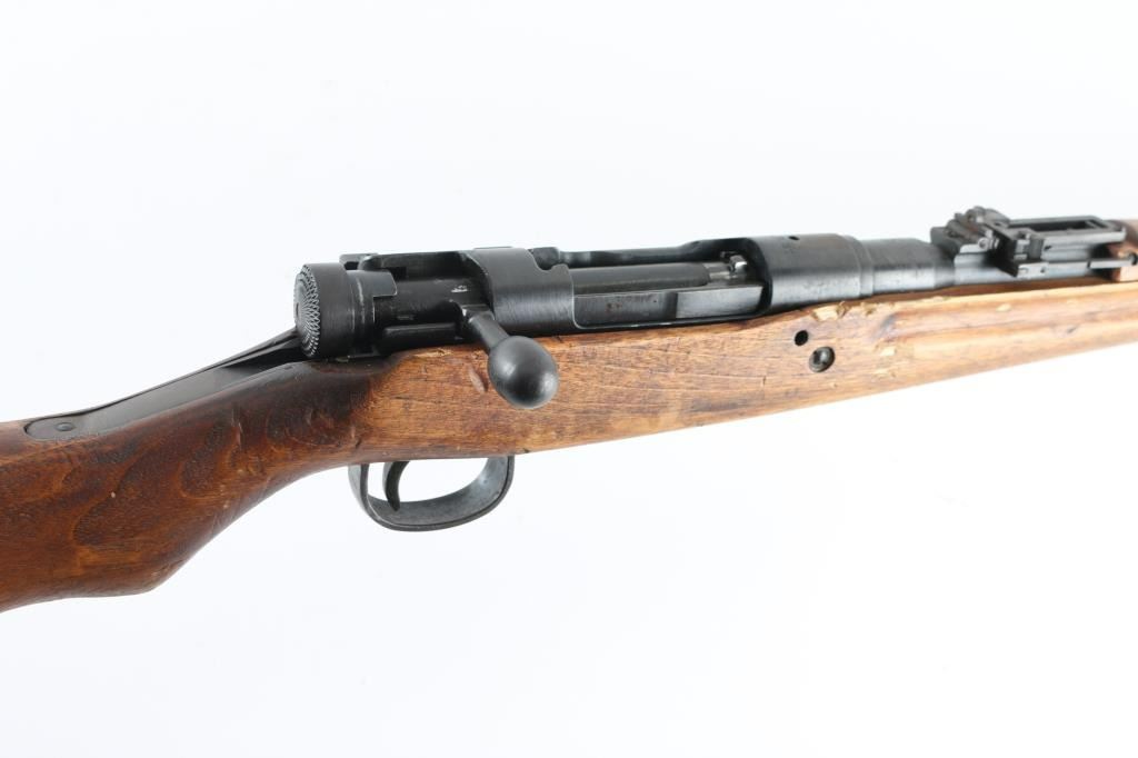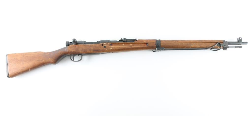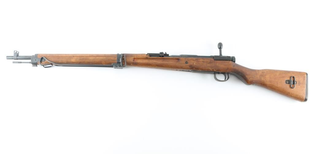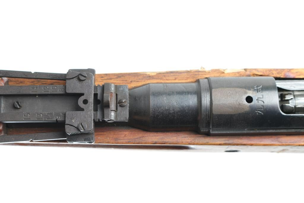 Japanese military bolt action rifle circa 1939-1945, appears to be a 20th Series (series mark light and slightly distorted), earlier production rifle, Long Life. Features 25.5" barrel, protected blade front sight, folding ladder rear sight with Anti-Aircraft wings, cleaning rod, monopod. manual safety, sling swivels. Cleaning rod and monopod appear to be reproduction replacements. Chrysanthemum is ground. Bolt and safety knob numbered "076", extractor is numbered "371" (on a 20th series this should be an assembly number, not related to serial), firing pin not numbered. Missing magazine follower. Chrome lined bore is very good. Retains full coverage of original bluing, some edge losses, rough brown metal where Mum ground off, with much thin patina brown on many parts (rear sight and bottom metal in particular). Very little original Urushi finish remaining, wood lightly sanded with eroded finger groove edges, some deeper gouges remain showing bare wood, small dents and dings throughout, overall good condition. Tight join at butt dovetail. Screw slots lightly marred, stake marks not aligned. Condition is NRA Good++ (missing follower) *** C&R Firearm ***