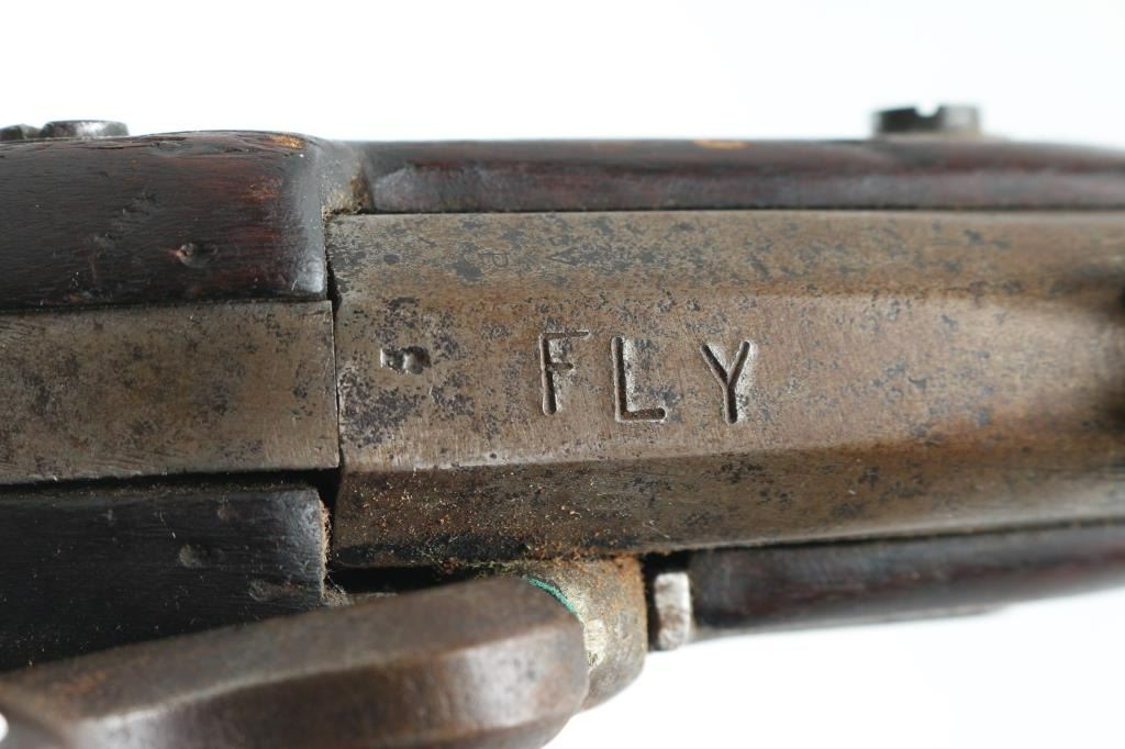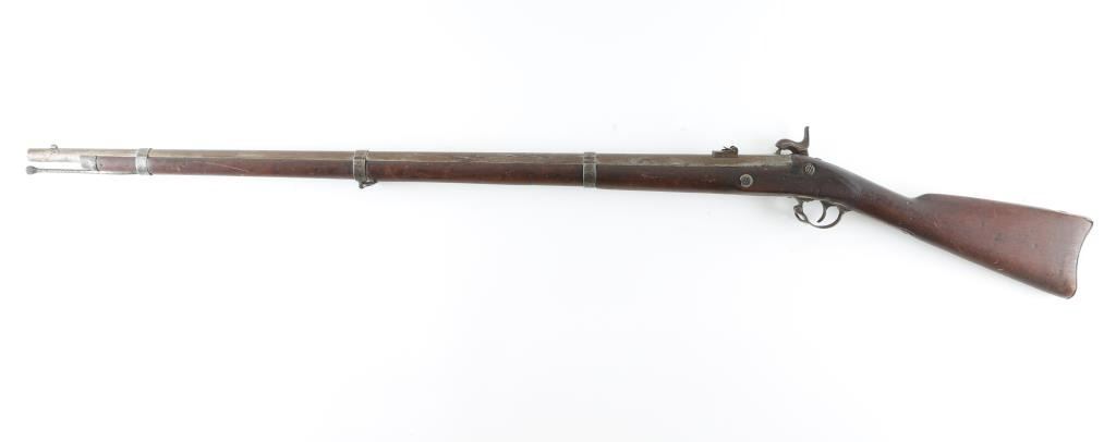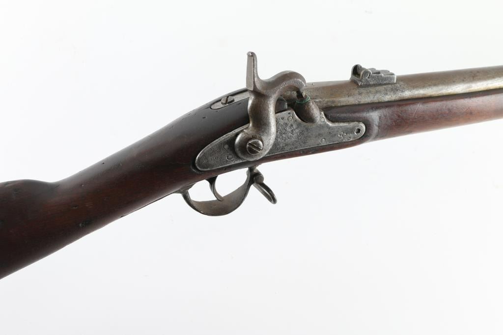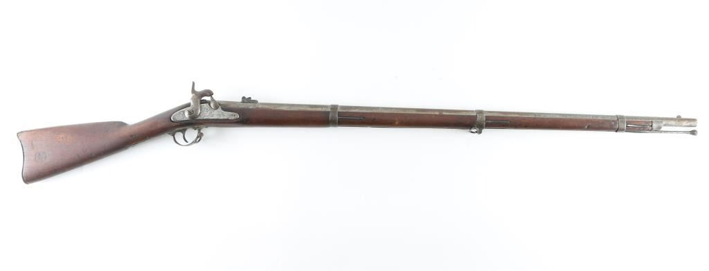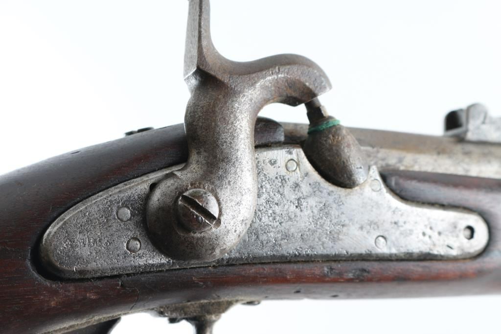 .58 rifled musket, dated 1863 on rear of lock showing period assembled parts and fly marking on lock and barrel. The hammer and the bolster do not appear to be original to manufacture, probably an armorer or gunsmith changed. scattered light to moderate pitting and erosion. Born is very worn and oversized. The stock has been cleaned and sanded. Works well and period ramrod. S marking on lock and remainder illegible. NRA fair to good. Antique Firearm