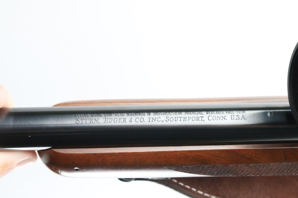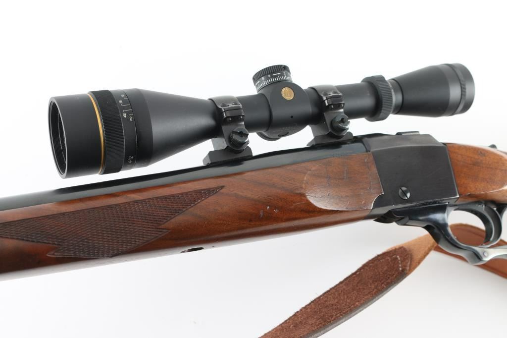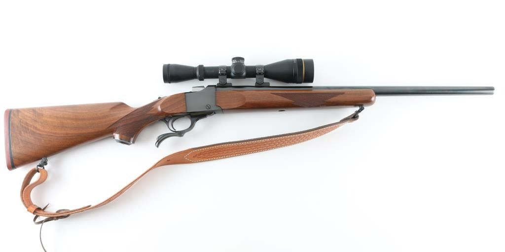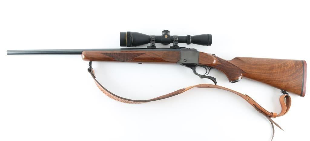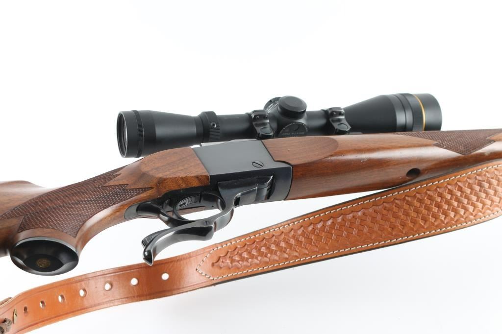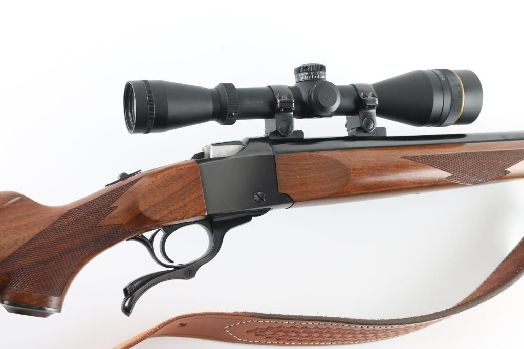 American made single shot, Falling-Block rifle chambered for .22-250 cartridges circa 1989. Based on John Farquharson's falling-block design that was patented in Scotland in 1872. It features a 24" blued barrel and receiver with no iron sights but is drilled and tapped. It has a serrated trigger, tang safety and smooth operating lever. The two piece walnut stocks, checkered at the wrist and forearm have a black metal Ruger grip cap, sling swivels and a red Ruger butt pad. Comes with a Leupold VX-2, 4-12X40 scope, rings, bases and a Triple K leather sling. Bore looks great, bright. Metal finish looks great. Wood stocks look pretty good with a few scratches and a tiny ding on the left side by the receiver. Overall very few signs of use, wear or handling. Condition is NRA Very Good+ --Modern Firearm**