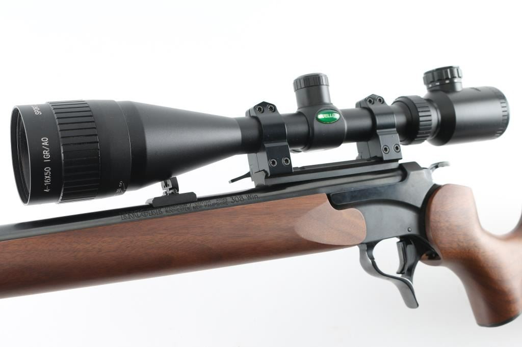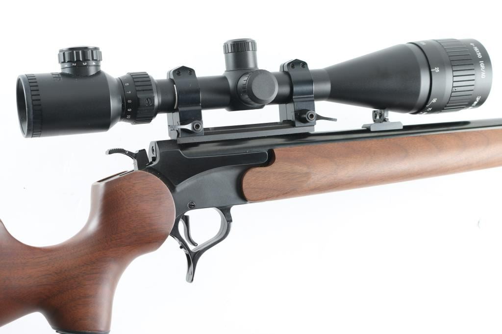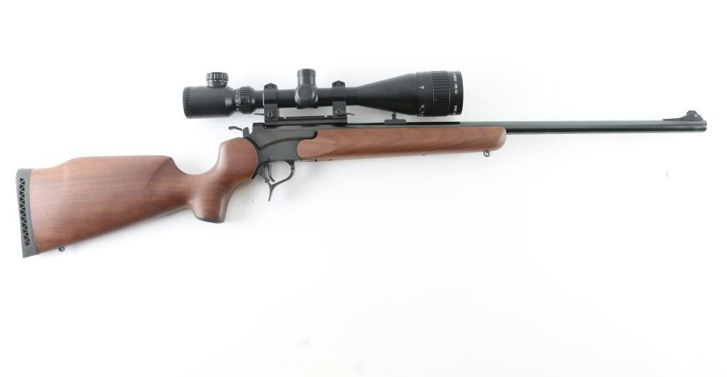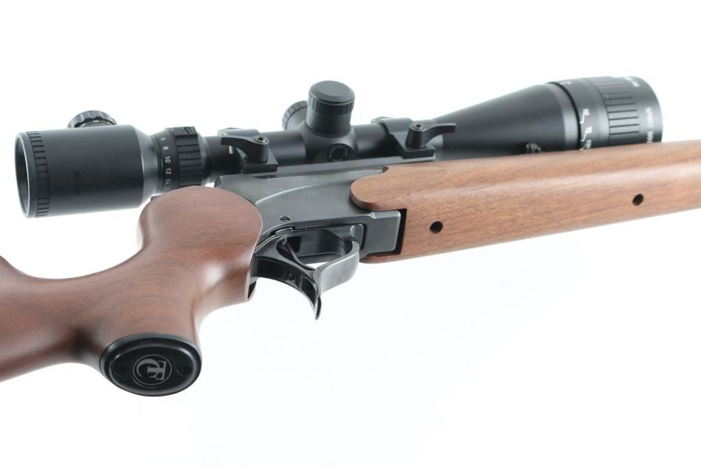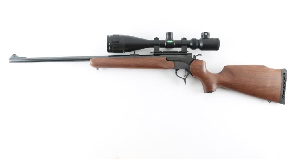 Single shot break open rifle features blued finish, 24" barrel, front post/porcelain bead, rear white triangle sights, smooth walnut forend & pistol grip stock, sling studs, vented rubber buttpad, triggerguard release for barrel, exposed hammer, scope base screwed to barrel. Mounted with a good condition Muller 4-16x50 IGR/AO Sport Dot sight. Bore is excellent. Blued finish is excellent. Wood is excellent Like new condition. Condition is NRA Excellent Modern Firearm.