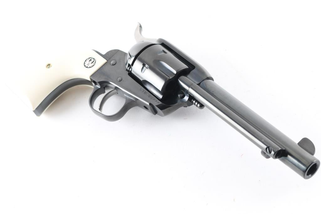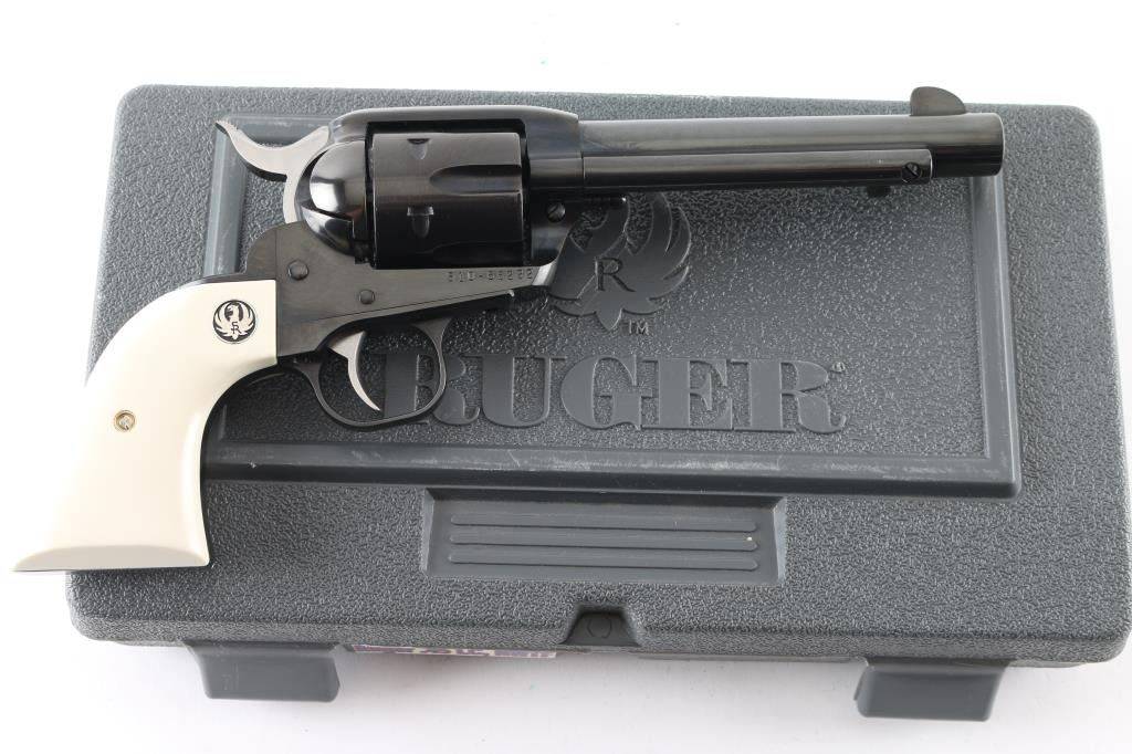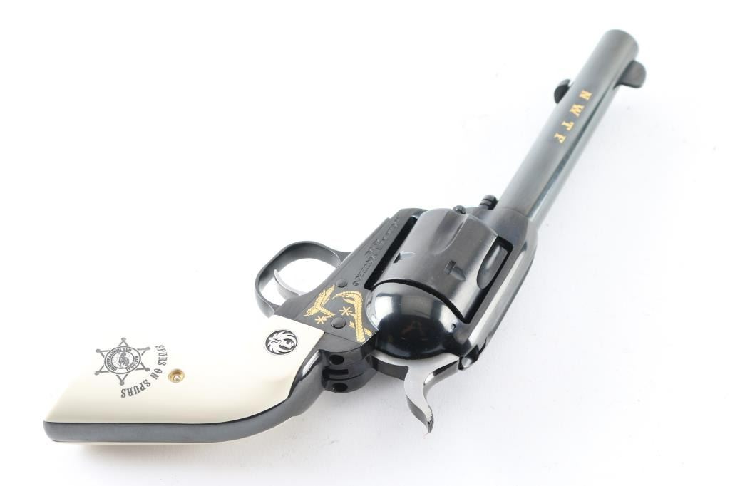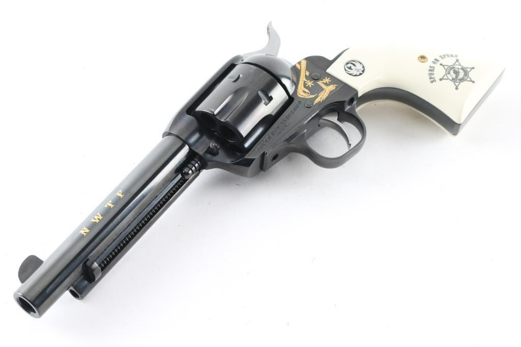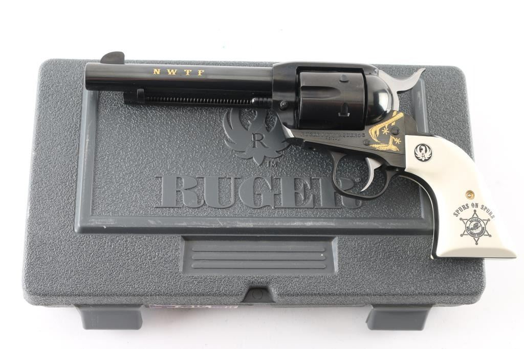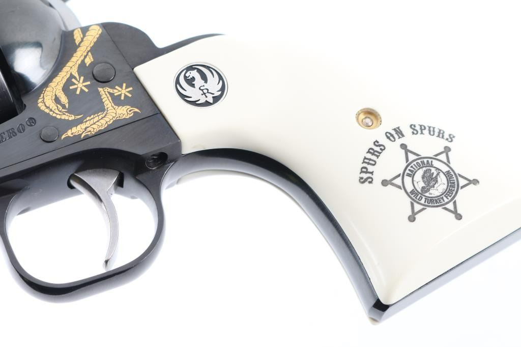 American made Single Action 6 shot revolver chambered for .45 Colt ammunition, circa 2008. This Special Edition "National Wild Turkey Federation" revolver has a blued finish with gold look accent turkey legs and the faux ivory grips read "Spurs on Spurs" with NWTF logo and Ruger medallions. NWTF is in "gold" on the left side of the barrel. It has a blade front sight, integral rear sight, serrated hammer spur with chrome sides and smooth chrome trigger. The blued finish looks great with one very small scuff on the ejector rod tube. The grips look great. Bore looks very good but needs cleaned. Comes with original grey plastic Ruger case and owners manual. Condition is NRA Excellent *Modern Firearm*