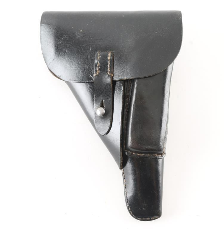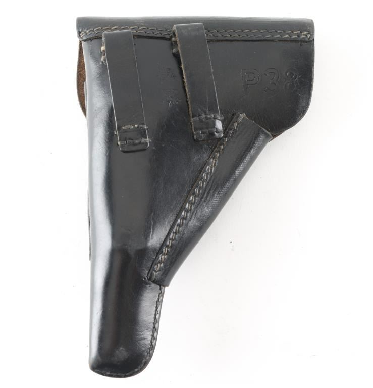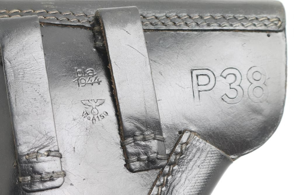 Third Reich era German Military holster for the P-38 Pistol. Soft shell. Black leather construction. Large "P.38" stamped on back, along makers code bla, (E.G. Leuner, Bautzen) 1944 and waffenamt, Eagle/WaW159. Intact, very good condition.