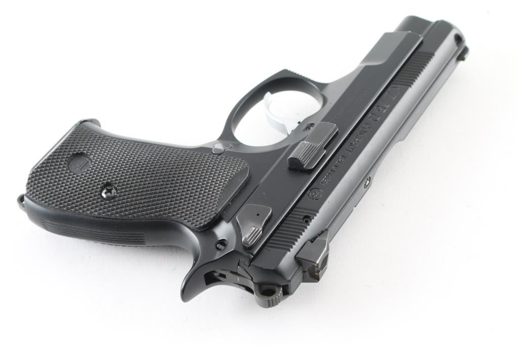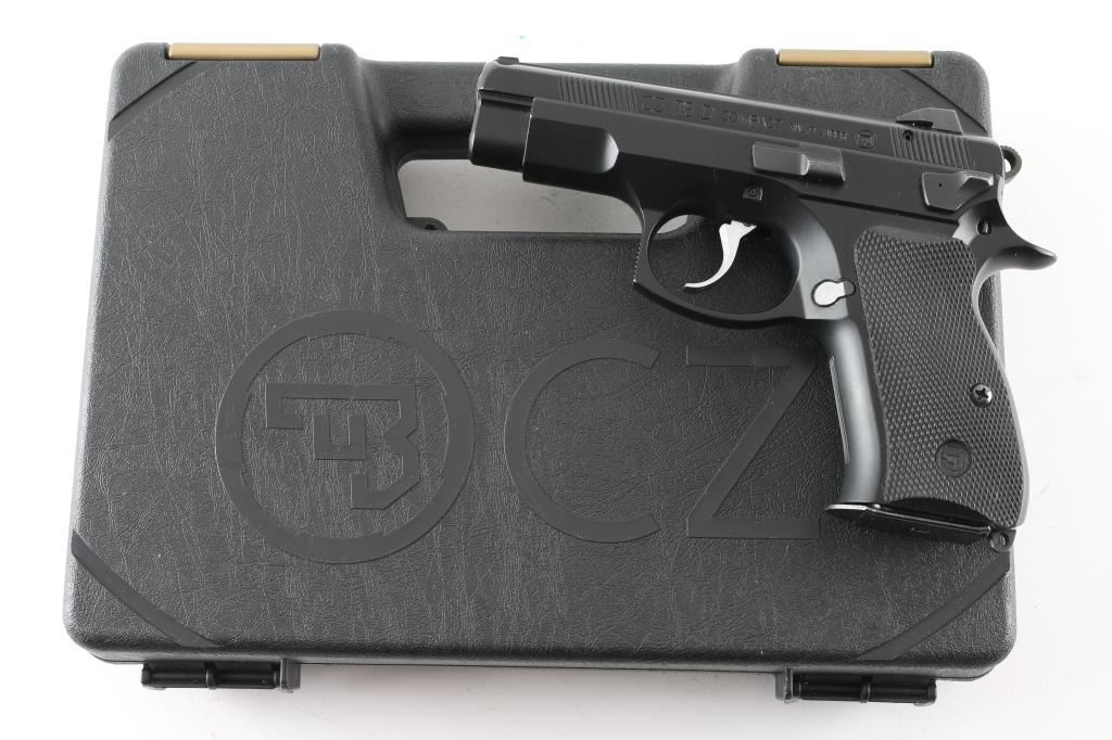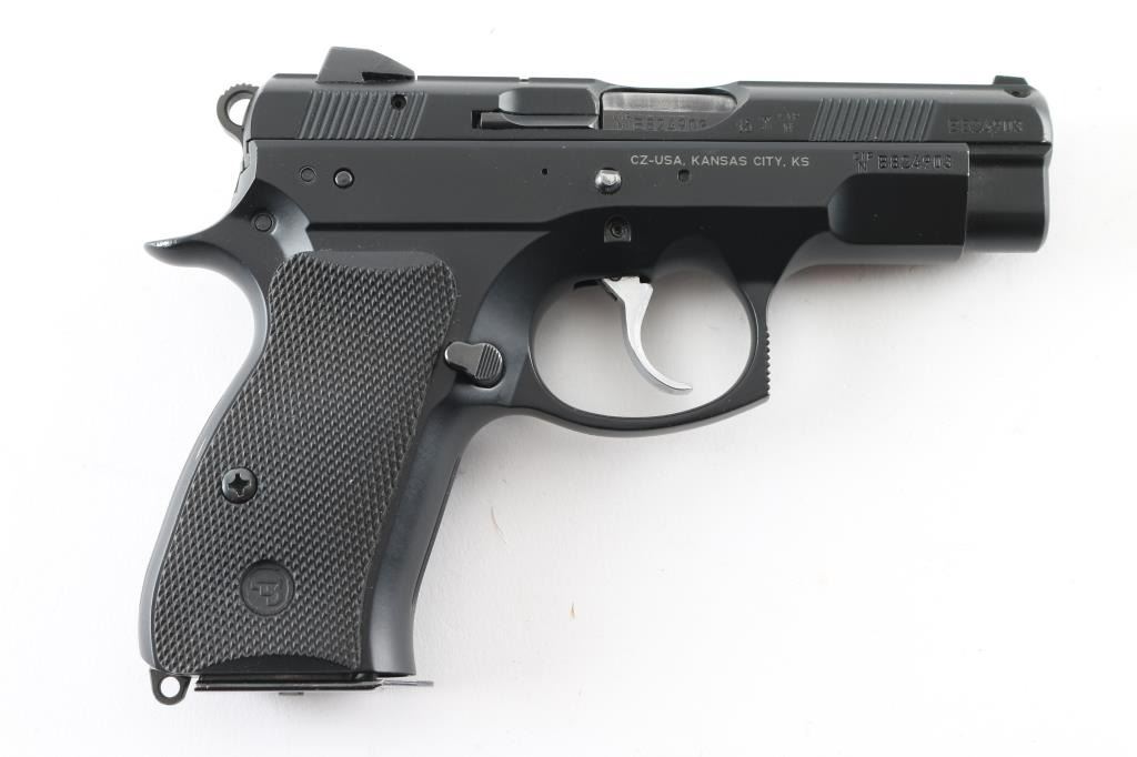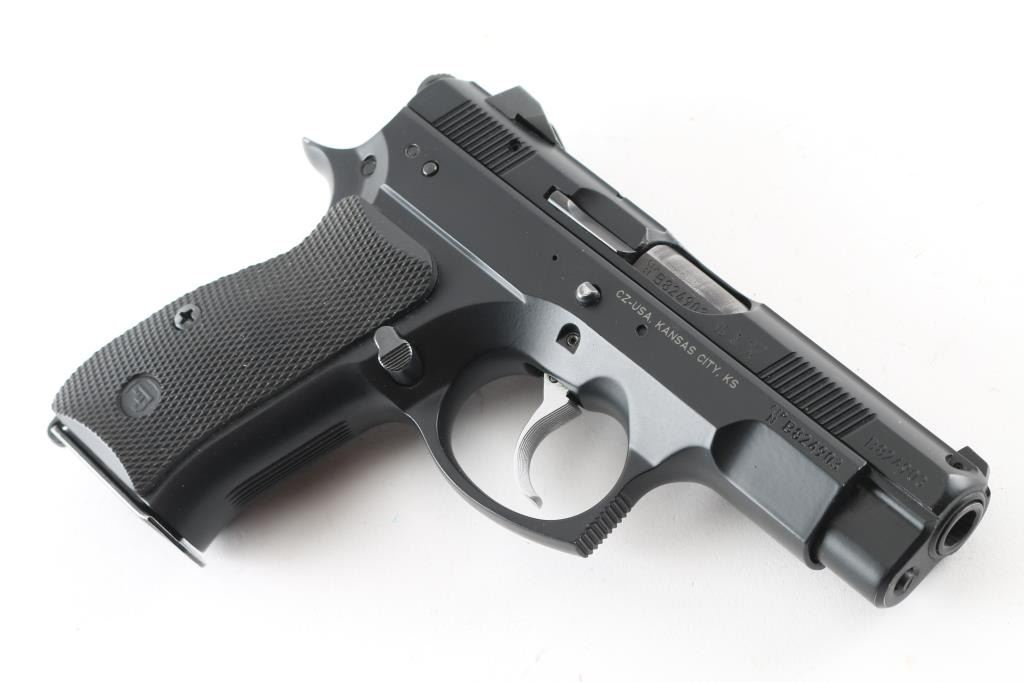 Czech made DA/SA semi-automatic compact pistol chambered in 9x19mm, circa 2015. Imported by CZ-USA of Kansas City, K.S. with import marks on the right side of the frame. Features a matte black Polycoat finish, 3.75" barrel, tritium three-dot sights with drift adjustable rear sight, serrated silver look trigger, serrated round hammer spur, firing pin block safety, thumb decocking lever, loaded chamber indicator, forged aluminum frame, push button magazine release on the right side of the frame, 14 round magazine, and two-piece checkered black rubber grips with CZ insignias. Includes a factory hard case with owners manual and lock. Bore looks great, bright. Metal finish looks great. Grips look great. Overall this gun looks almost new. Condition is NRA Excellent ***Modern Firearm***