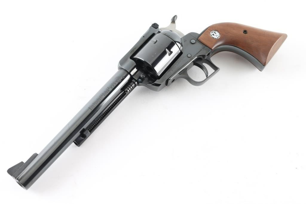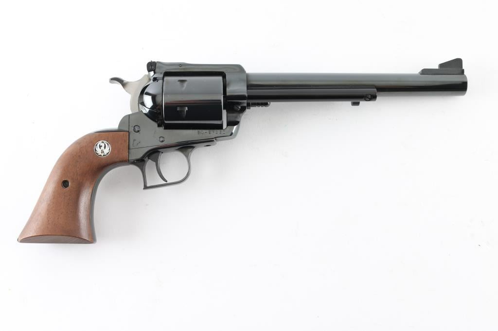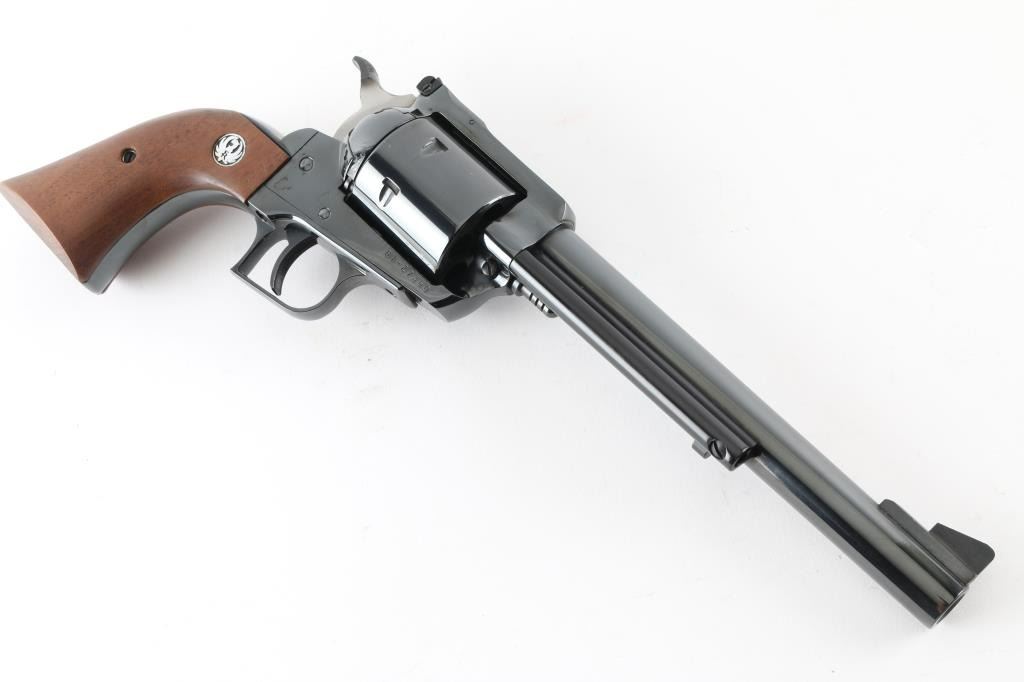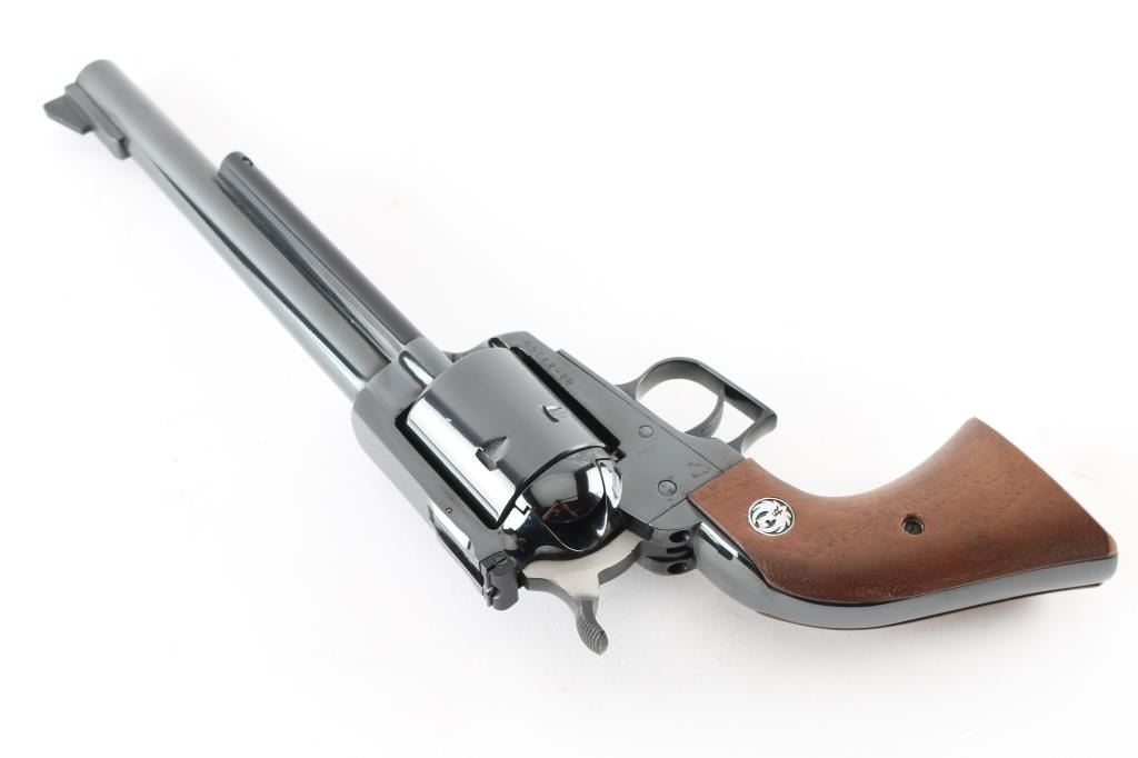 SN: 81-27360 Single action revolver manufactured circa 1974. Features blued finish, smooth wood grips with Ruger medallions, adjustable sights, 7.5" barrel, square back triggerguard, 6 shot unfluted cylinder. Bore and cylinder charge holes are in excellent condition. Retains 95% finish with minor blemishes to sides of frame near grips, light handling marks. Includes red cardboard Ruger box and plain cardboard shipping sleeve. Condition is NRA Very Good++ *** Modern Firearm ***