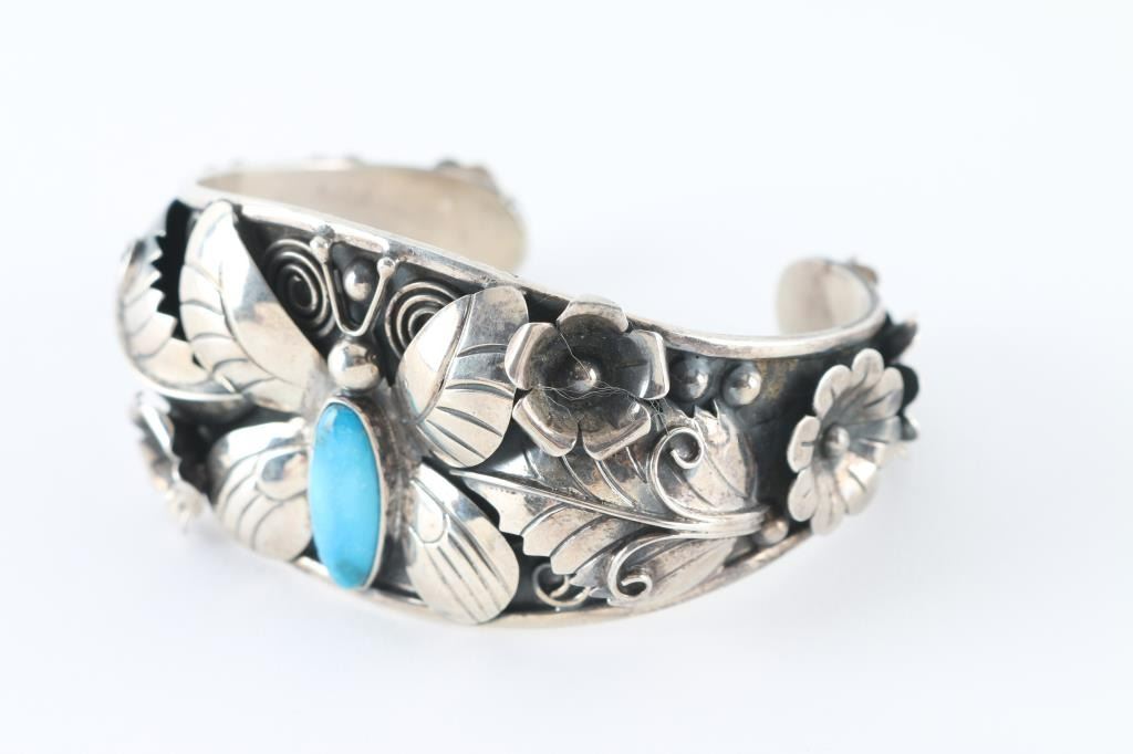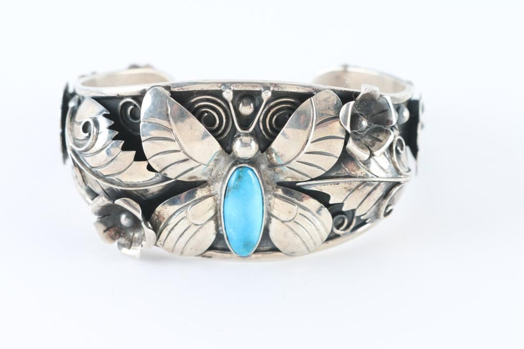All sterling sliver with butterfly motif, accented with turquoise. Stamped "DDD" and signed "Domingo" measures 7inches with 1inch gap.