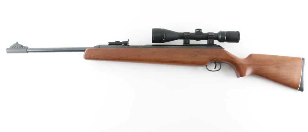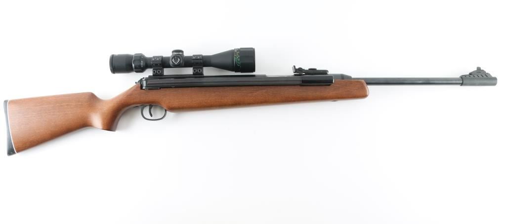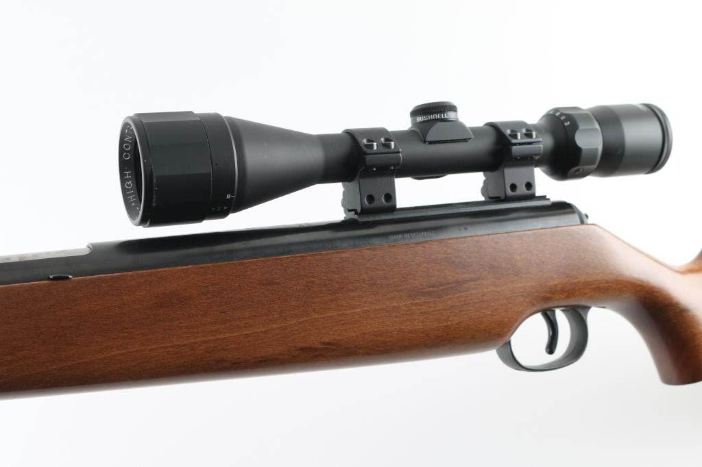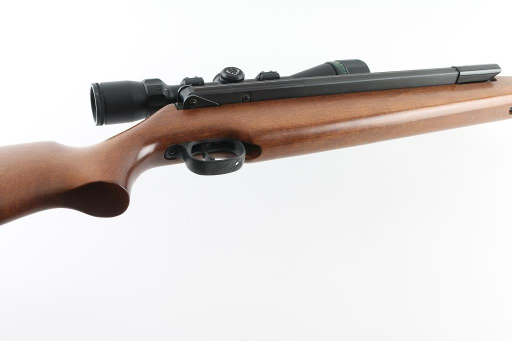 Sn: 02054923- High quality high powered German made side lever spring-piston pellet rifle chambered for 4.5mm or .177 caliber ammunition. Features a blued finish, 17.5" barrel, adjustable sights, smooth trigger, auto safety, and pistol grip beech wood stock with rubber butt pad. Comes with a Bushnell 4-12x40 scope with Adjustable Objective Parallax. LOP is 13.25". Bore looks great, bright. Metal finish looks good with some wear around the muzzle area. Wood stock looks very good with minor signs of handling. Condition is NRA Very Good